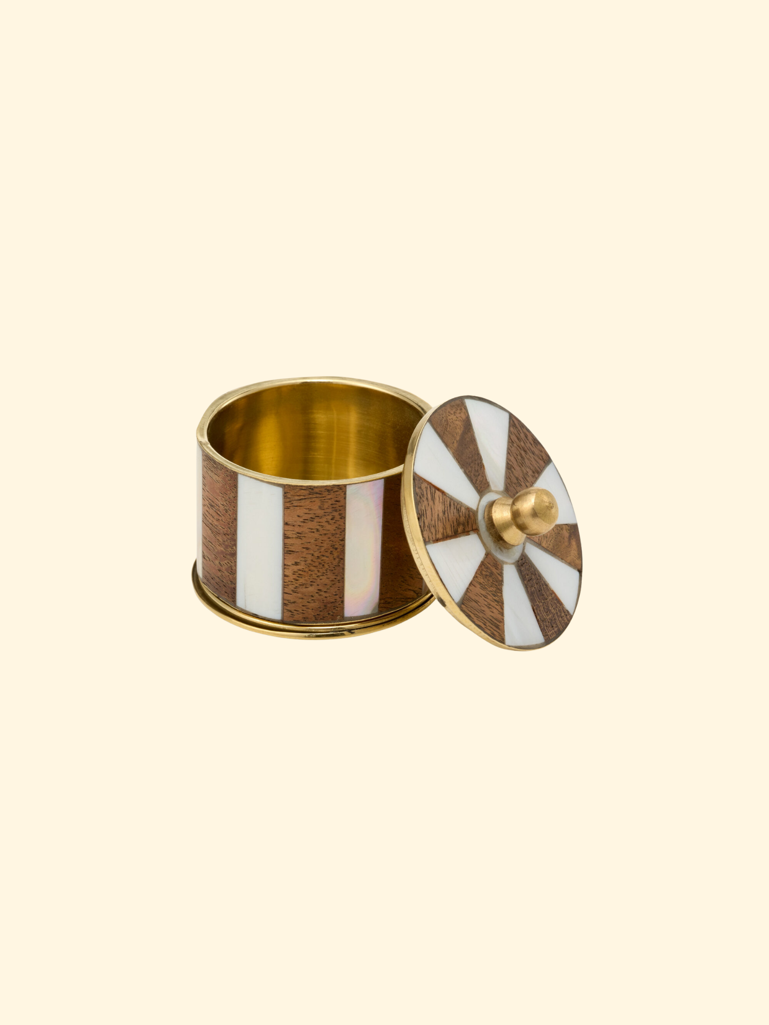 Présentation de la Boîte de Cirque Bailey Woody - un charmant mélange d'attrait rustique et de praticité. Fabriqué à la main en Inde à partir de laiton, de résine et de coquillage. Ce pièce de rangement unique est un témoignage du savoir-faire artisanal et du soutien communautaire.