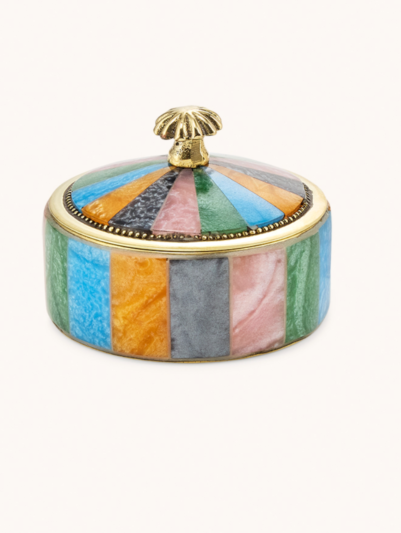Une boîte à bijoux colorée et élégante. La boîte Piper Circus moyenne est un accessoire de rangement à la fois enchanteur et ludique qui apporte une touche joyeuse et décorative à votre intérieur. Fabriquée à la main en 60 % laiton recyclé et 40 % résine, elle allie durabilité, esthétique et artisanat.