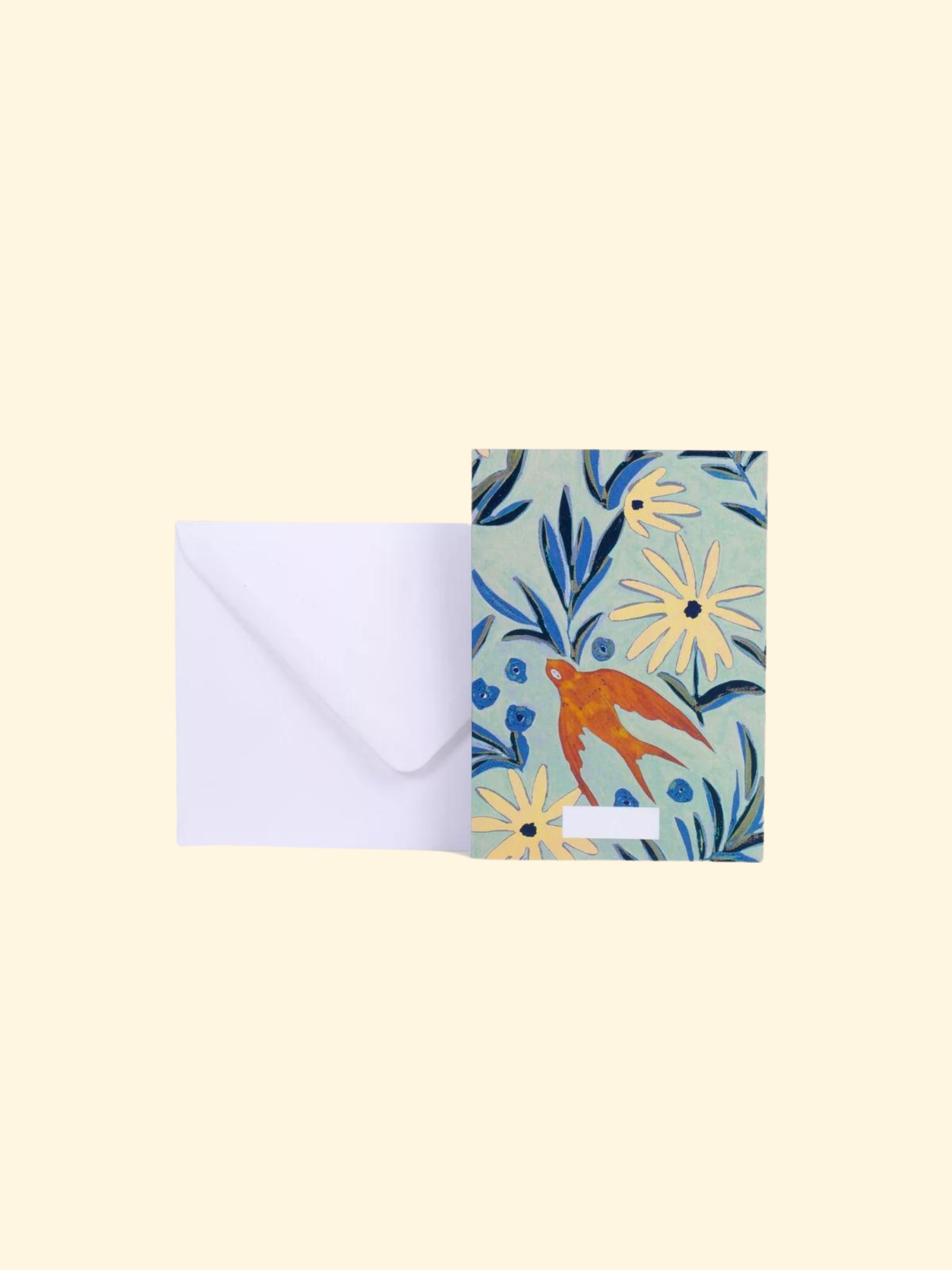 Oiseaux moutardes et feuillages bleus, une forêt onirique s'invite dans votre correspondance. Notre carte à message Envolée Lavande n'attends plus que vos jolis mots.