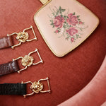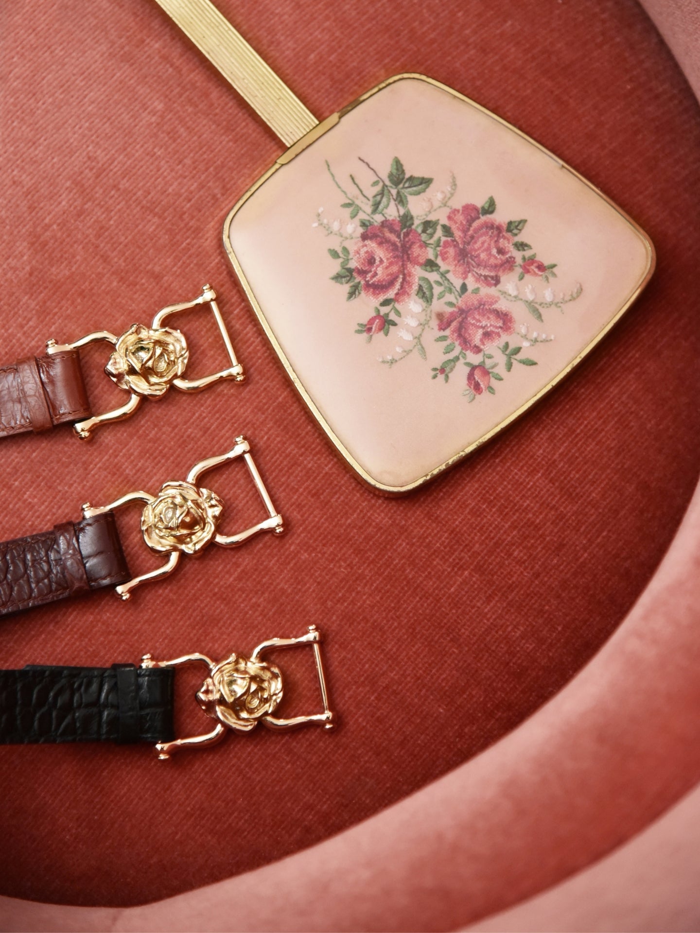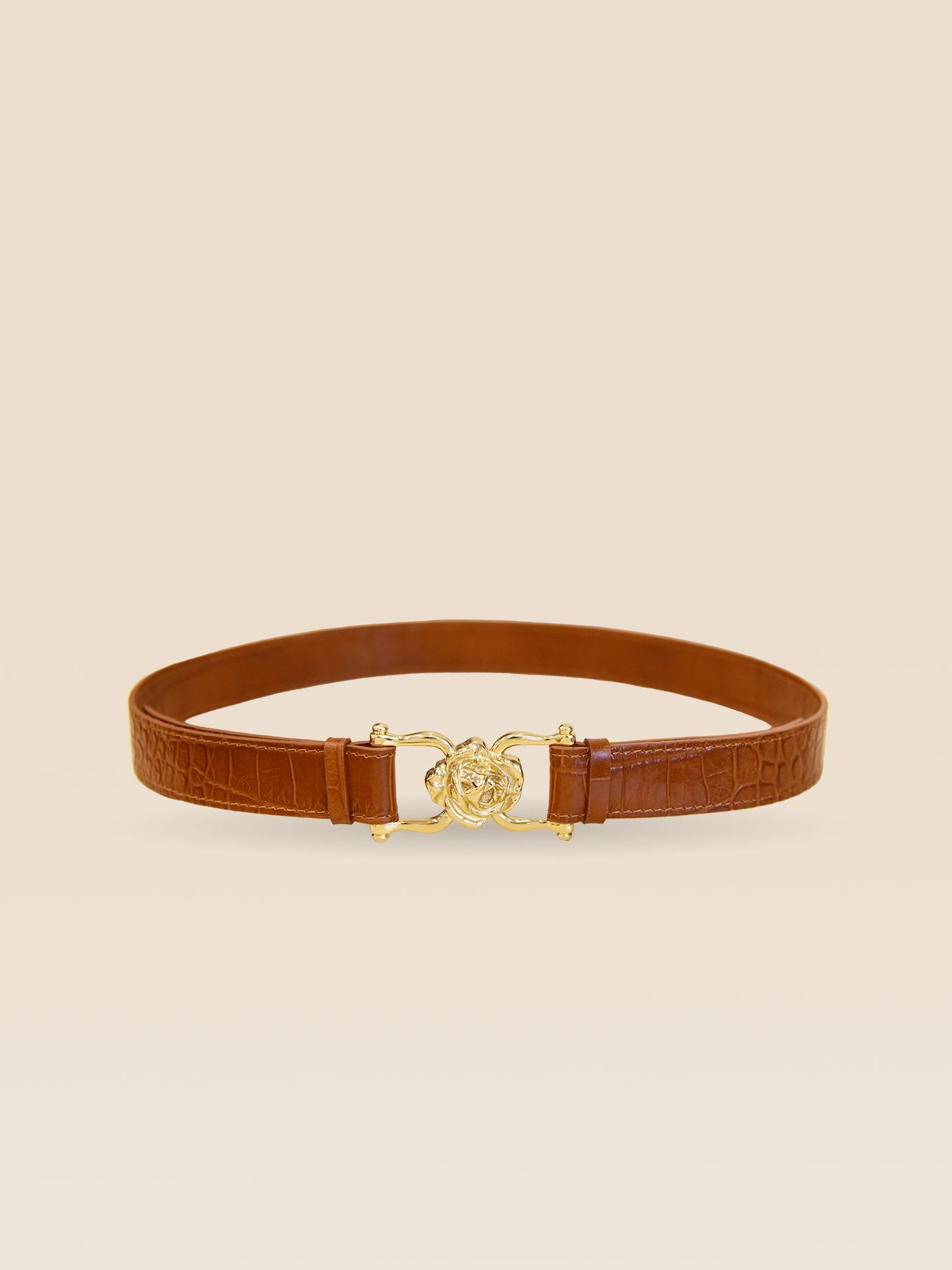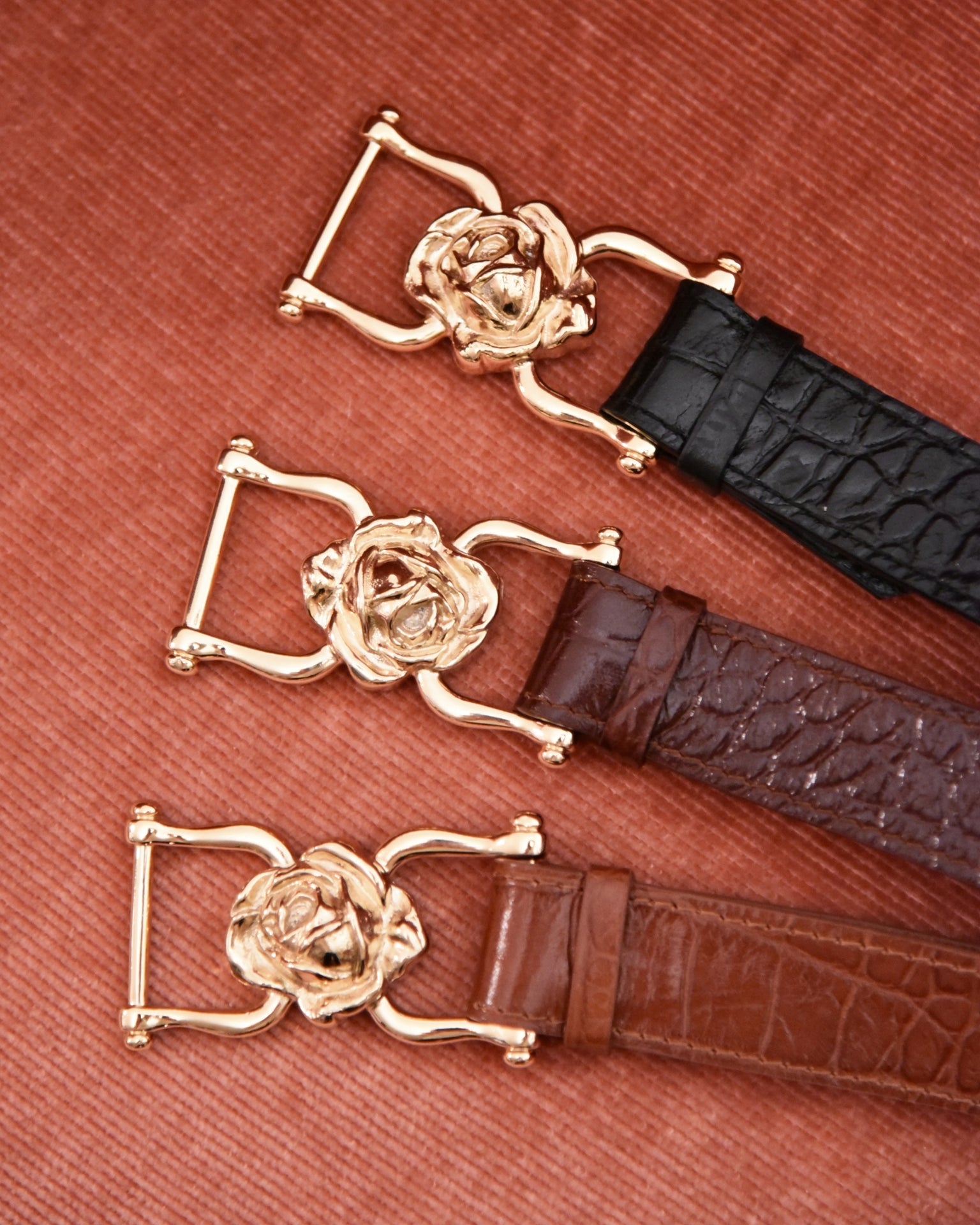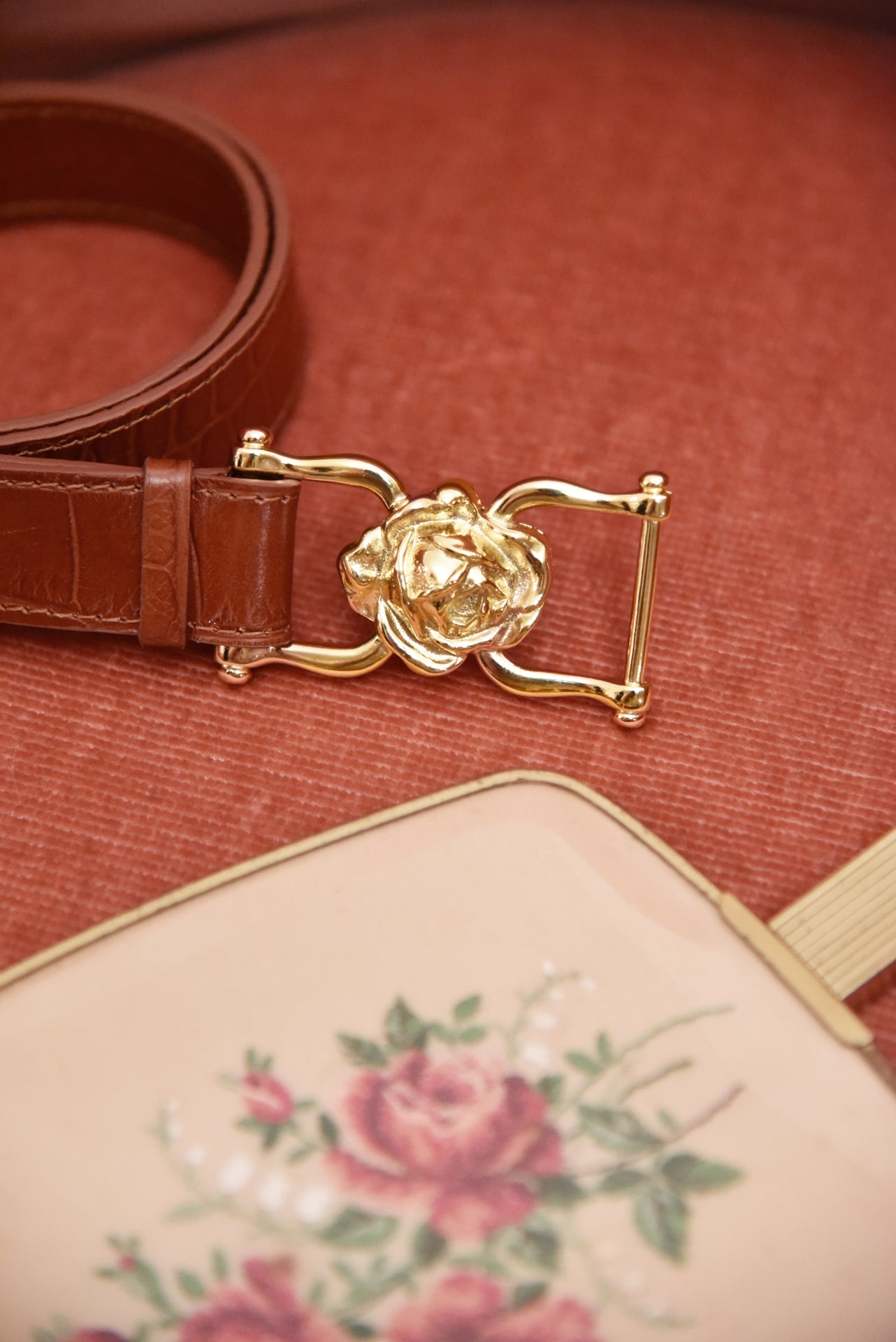 Ceinture en cuir de vachette embossé croco et rose dorée à l'or fin