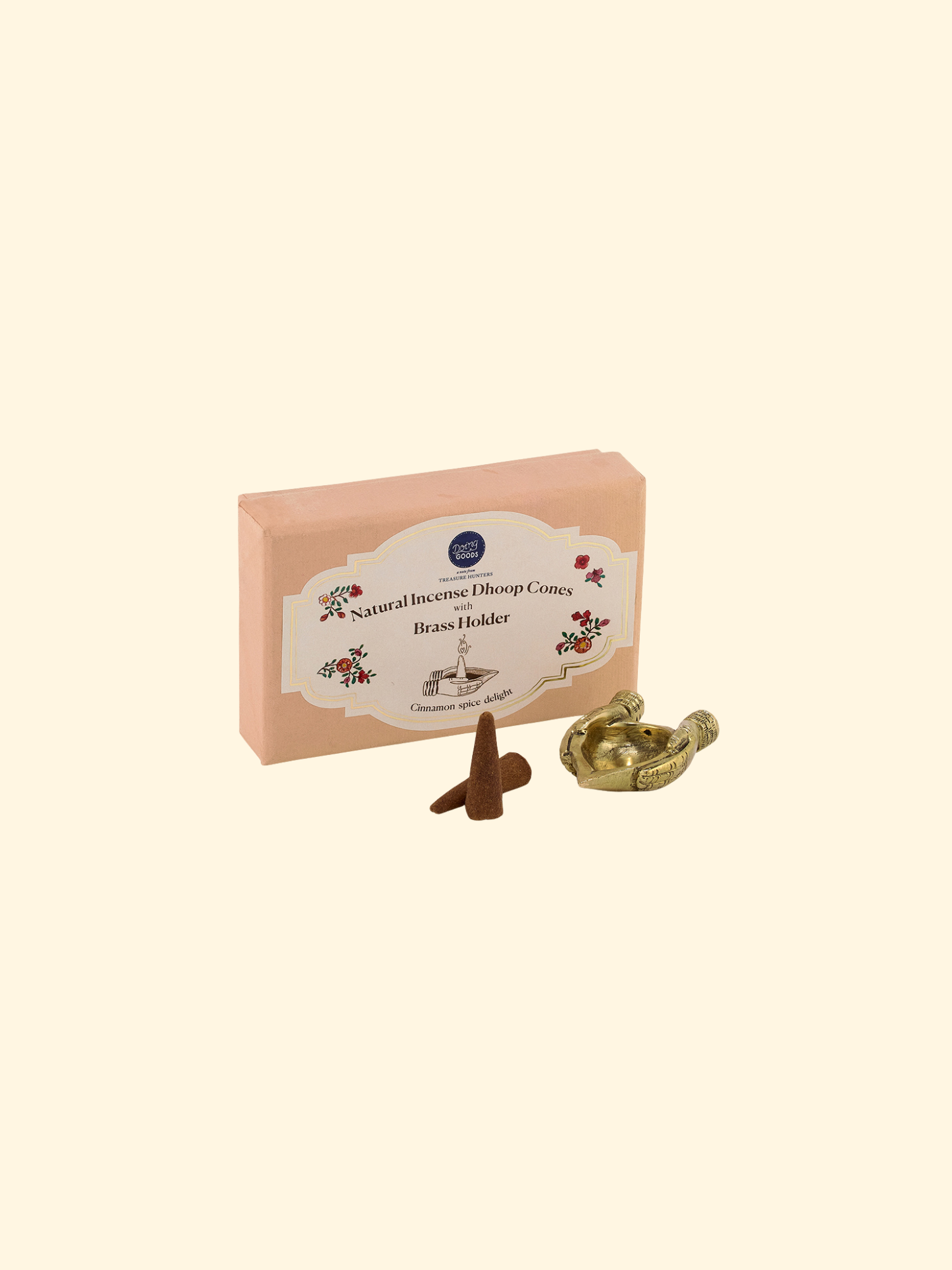Découvrez la chaleur et le parfum invitant de notre Coffret Cadeau Cônes d'Encens Cannelle. Cet ensemble charmant comprend un porte-encens en cône magnifiquement conçu en laiton recyclé, en forme de deux mains tenant délicatement un bol, accompagné de 20 cônes d'encens parfumés à la cannelle et recyclés à partir de fleurs. Fabriqué avec soin par nos artisans qualifiés en Inde, cet ensemble-cadeau est parfait pour créer une atmosphère chaleureuse et parfumée dans votre maison.