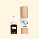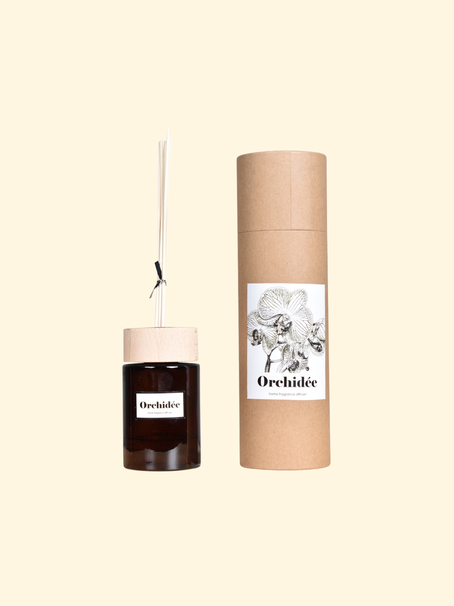 Diffuseur de parfum avec sticks. Le pot est en verre ambre avec un couvercle en bois. 8% fragrance orchidée. Retirer le nœud reliant les sticks pour faciliter l’évaporation du produit. Une fois les tiges de rotin insérées dans le flacon, attendre 48 heures pour une bonne diffusion du parfum. Remuer les tiges de temps en temps pour accentuer la senteur.