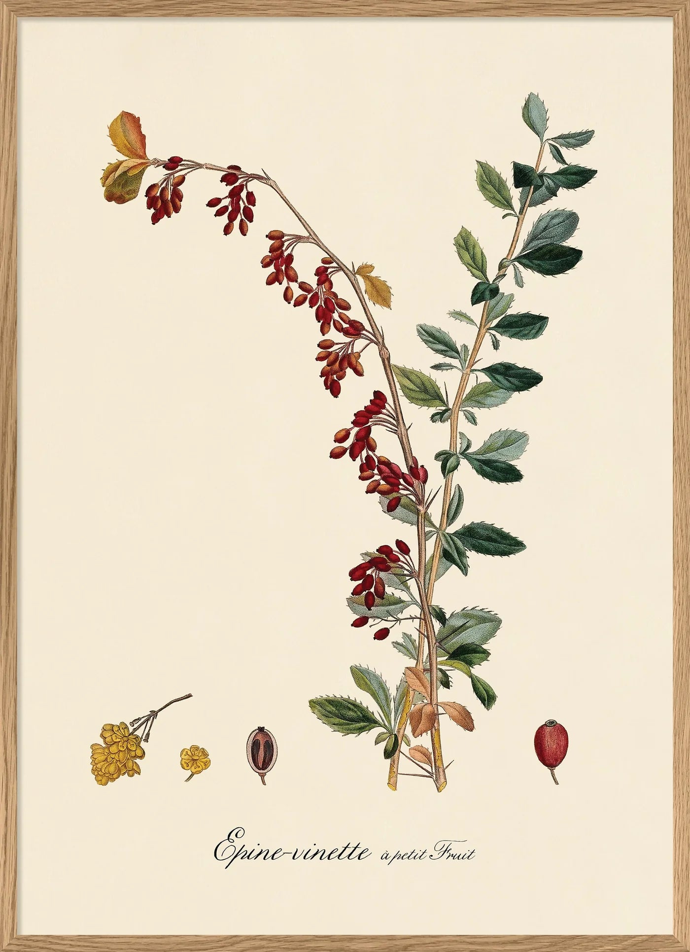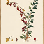 Cette affiche encadrée représente une illustration botanique vintage de l'épine-vinette à petit fruit, également connue sous le nom de Berberis microphylla.