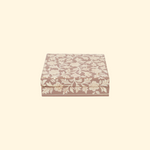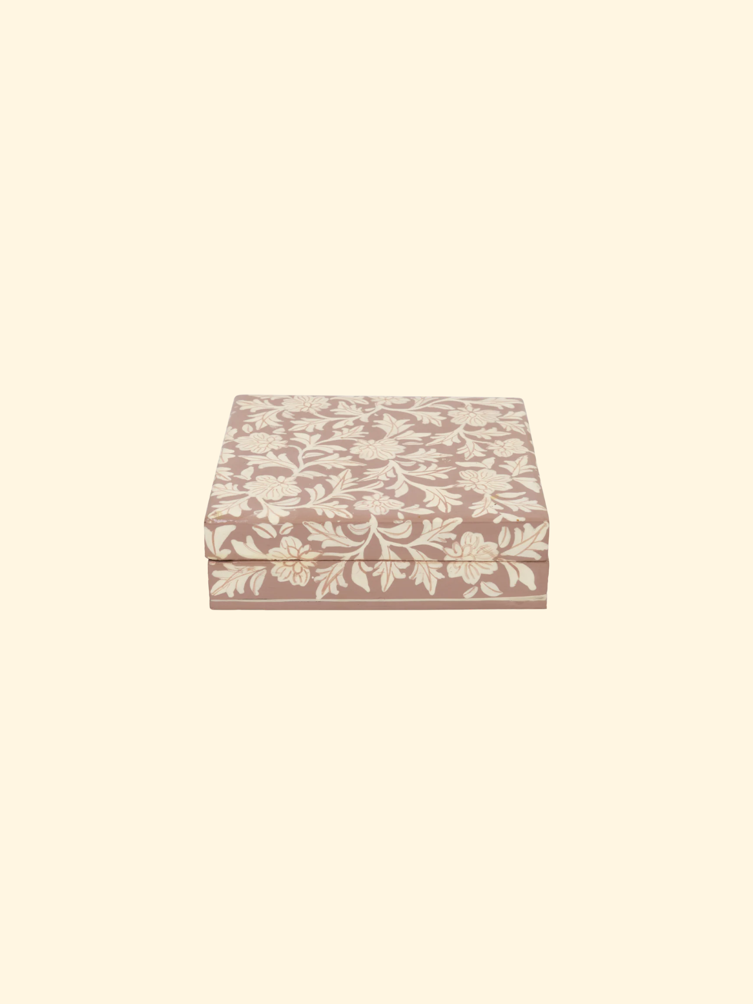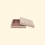 Cette boîte carrée à imprimé floral lilas est fabriquée à la main à partir de papier mâché. La fabrication et l'imprimé floral peint à la main sont réalisés par d'incroyables artisans et femmes en Inde.