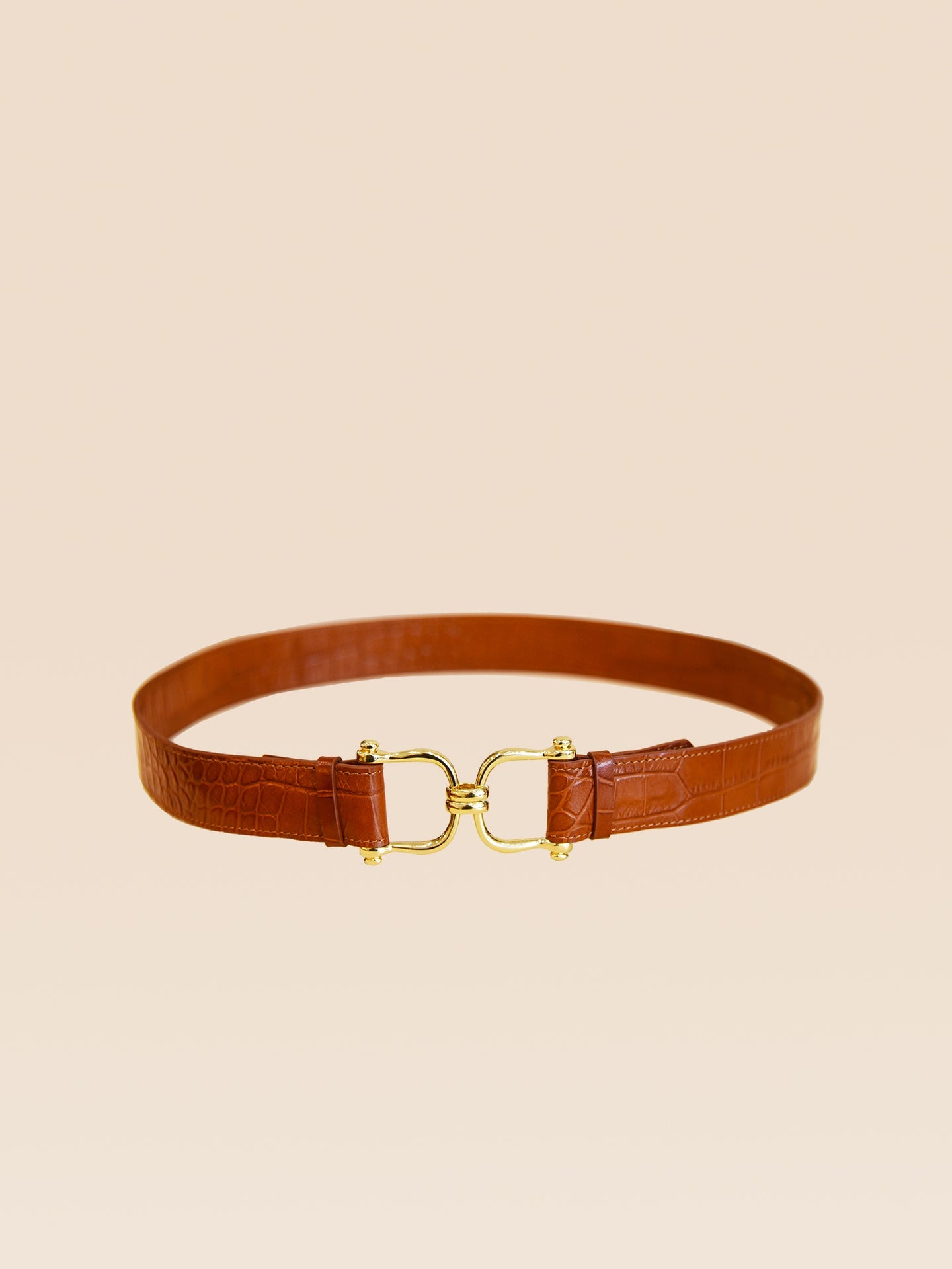 Ceinture en cuir de vachette embossé croco à tannage minéral et boucle en dé dorée à l'or fin inspirée des anneaux utilisées pour l'équitation.
