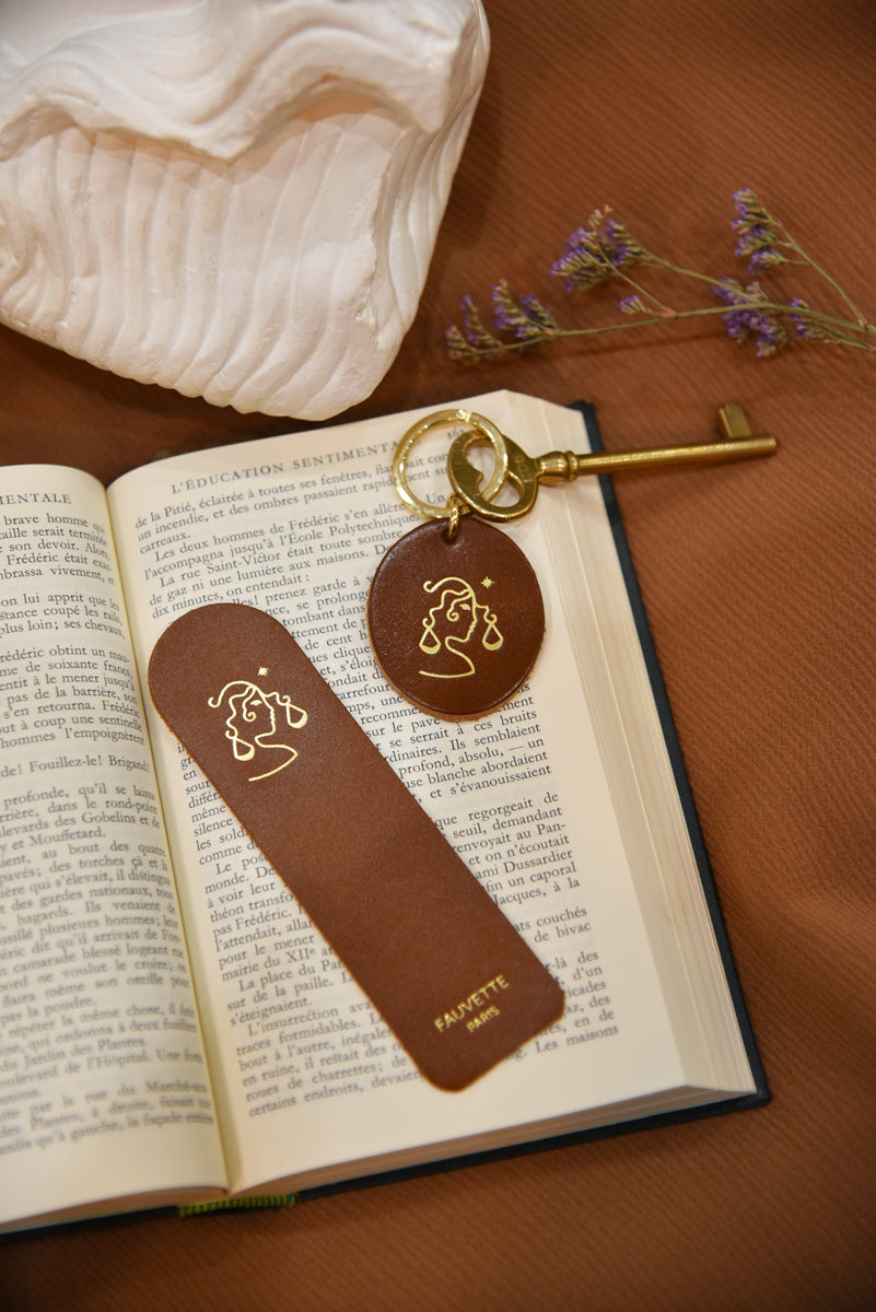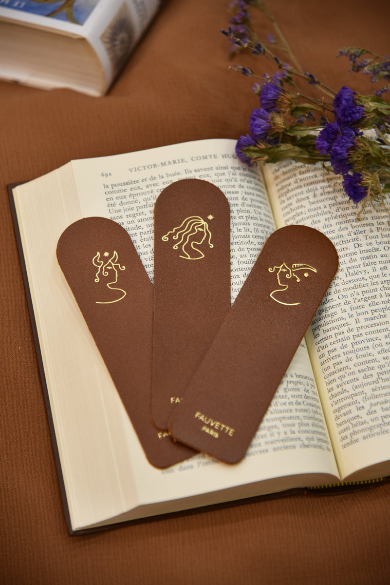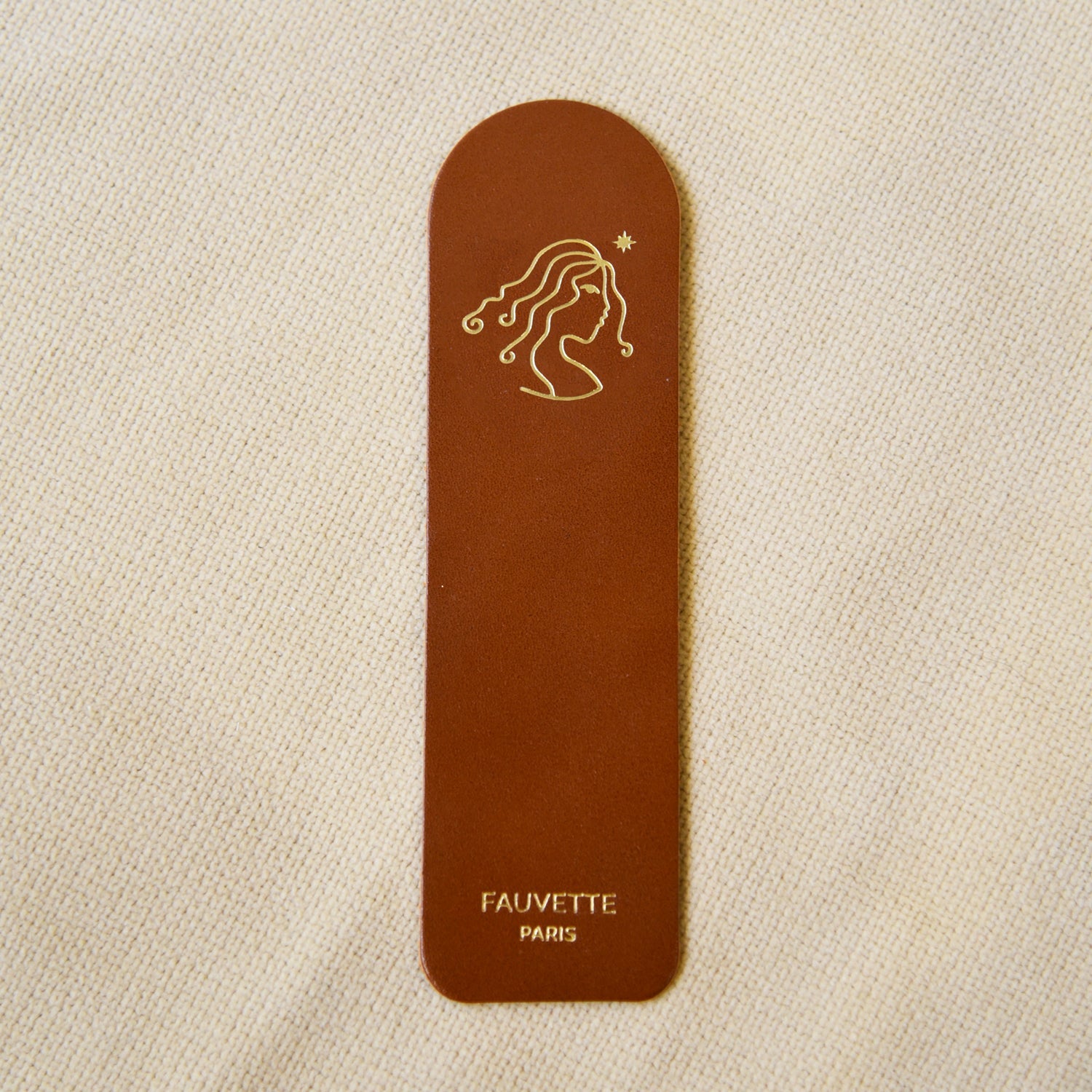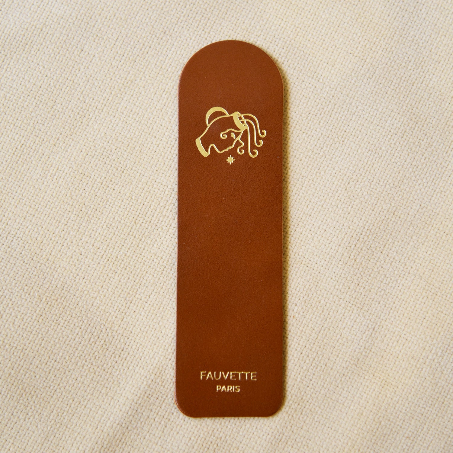 Marque-page en cuir tannage végétal, illustration signe astrologique dorée à chaud dans notre atelier parisien
