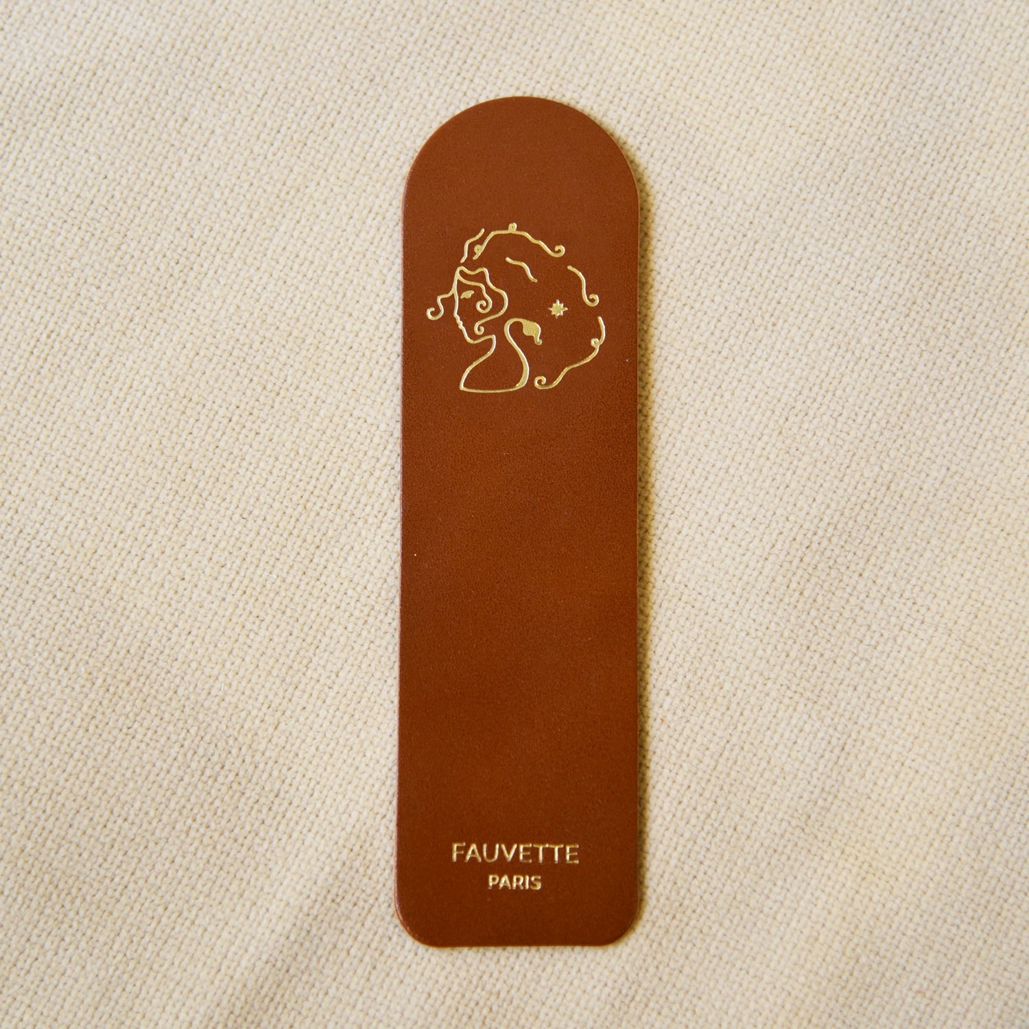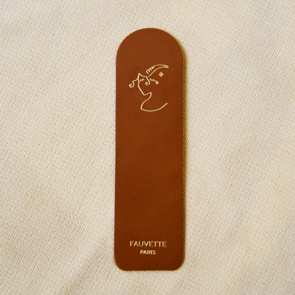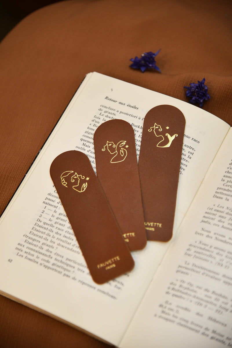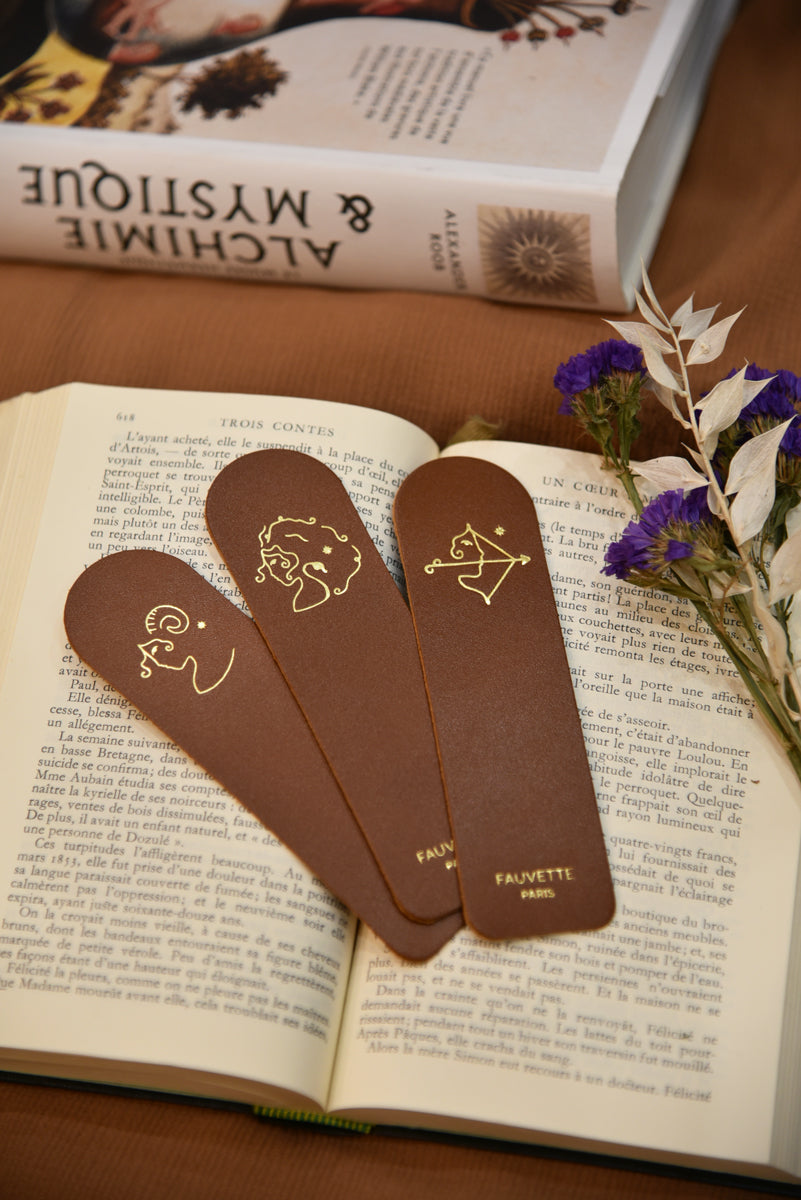 Marque-page en cuir tannage végétal, illustration signe astrologique dorée à chaud dans notre atelier parisien