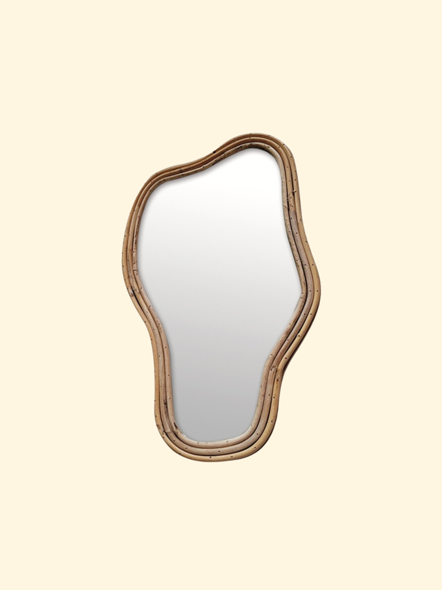 Ce miroir unique, fabriqué à la main avec des matériaux naturels, présente une forme fluide et irrégulière qui évoque les contours de la nature. Son cadre en bois offre une touche de chaleur et d'authenticité, tandis que sa surface réfléchissante agrandit l'espace et illumine votre pièce.