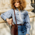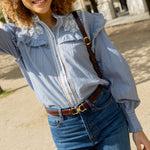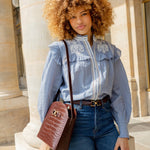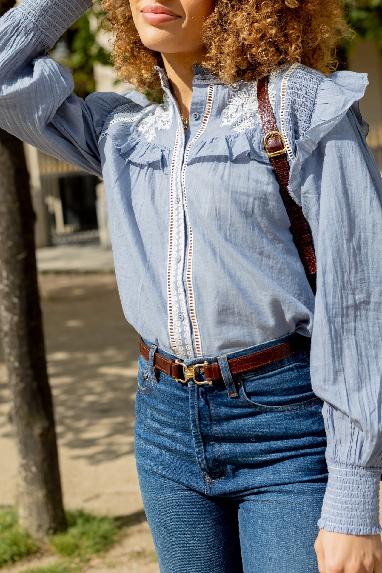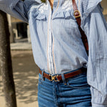 Ceinture en cuir de vachette embossé croco à tannage minéral et boucle en dé dorée à l'or fin inspirée des anneaux utilisées pour l'équitation.