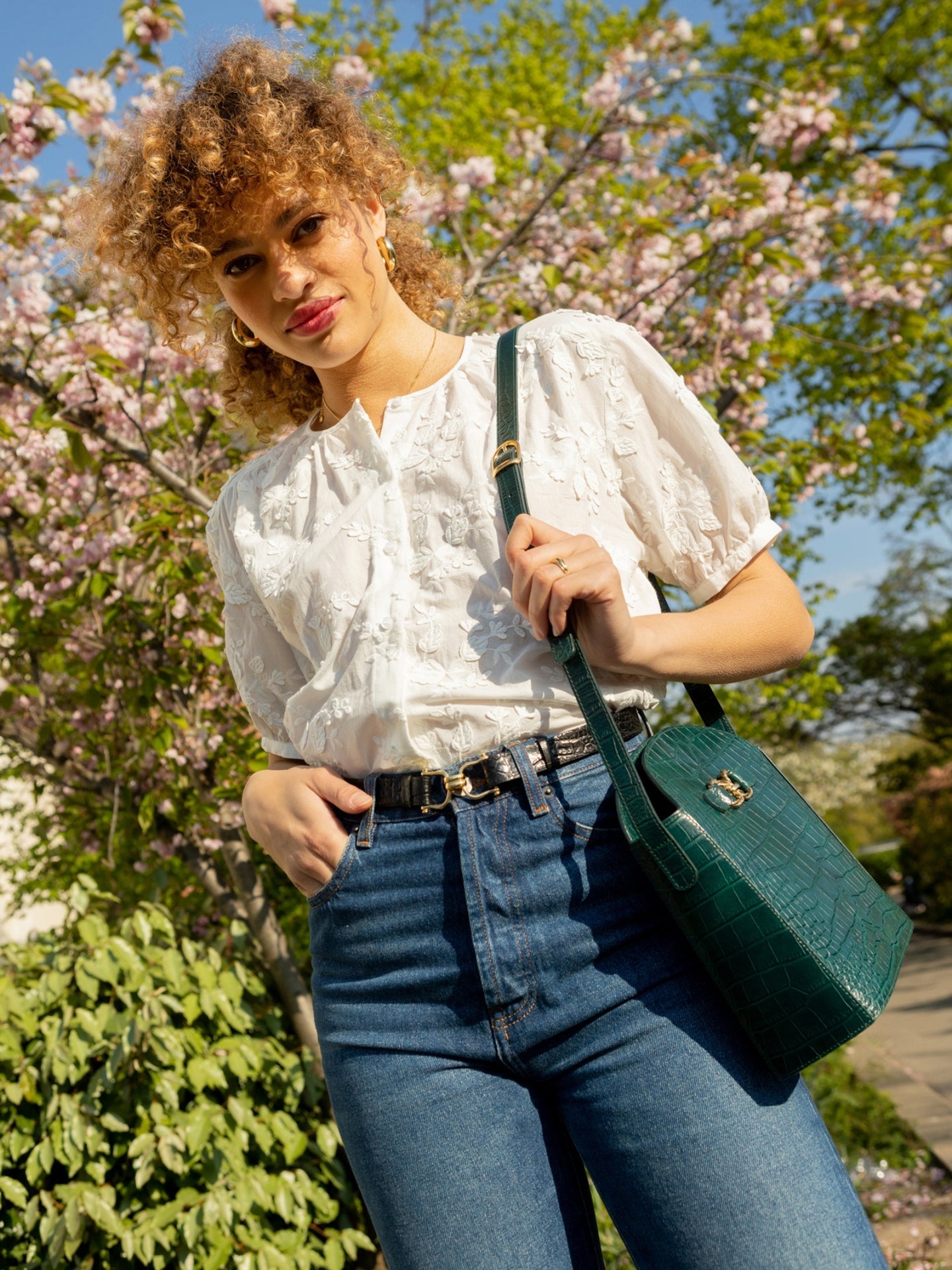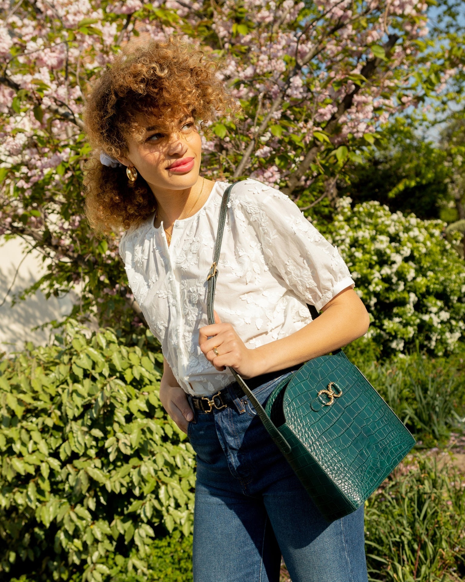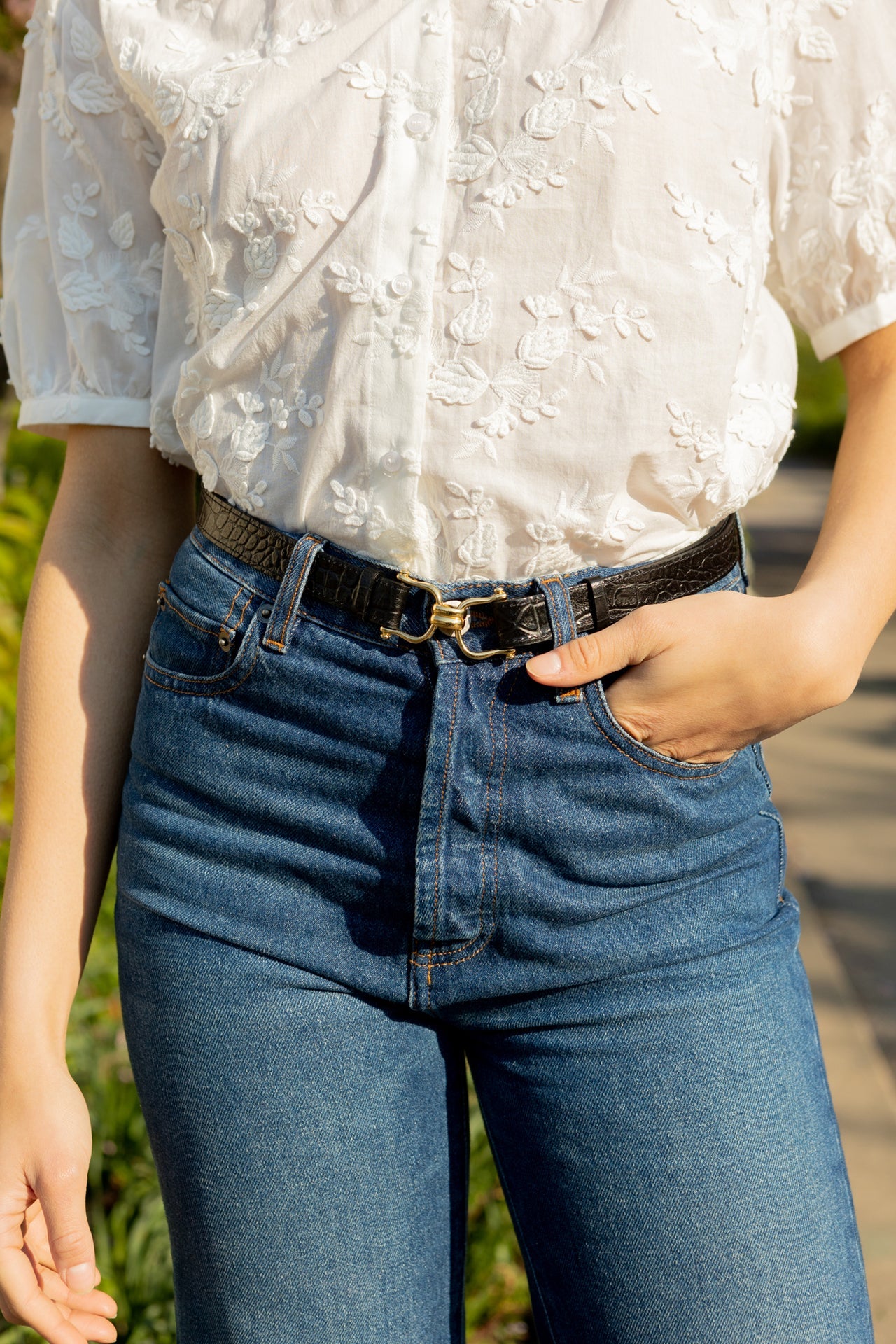 Ceinture en cuir de vachette embossé croco à tannage minéral et boucle en dé dorée à l'or fin inspirée des anneaux utilisées pour l'équitation.