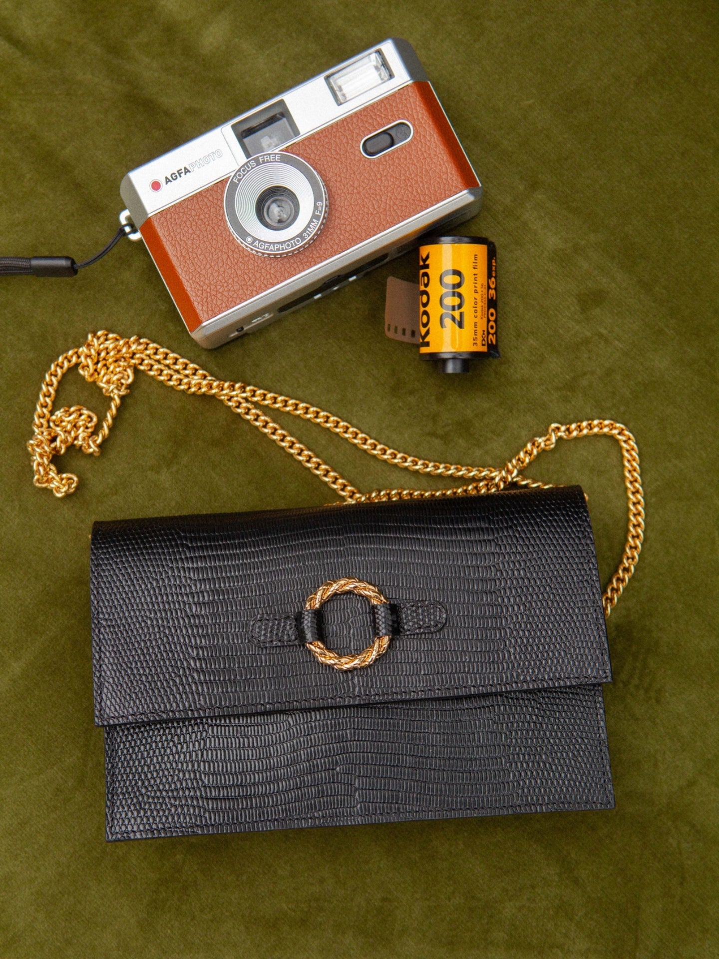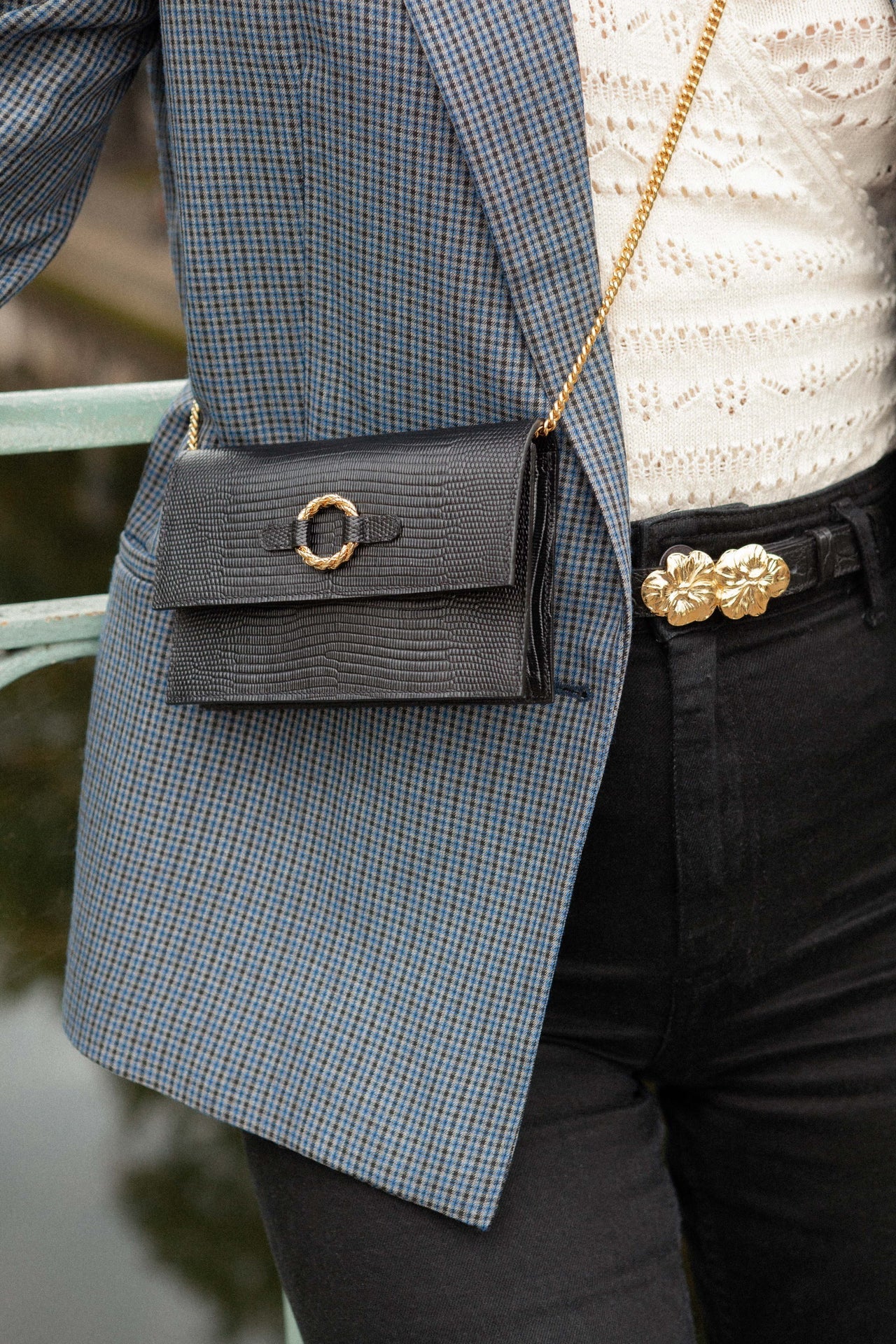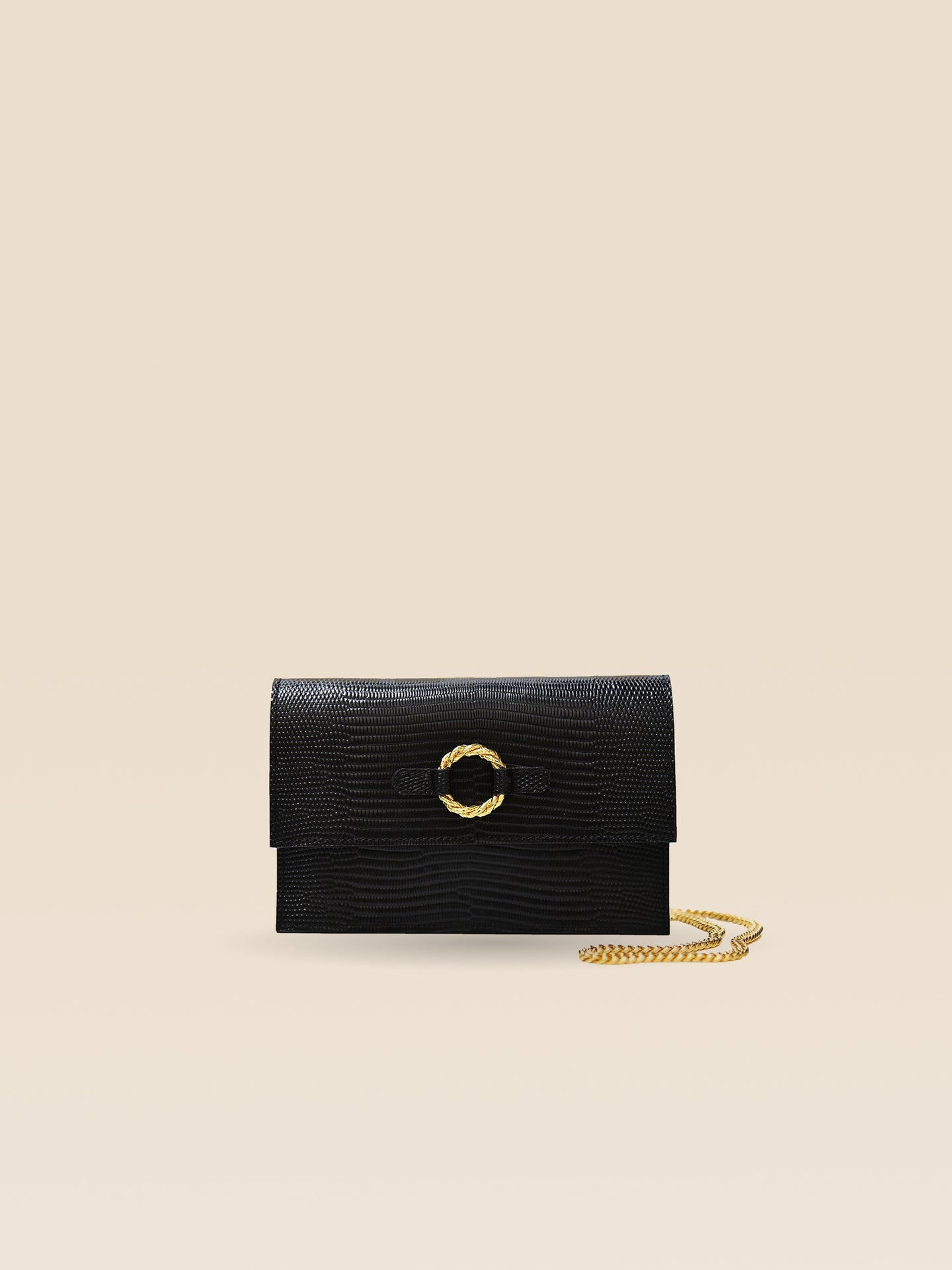 Pochette en cuir de vachette embossé lézard à tannage minéral et anneau torsadé doré à l’or