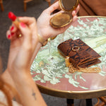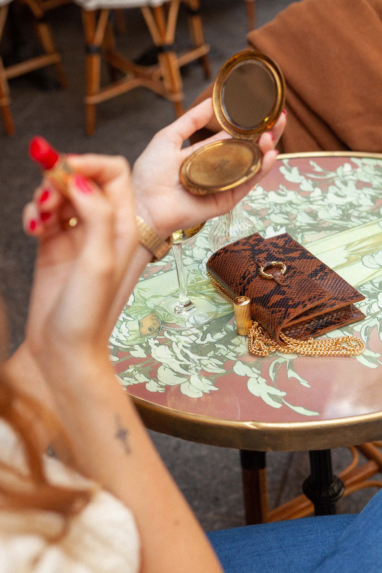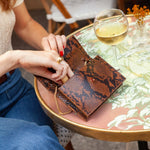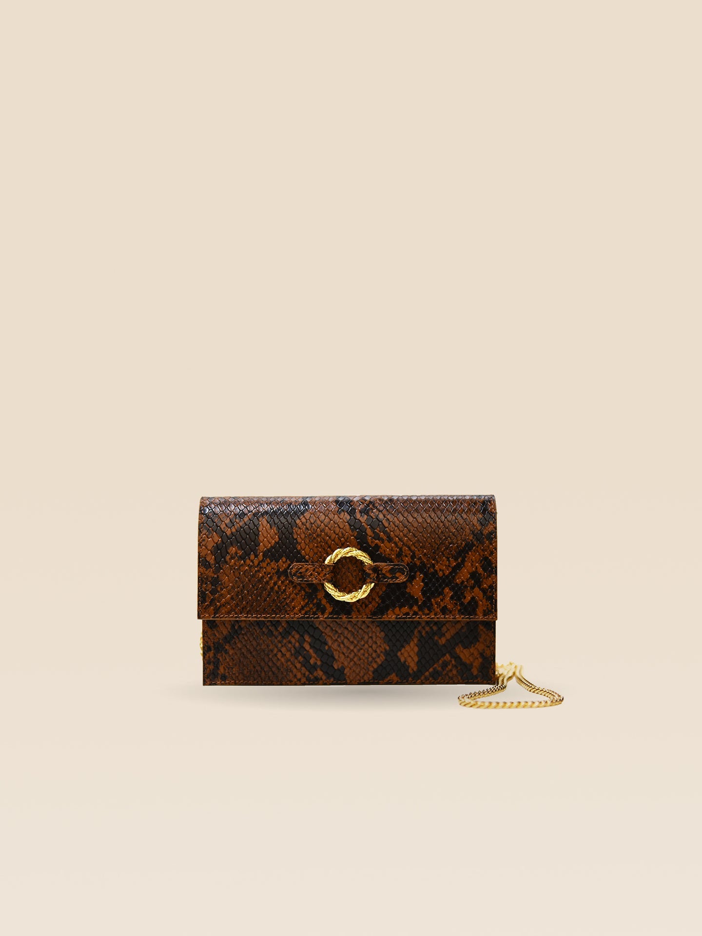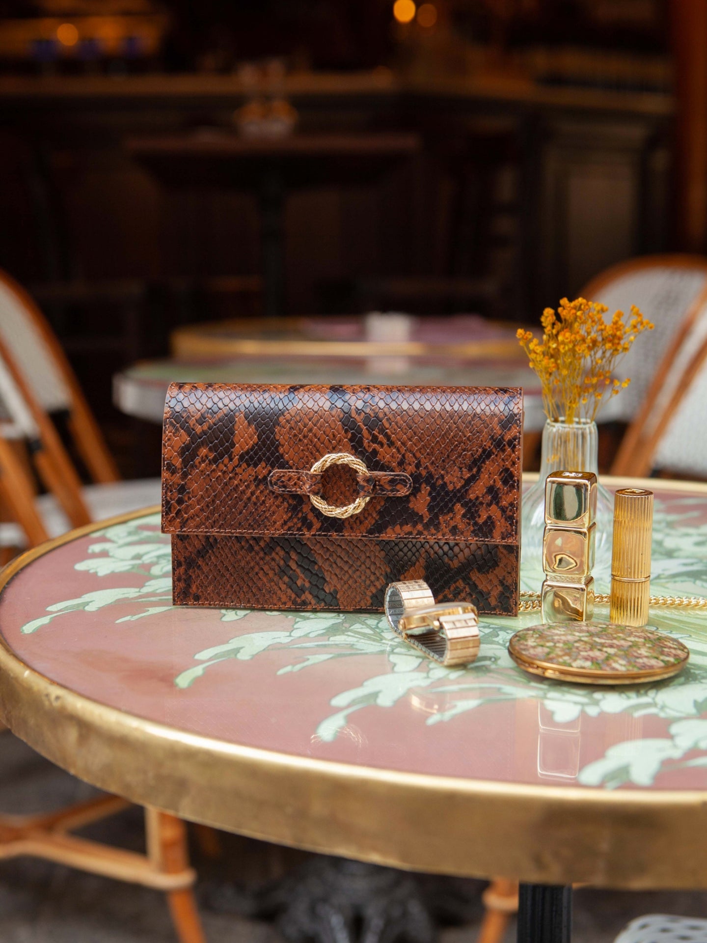 Pochette en cuir de vachette embossé python à tannage minéral et anneau torsadé doré à l’or