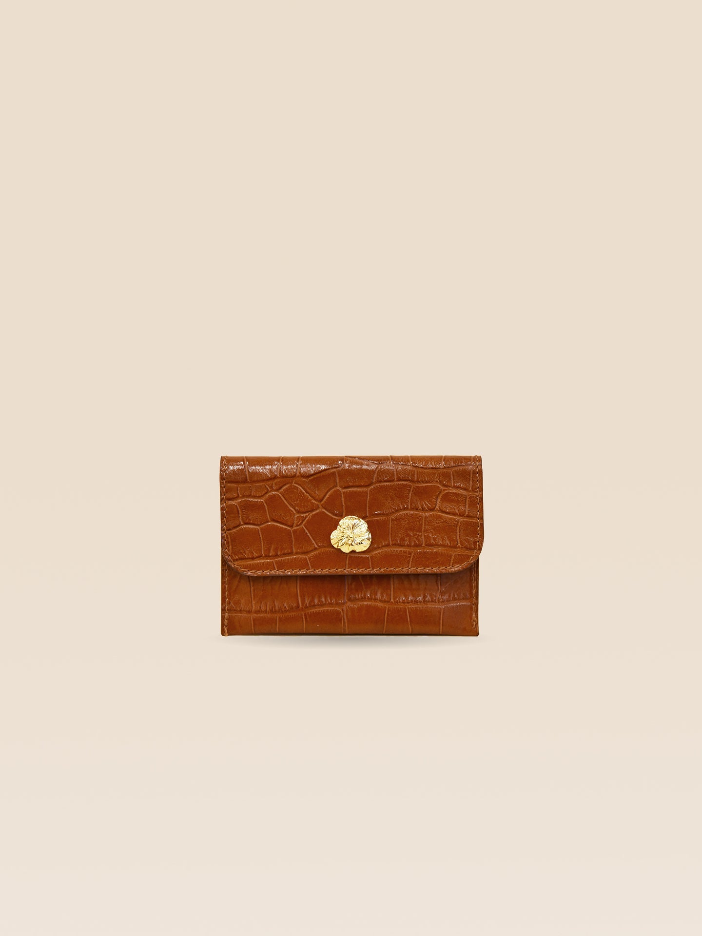 Porte-cartes en cuir de vachette embossé croco et fleur dorée à l’or fin