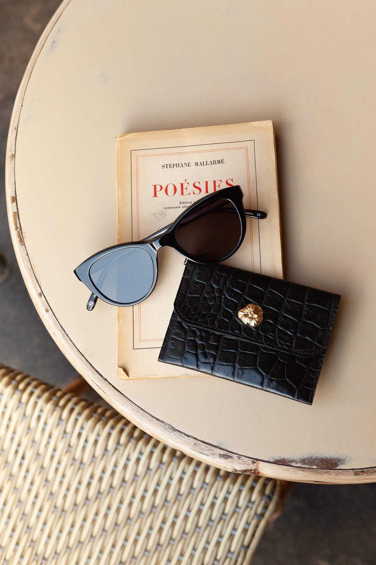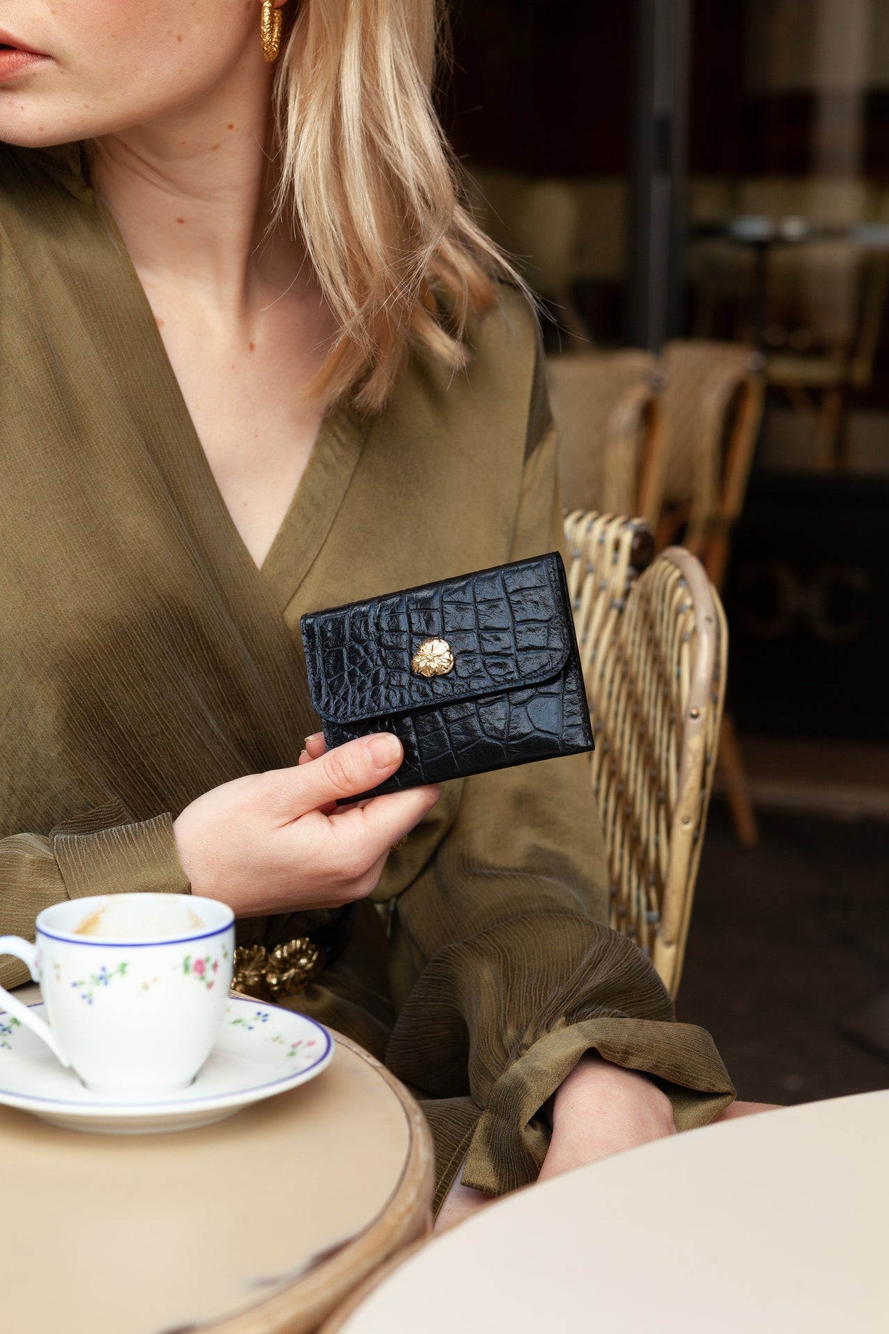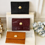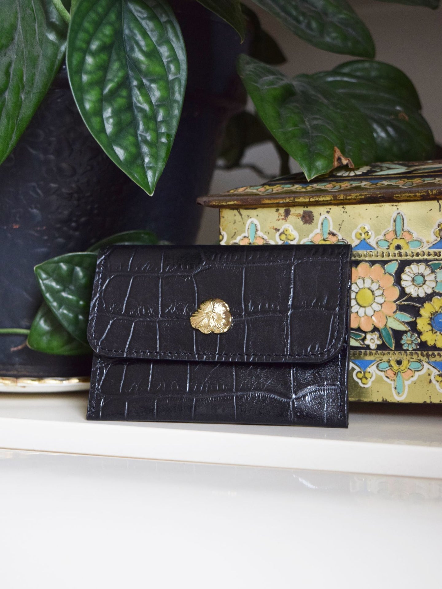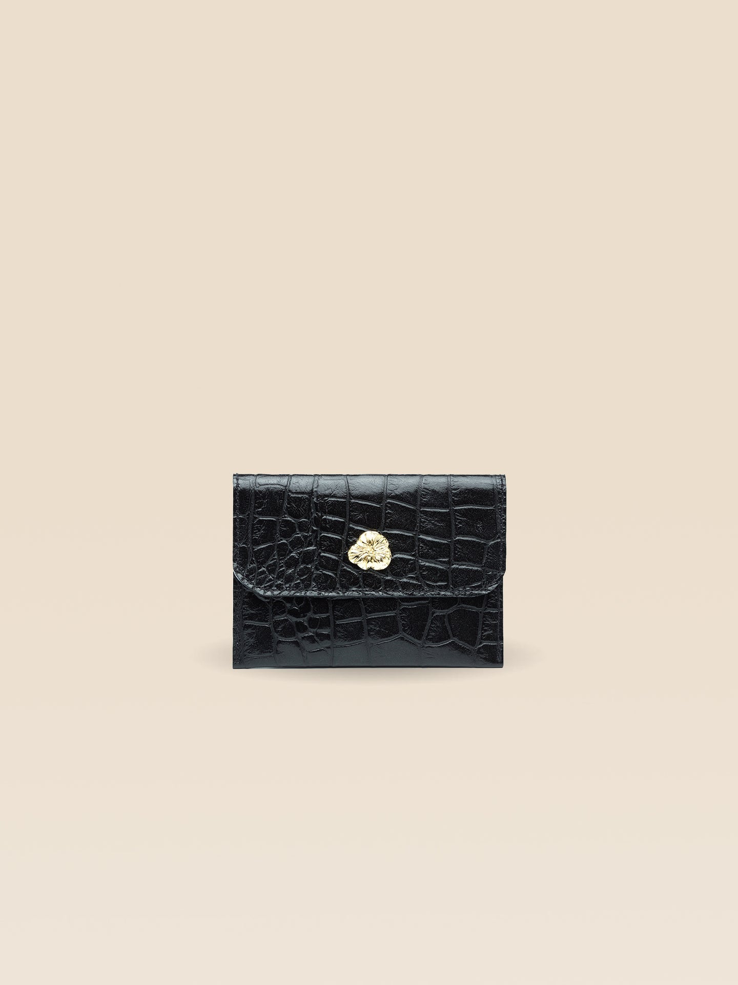 Porte-cartes en cuir de vachette embossé croco et fleur dorée à l’or fin