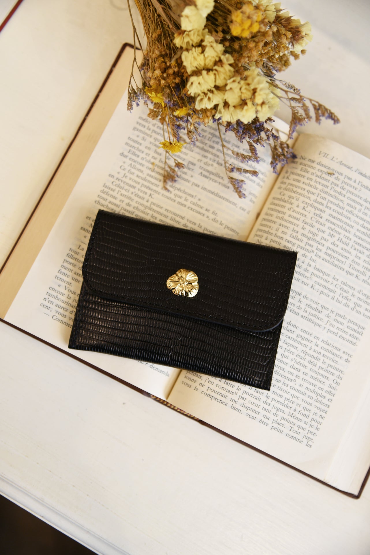 Porte-cartes en cuir de vachette embossé lézard et fleur dorée à l’or fin