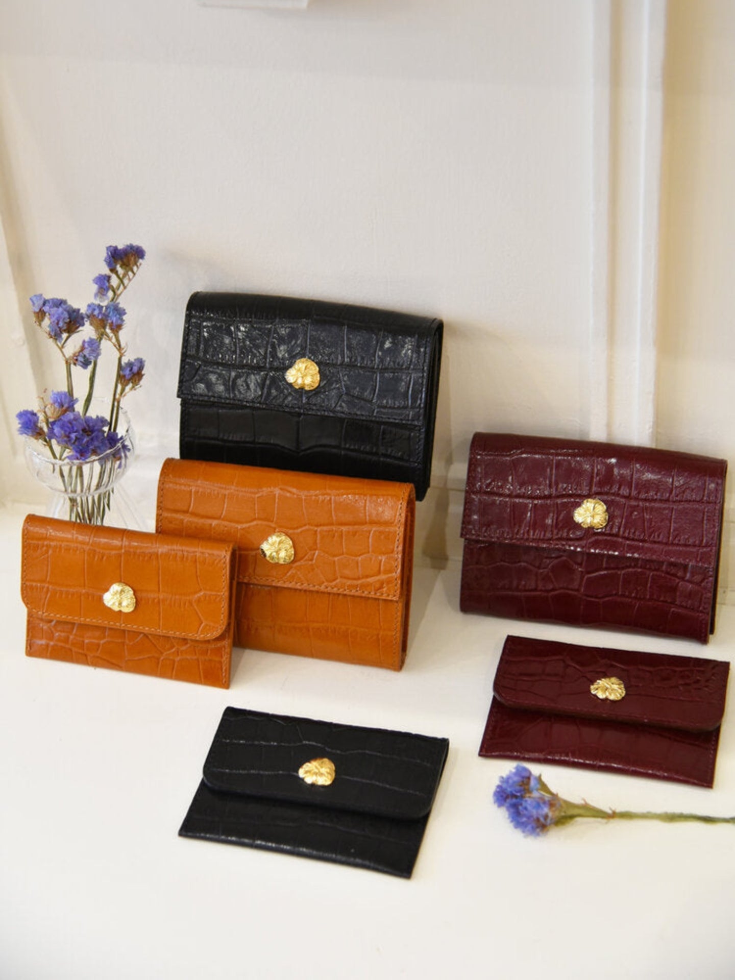 Portefeuille en cuir de vachette embossé croco et fleur dorée à l’or fin