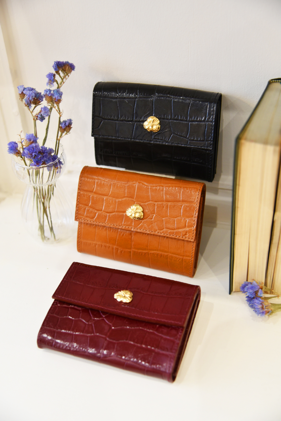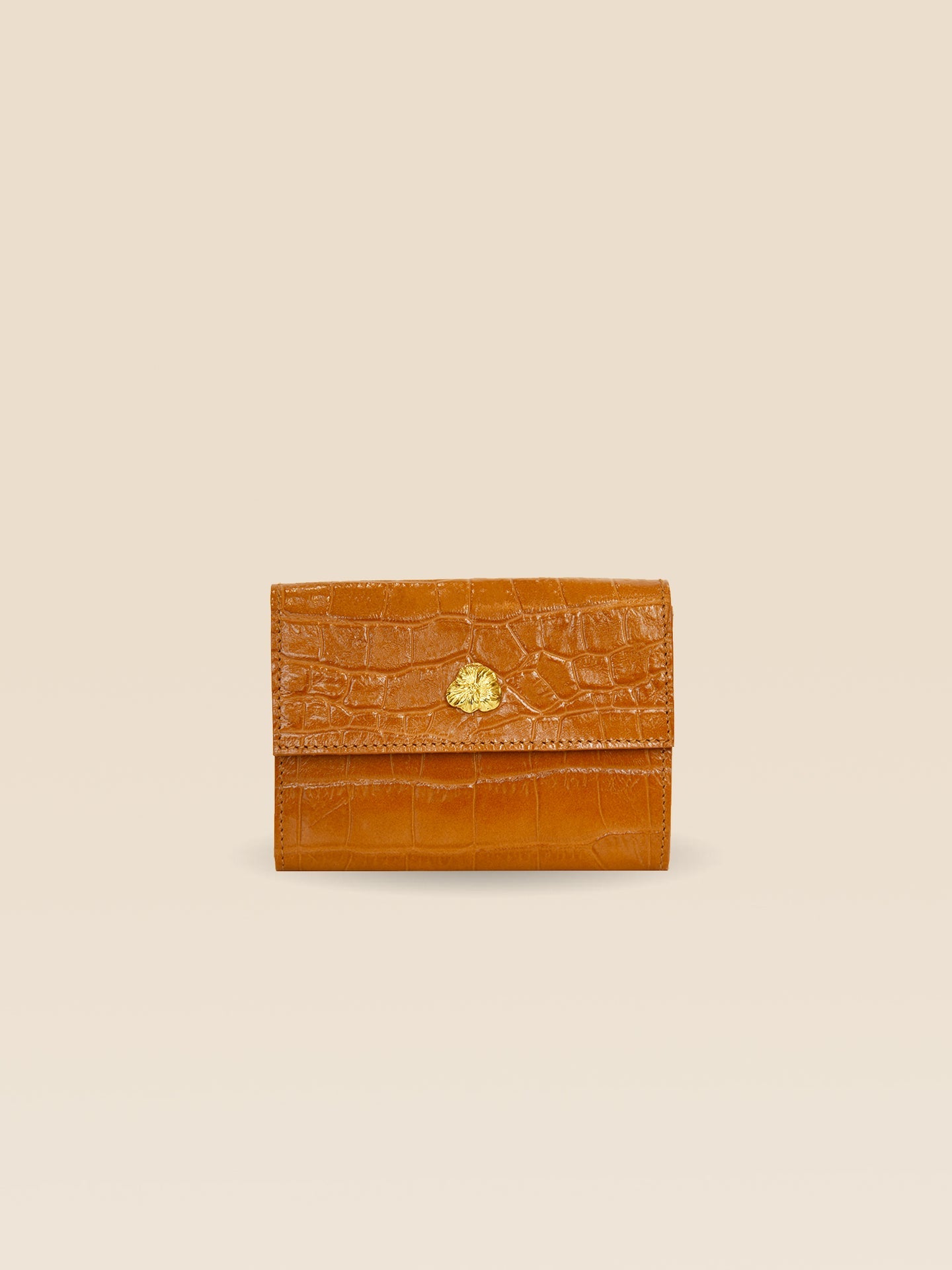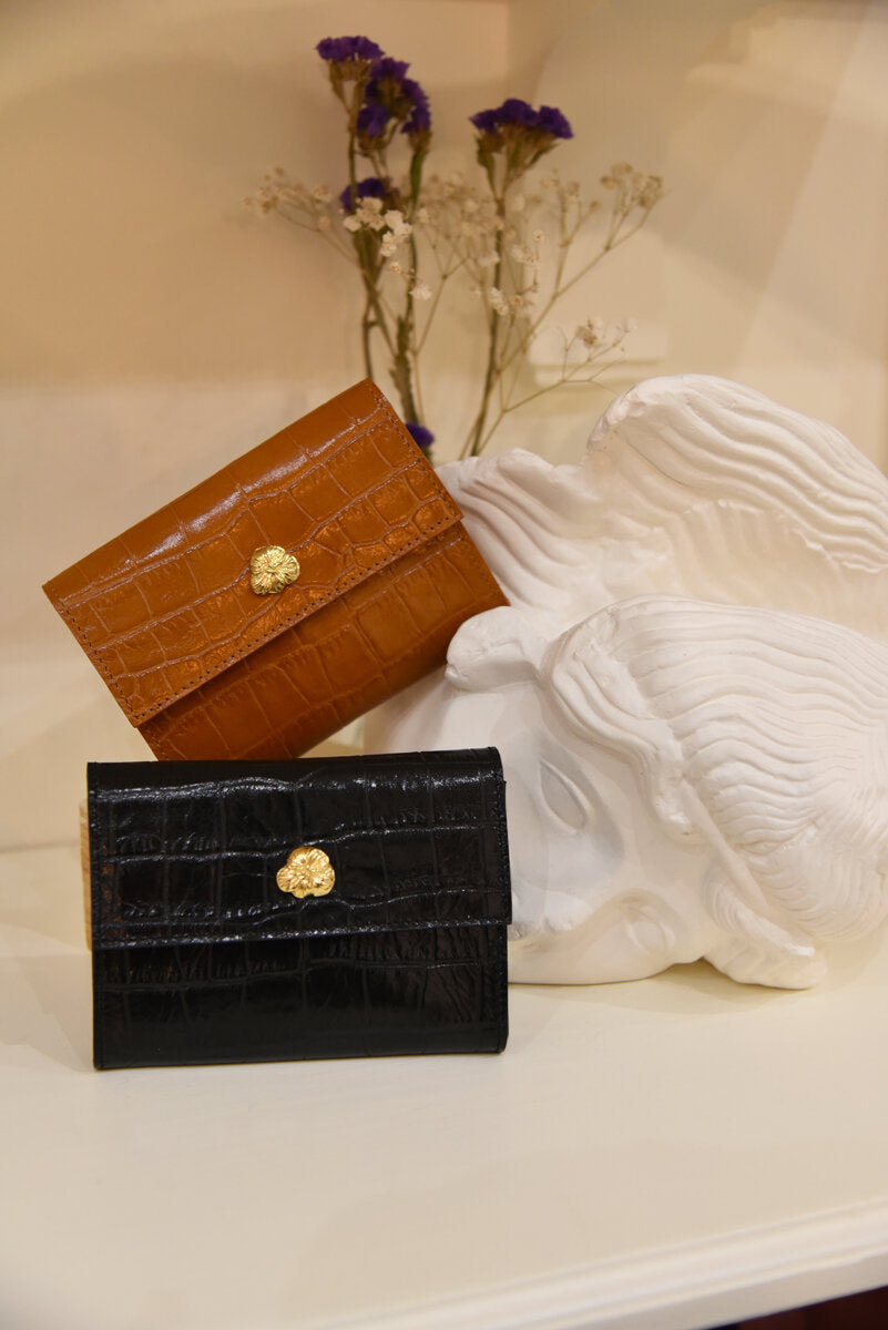 Portefeuille en cuir de vachette embossé croco et fleur dorée à l’or fin