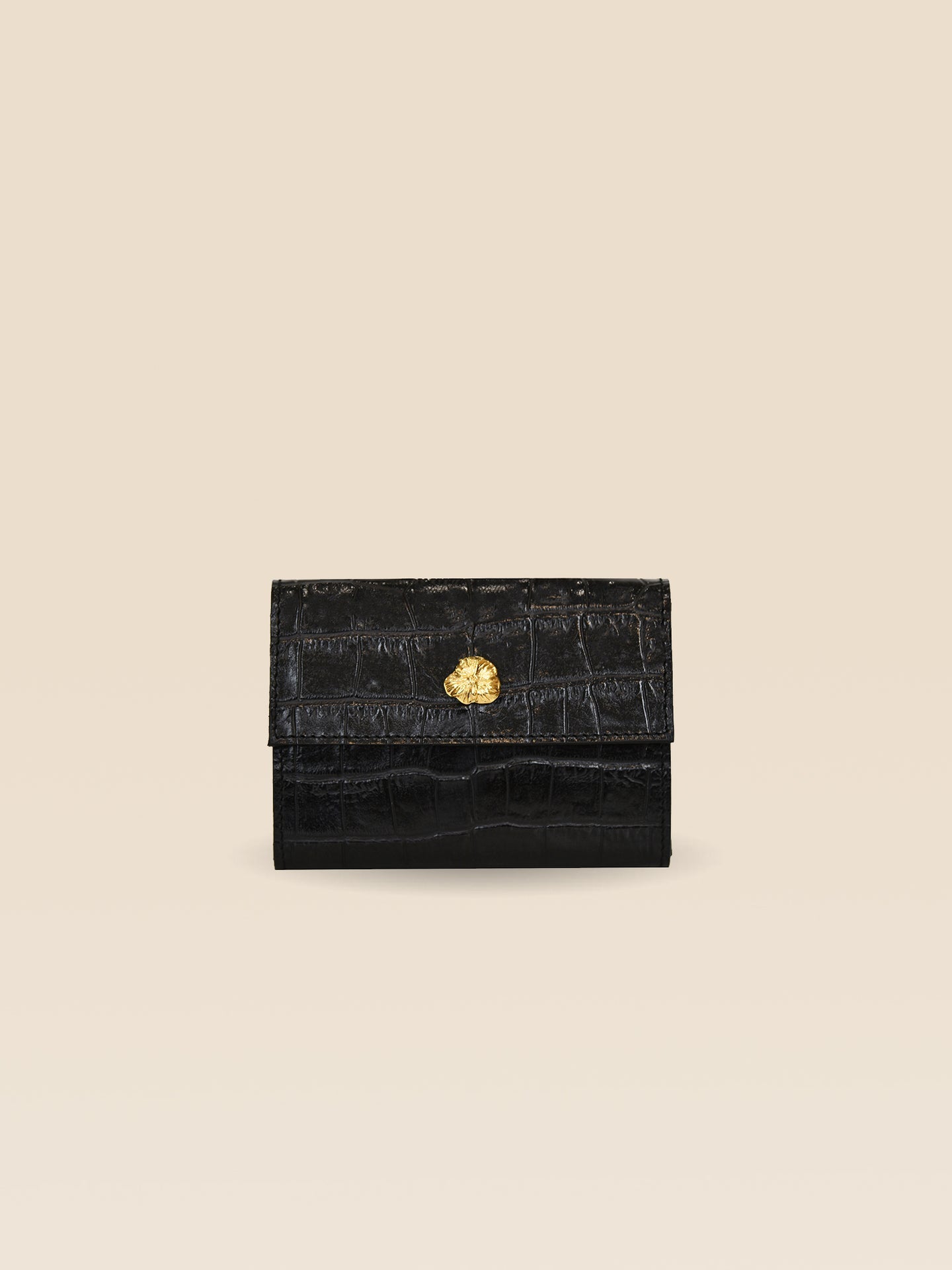 Portefeuille en cuir de vachette embossé croco et fleur dorée à l’or fin