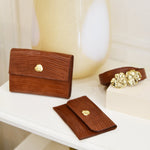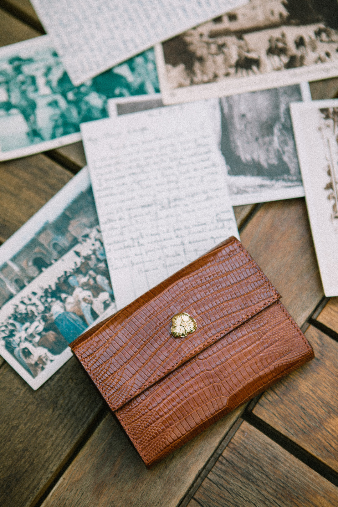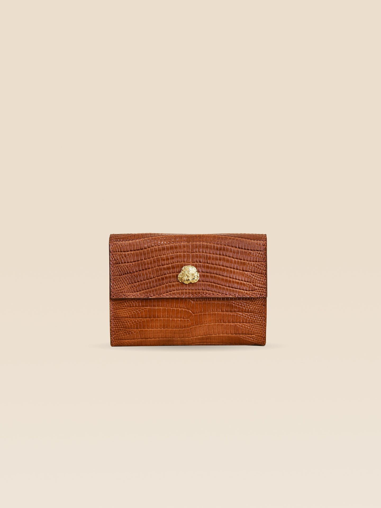 Portefeuille en cuir de vachette embossé lézard camel à tannage semi-végétal et fleur dorée à l’or fin