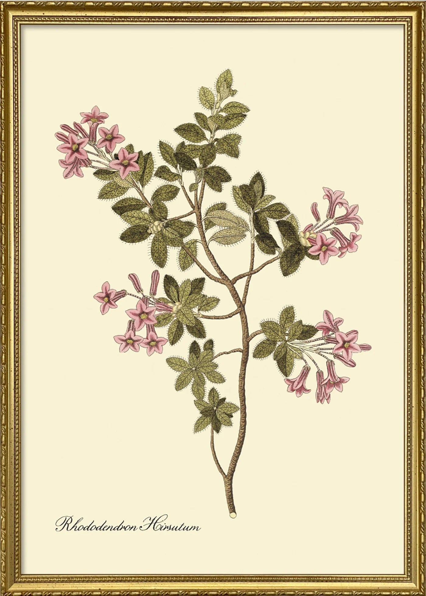 Cette affiche encadrée représente une illustration botanique vintage d'un rhododendron hirsutum en fleurs.