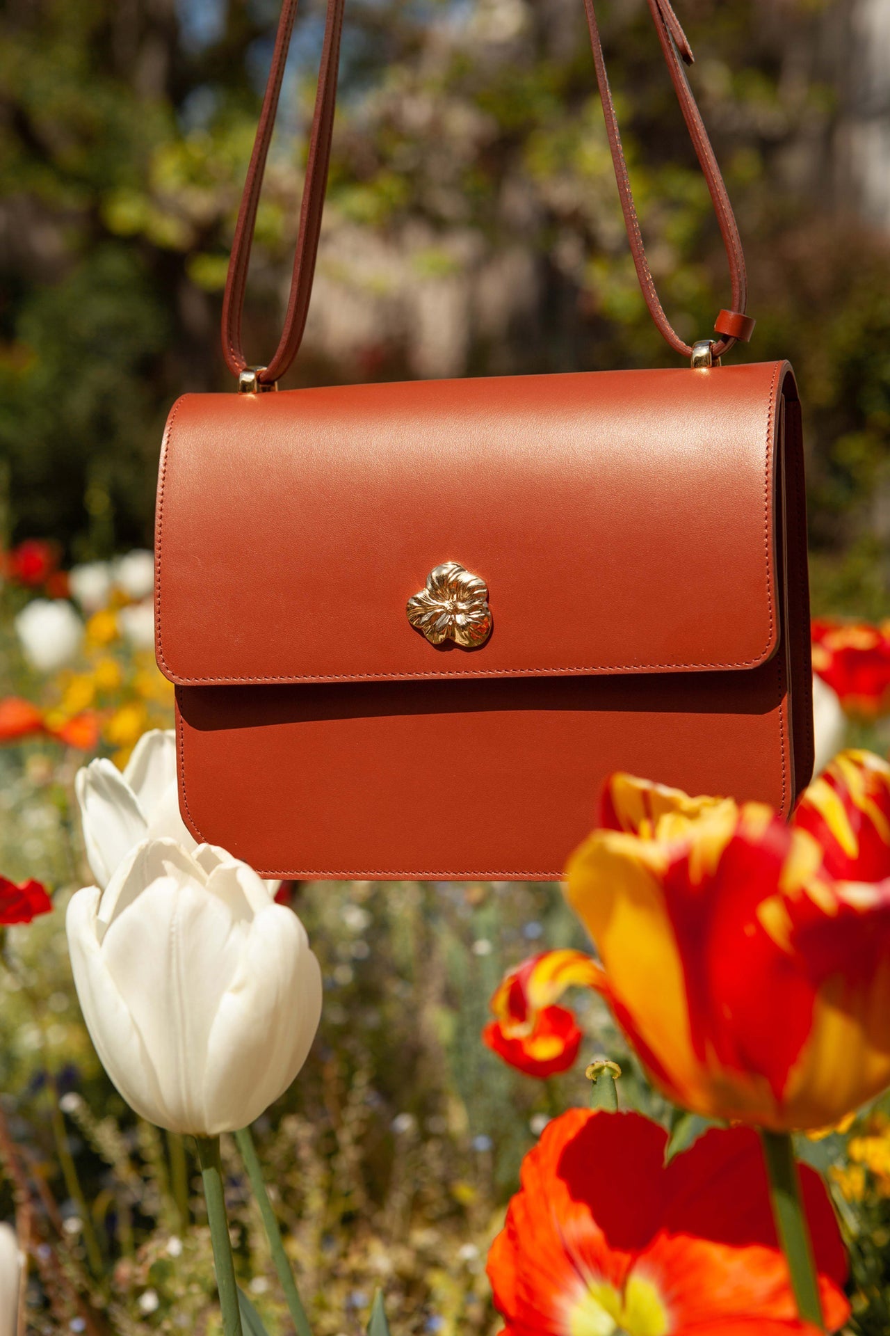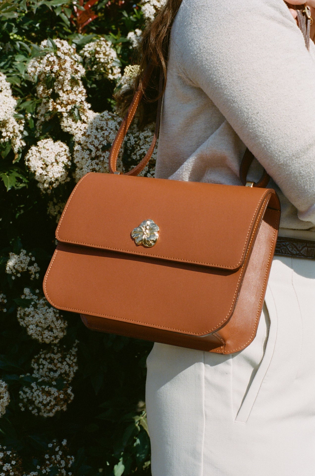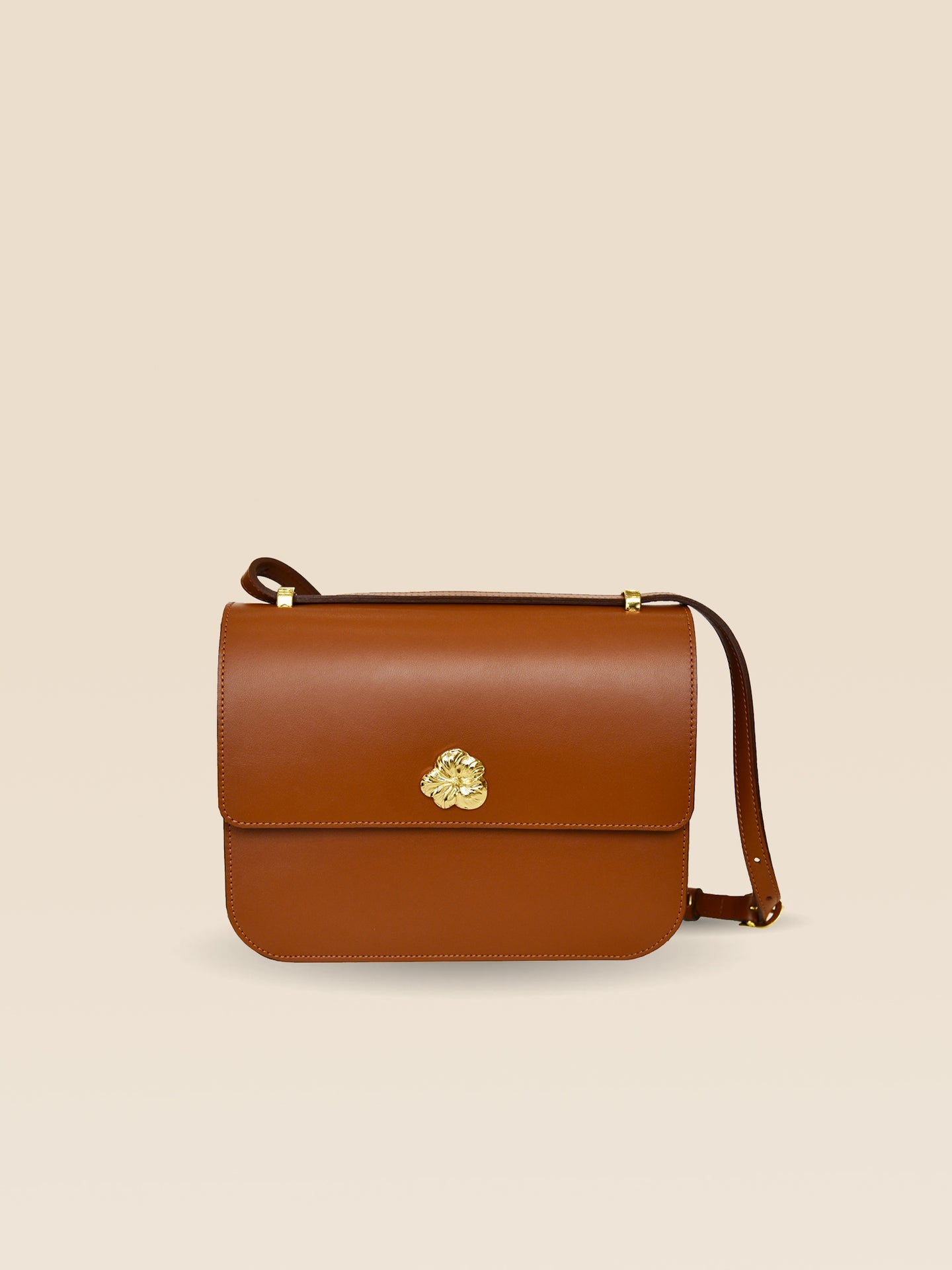 Sac en cuir de vachette lisse à tannage minéral et fleur aimantée dorée à l’or