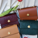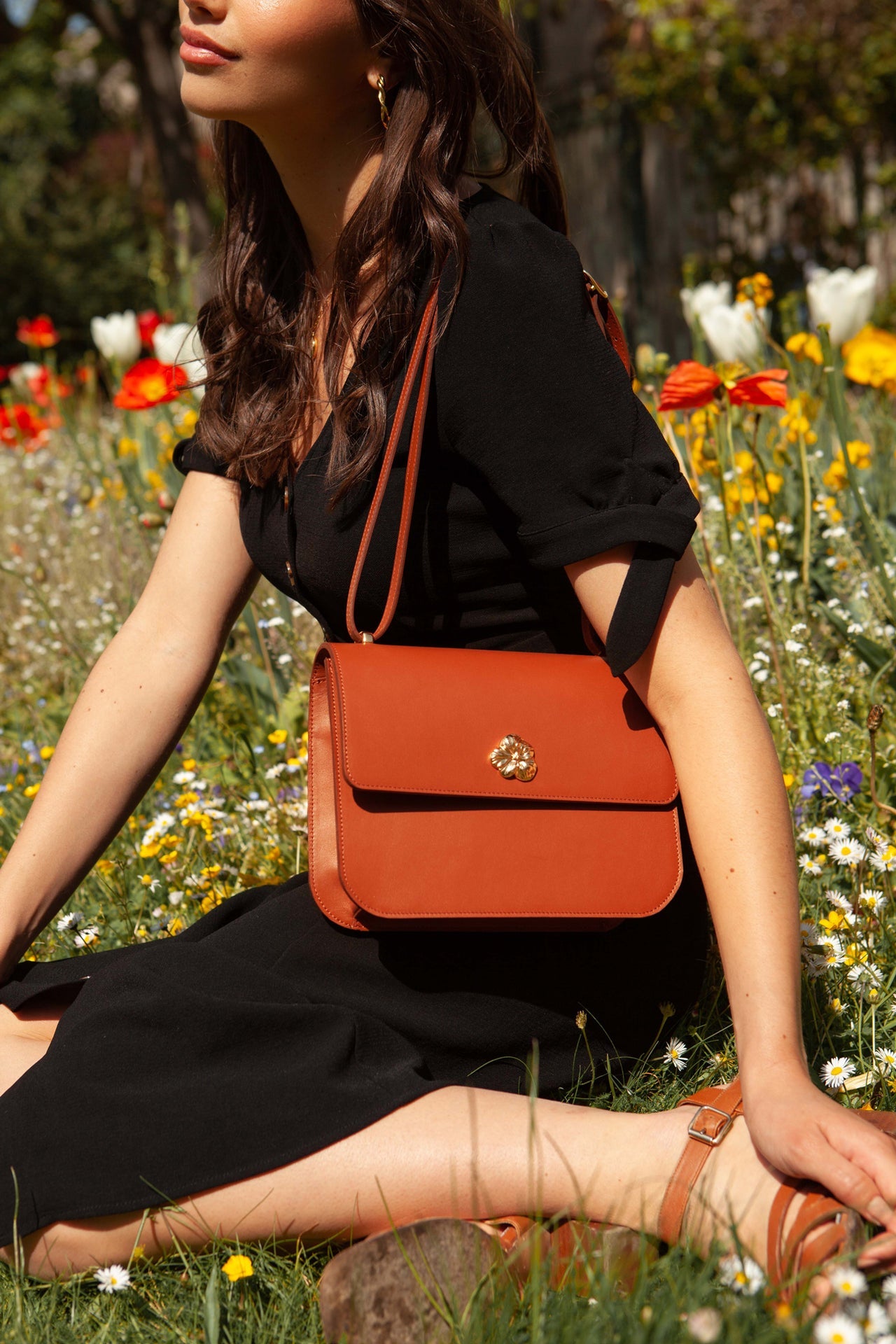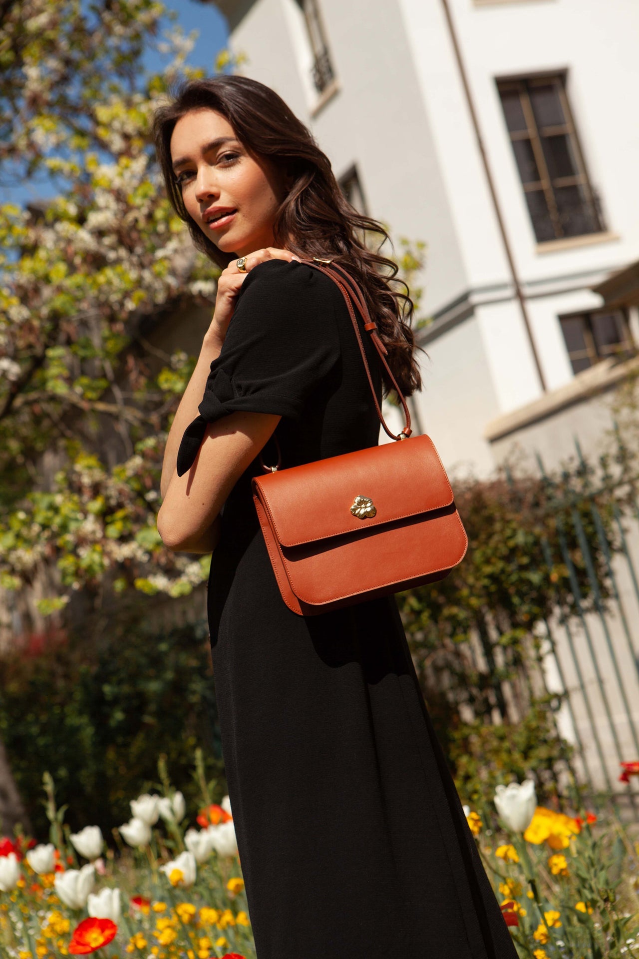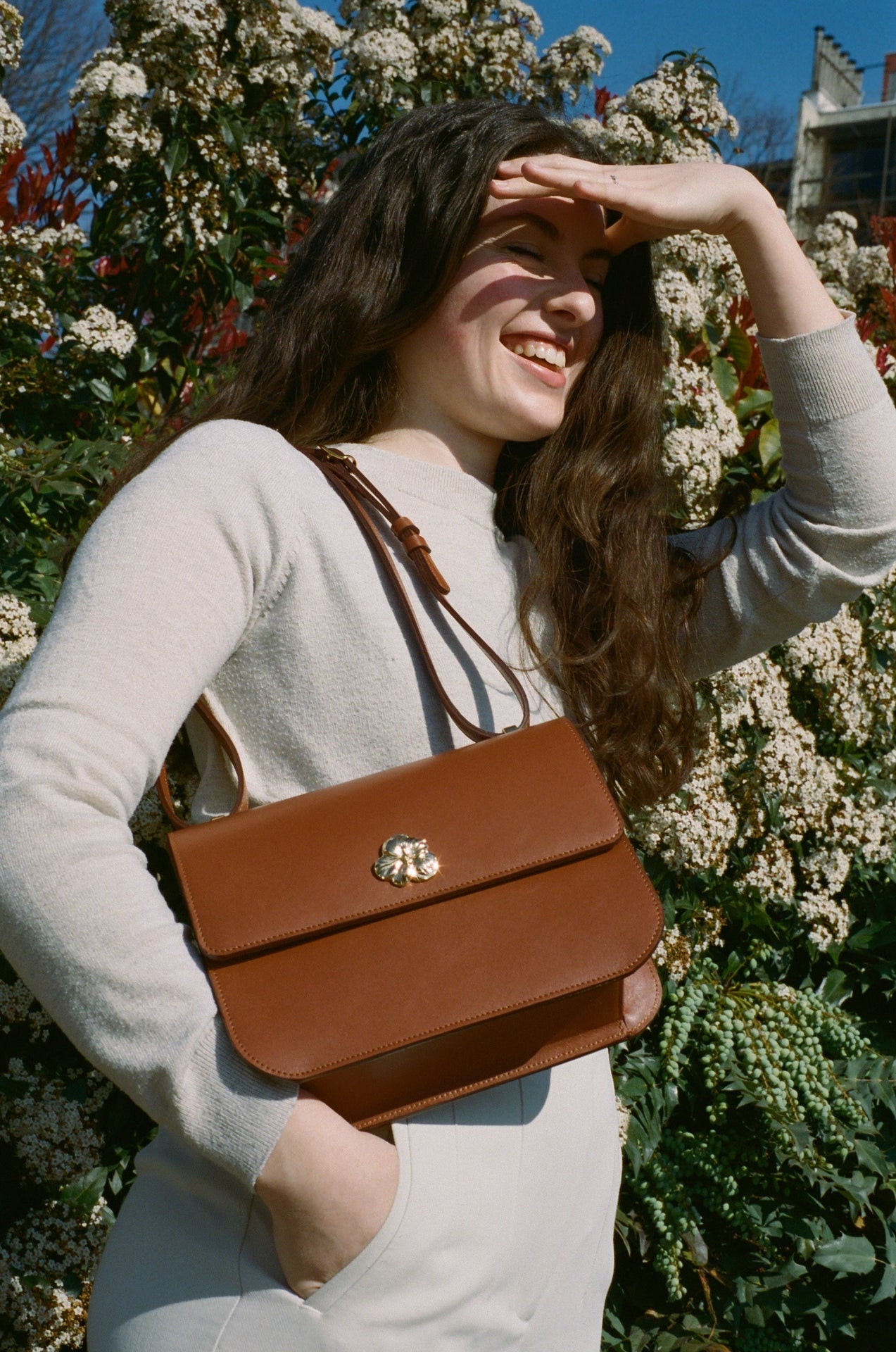 Sac en cuir de vachette lisse à tannage minéral et fleur aimantée dorée à l’or