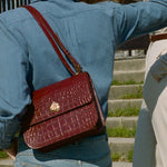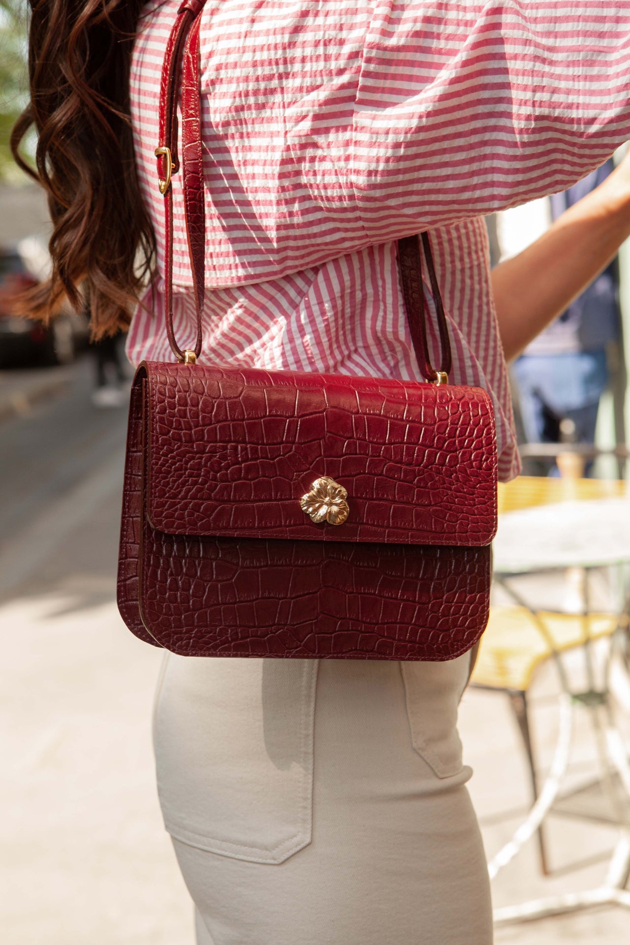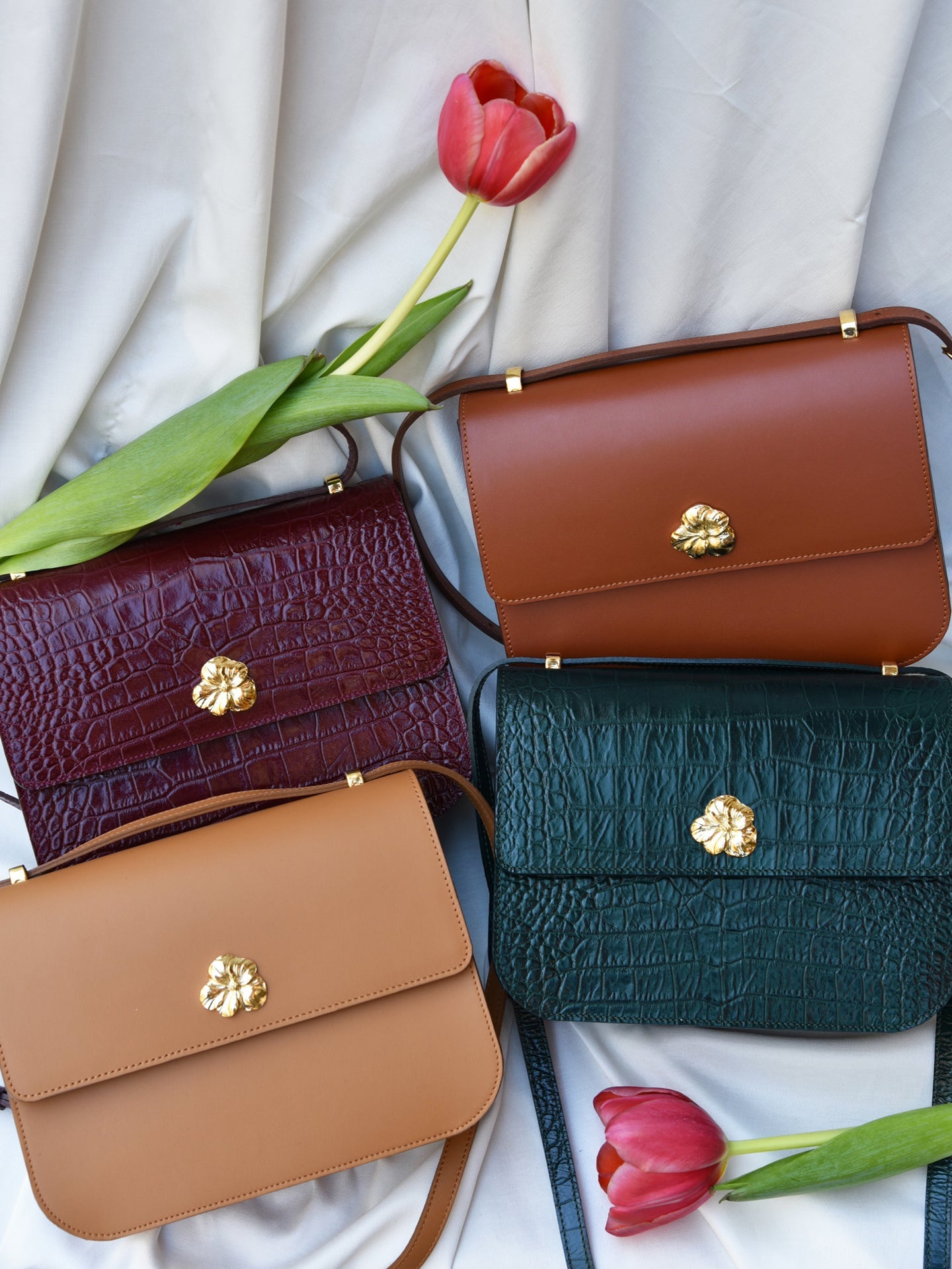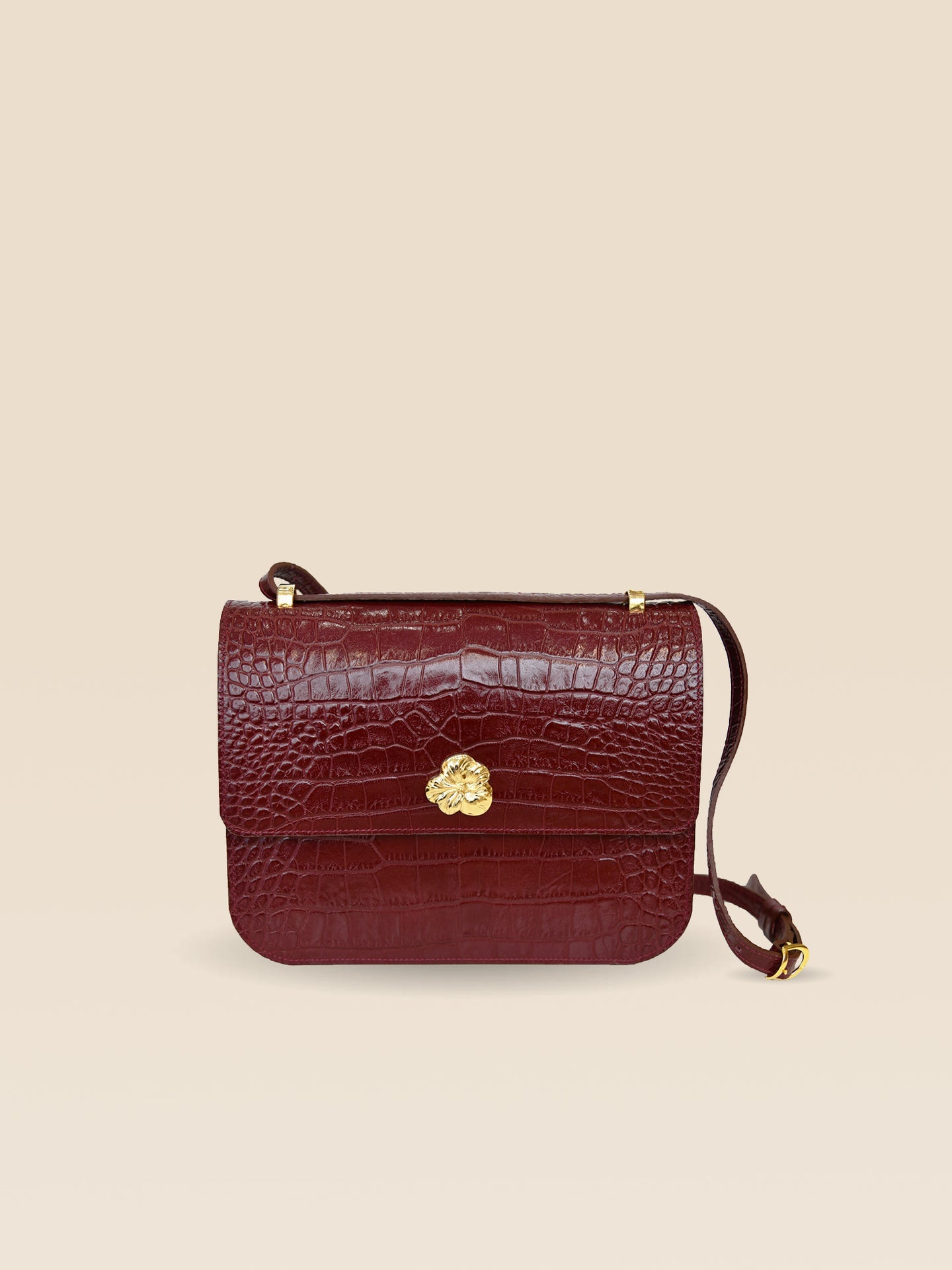 Sac en cuir de vachette embossé croco à tannage minéral et fleur aimantée dorée à l’or