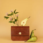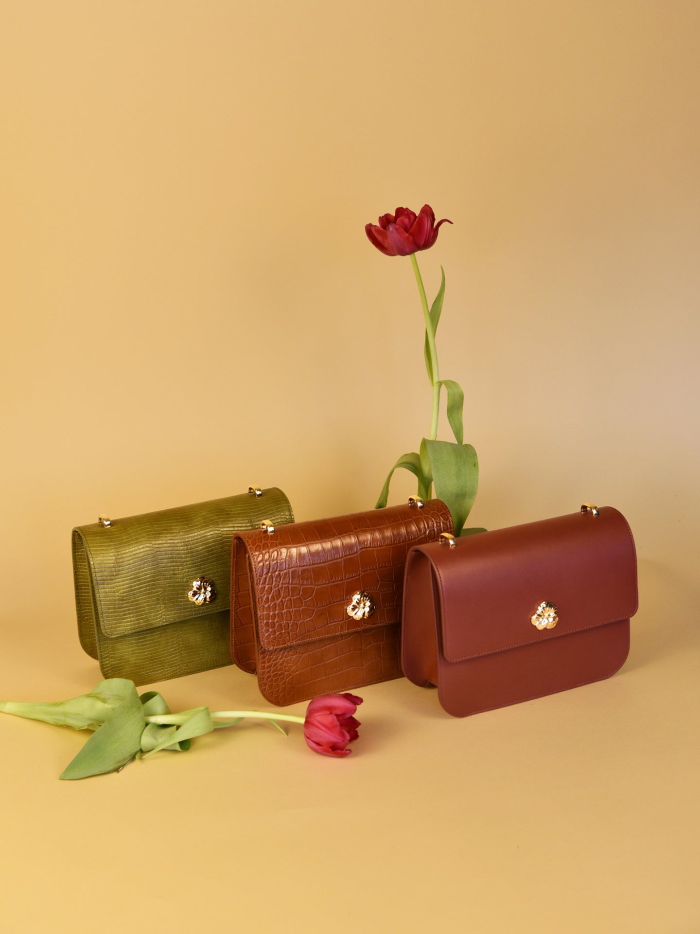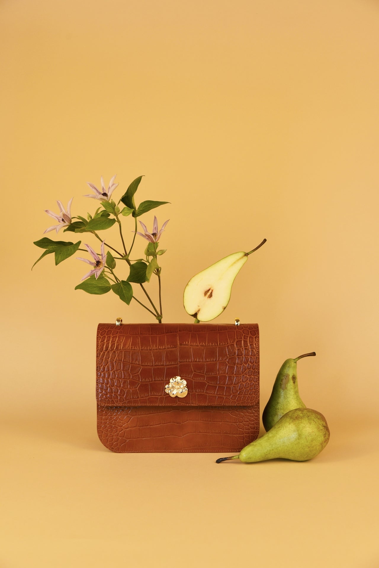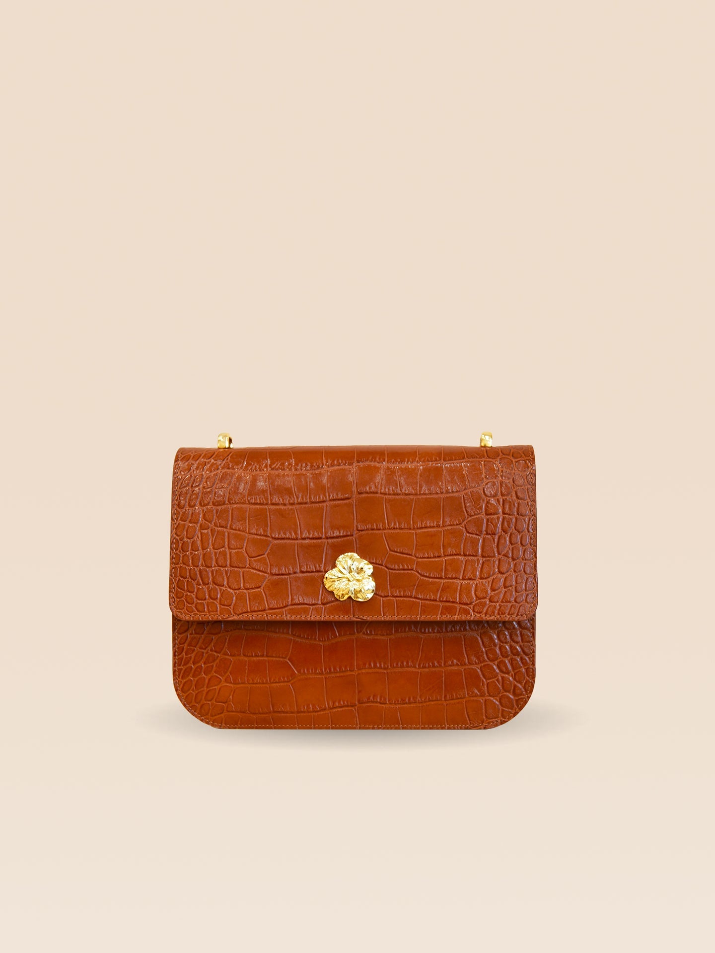 Sac en cuir de vachette embossé croco à tannage minéral et fleur aimantée dorée à l’or