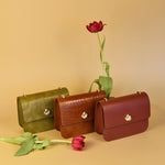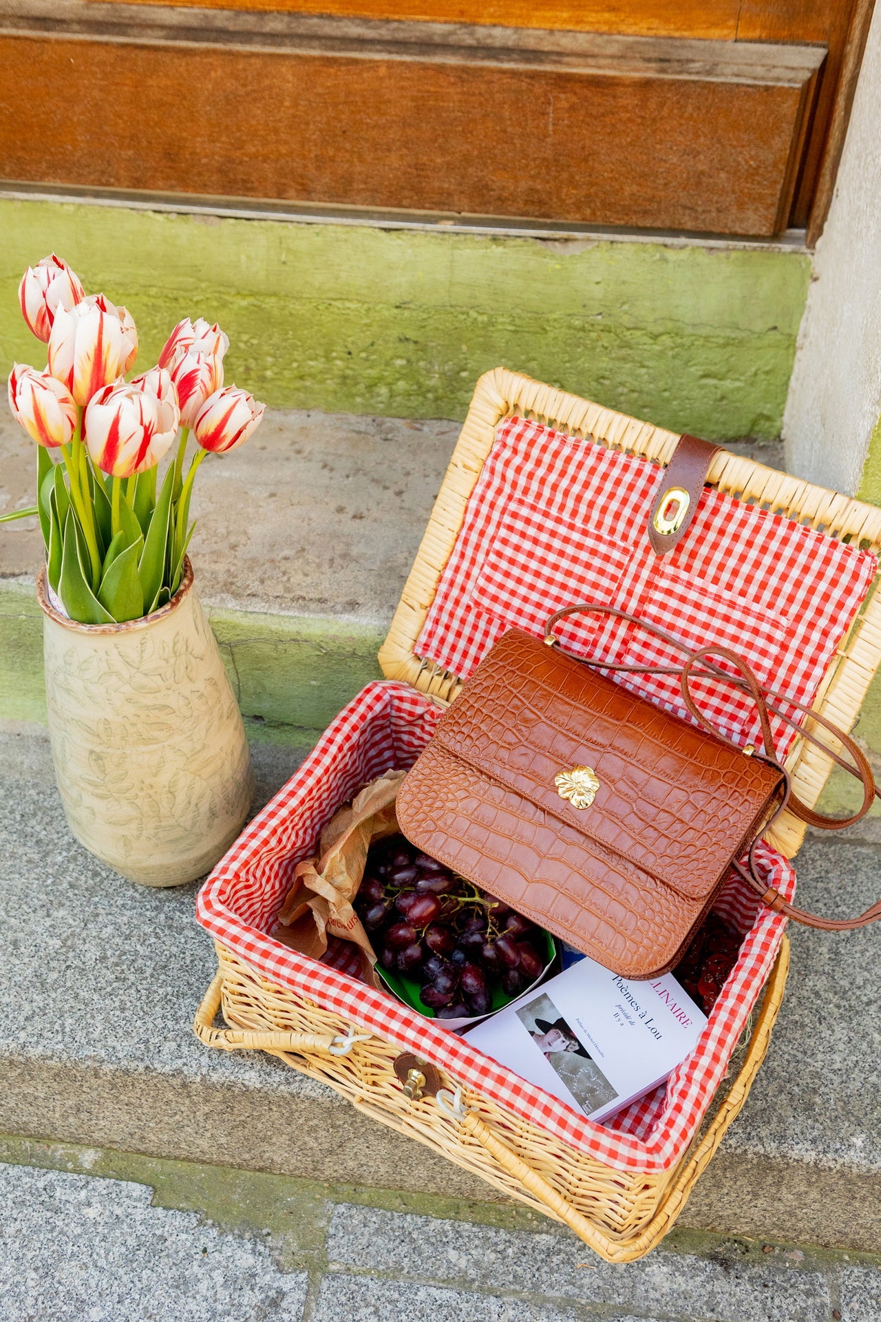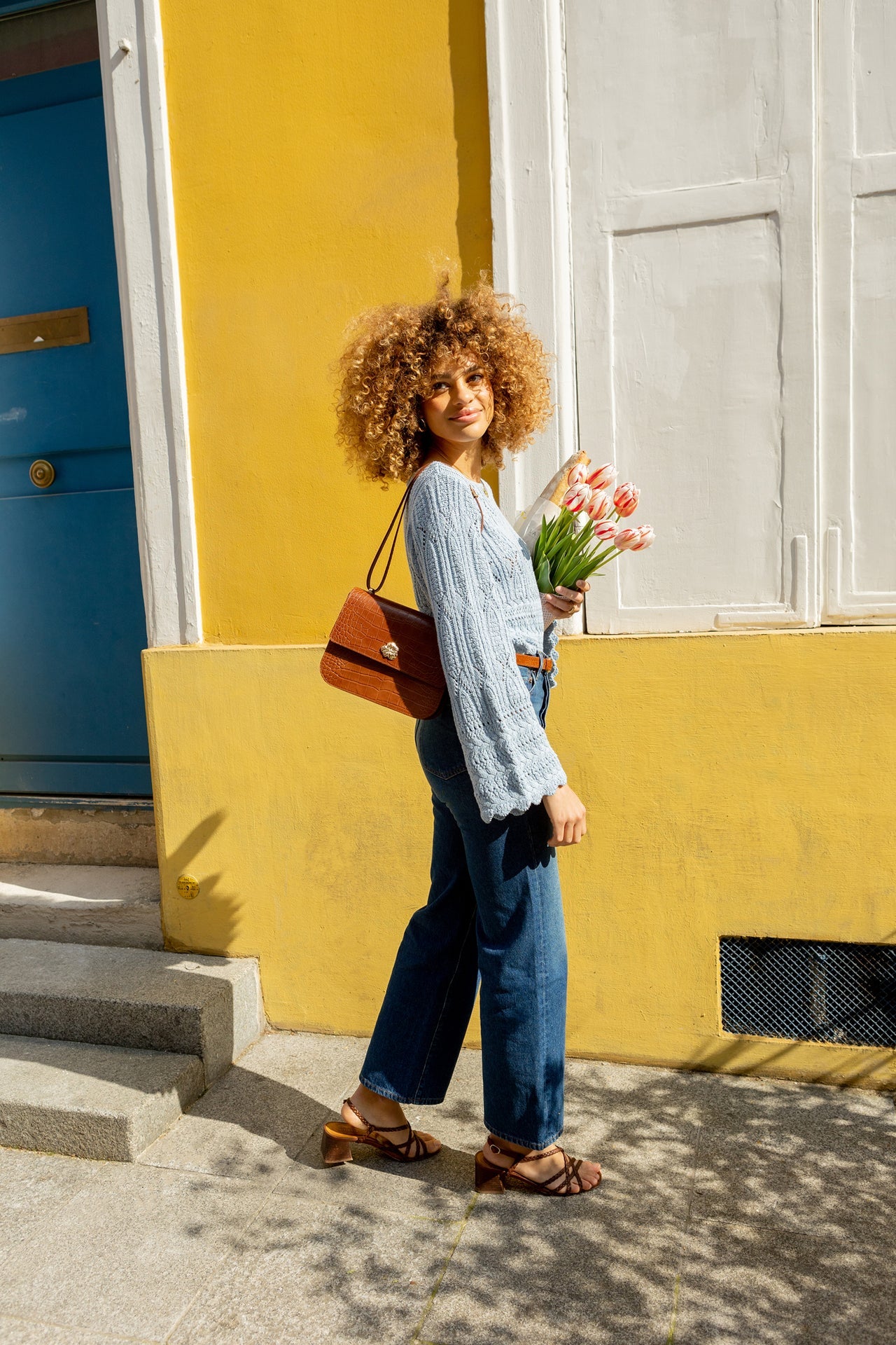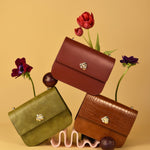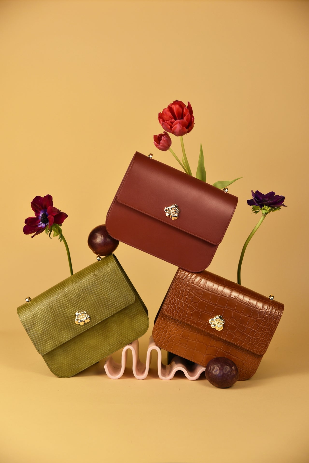 Sac en cuir de vachette embossé croco à tannage minéral et fleur aimantée dorée à l’or