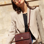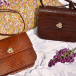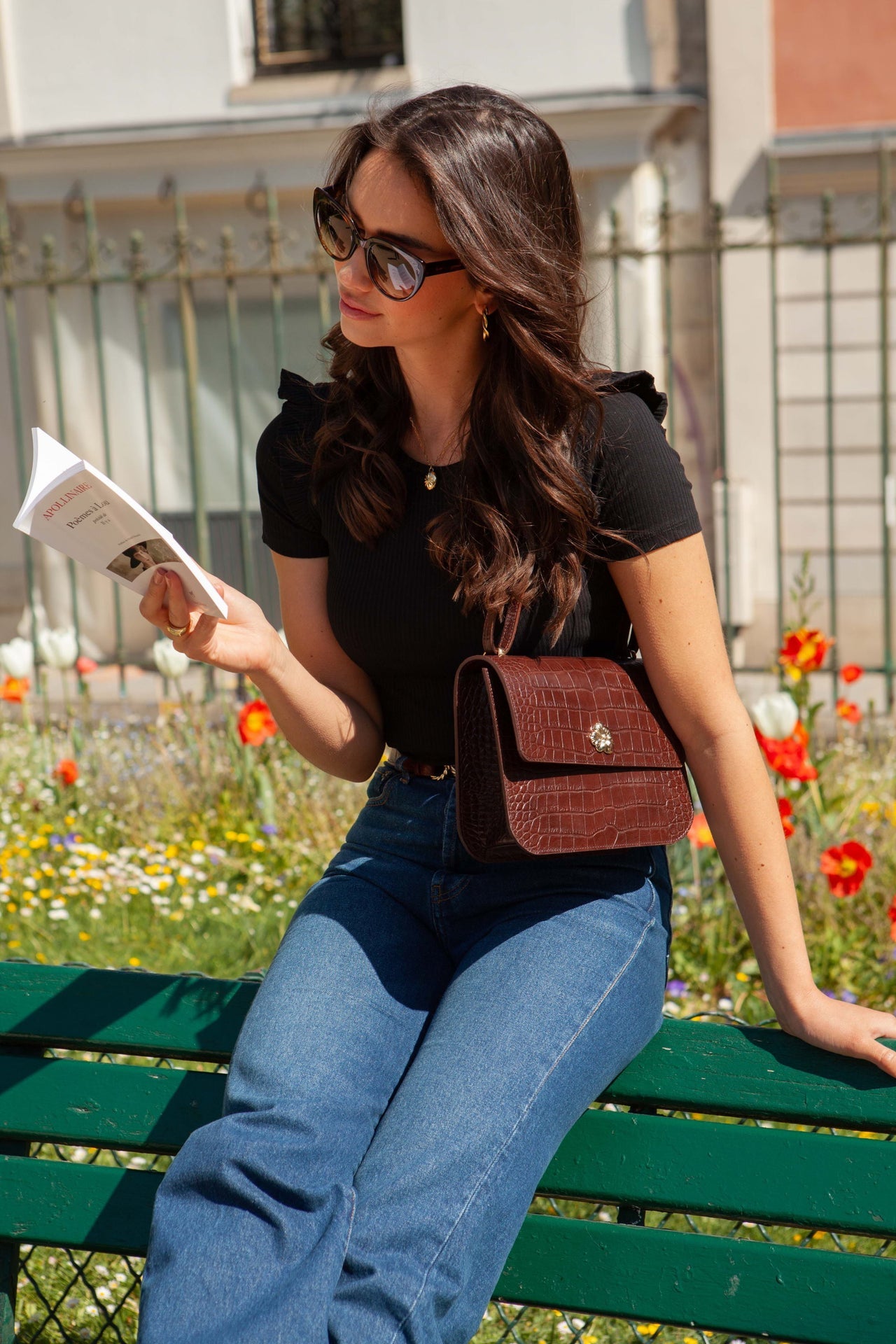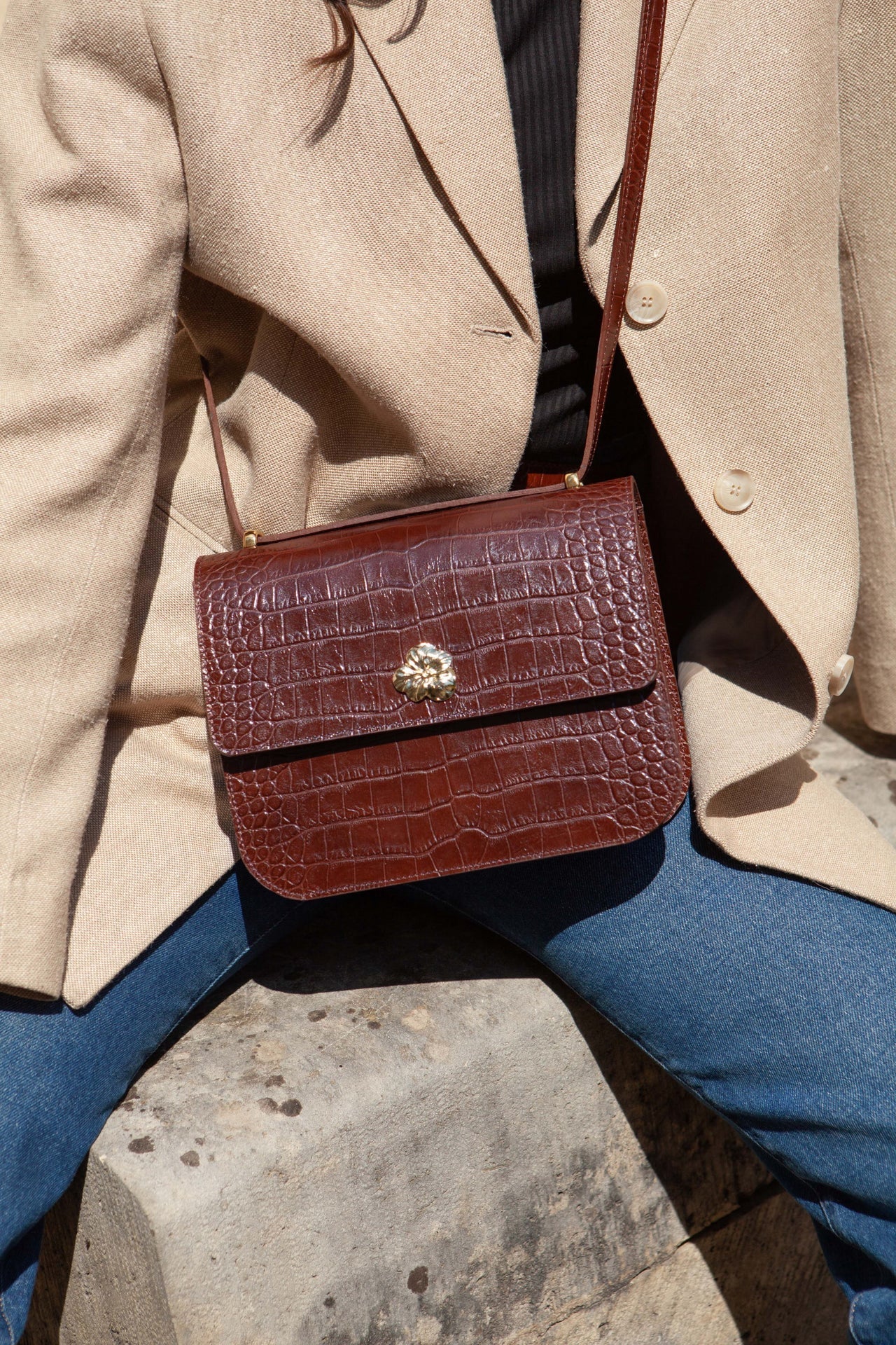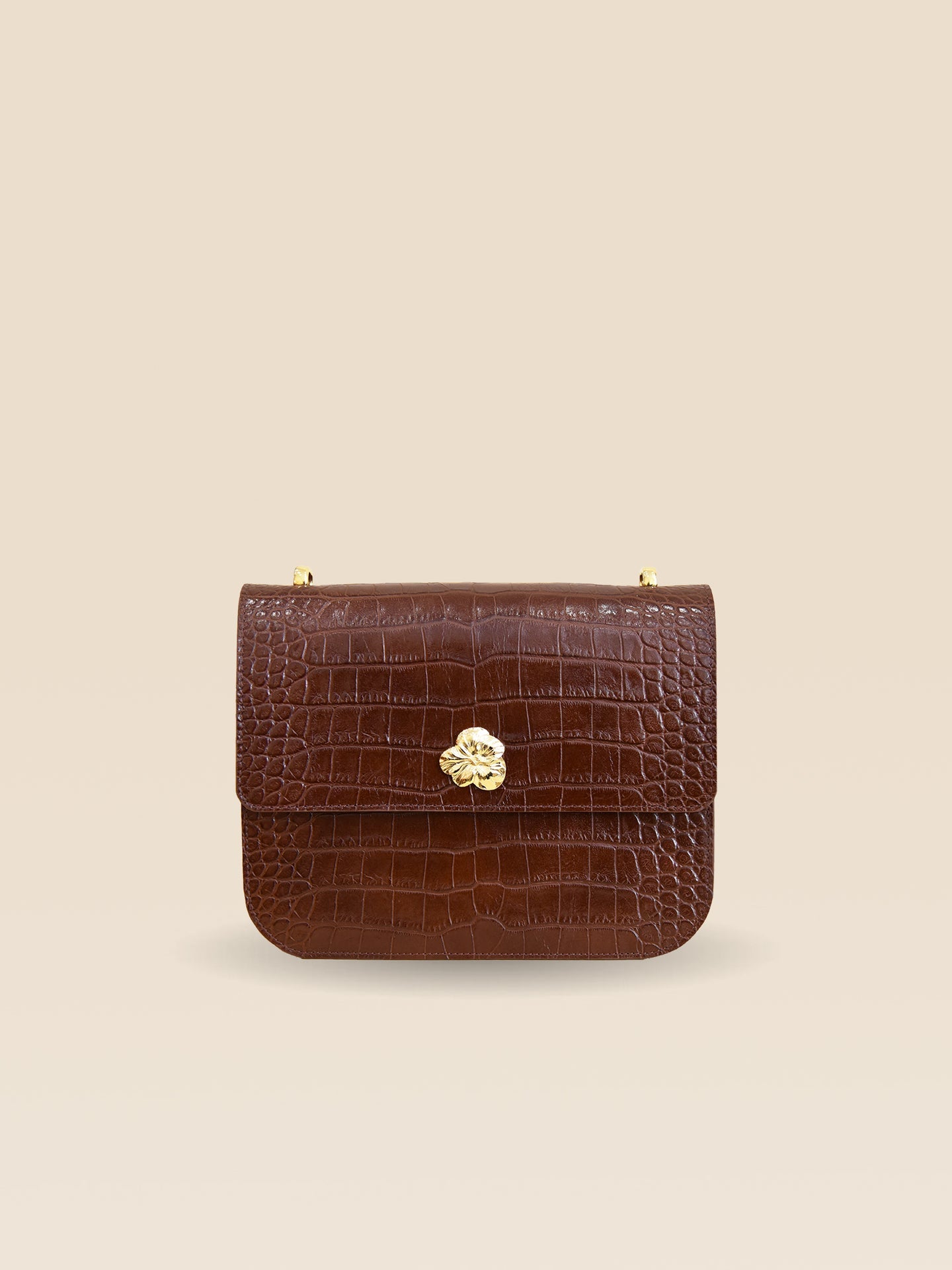 Sac en cuir de vachette embossé croco à tannage minéral et fleur aimantée dorée à l’or