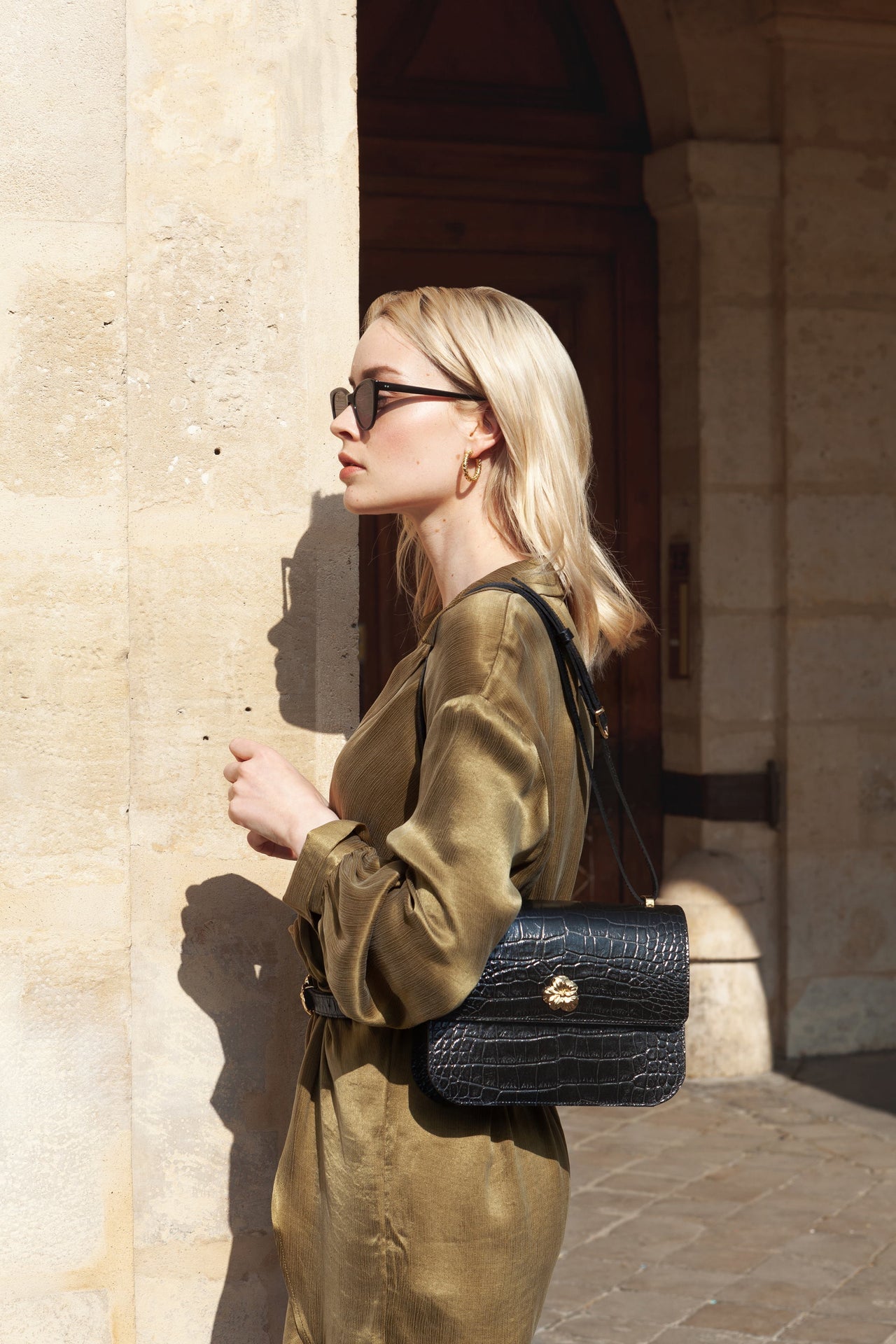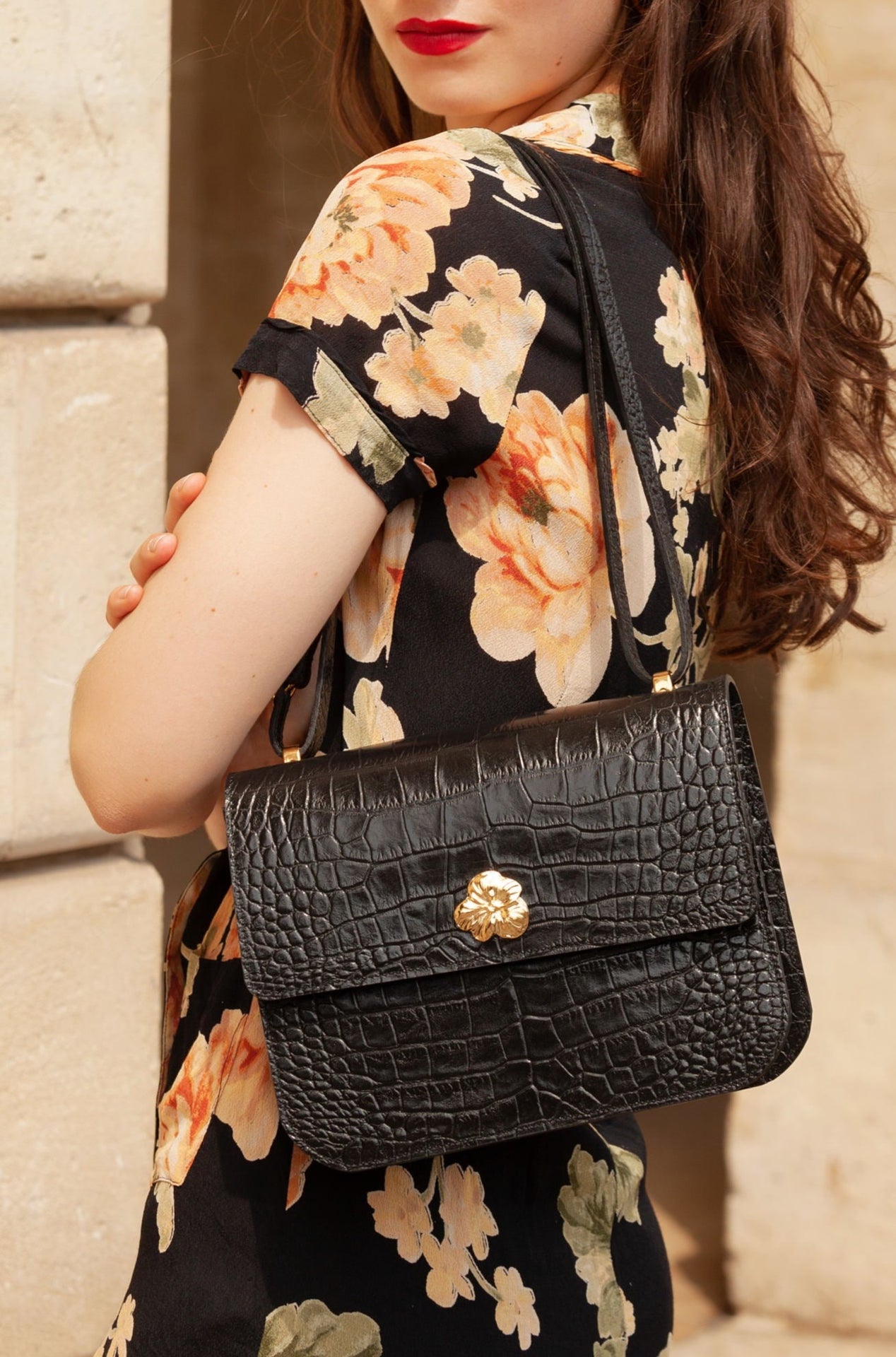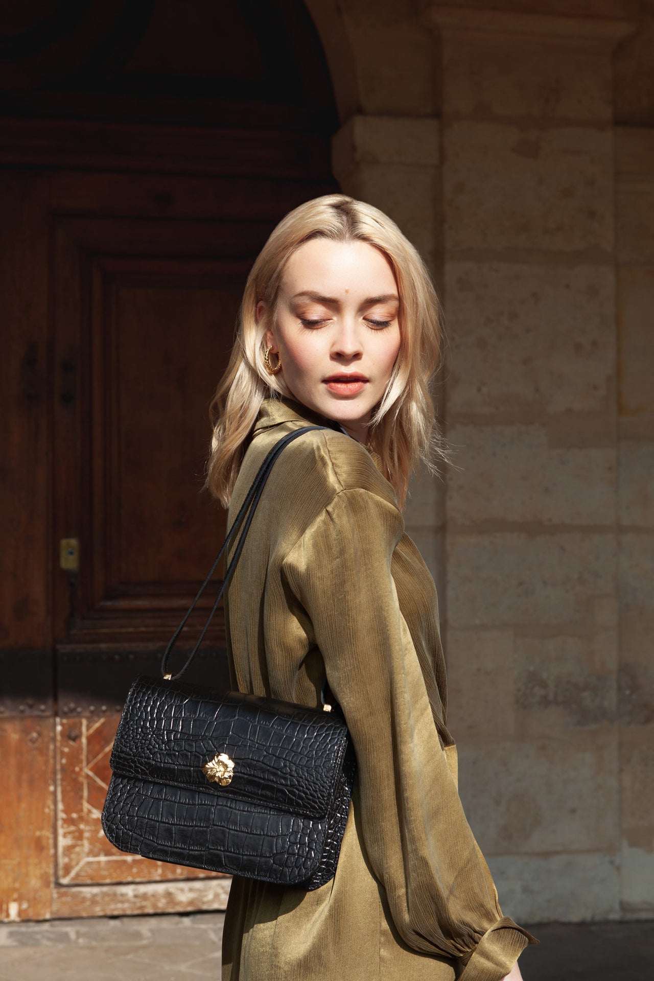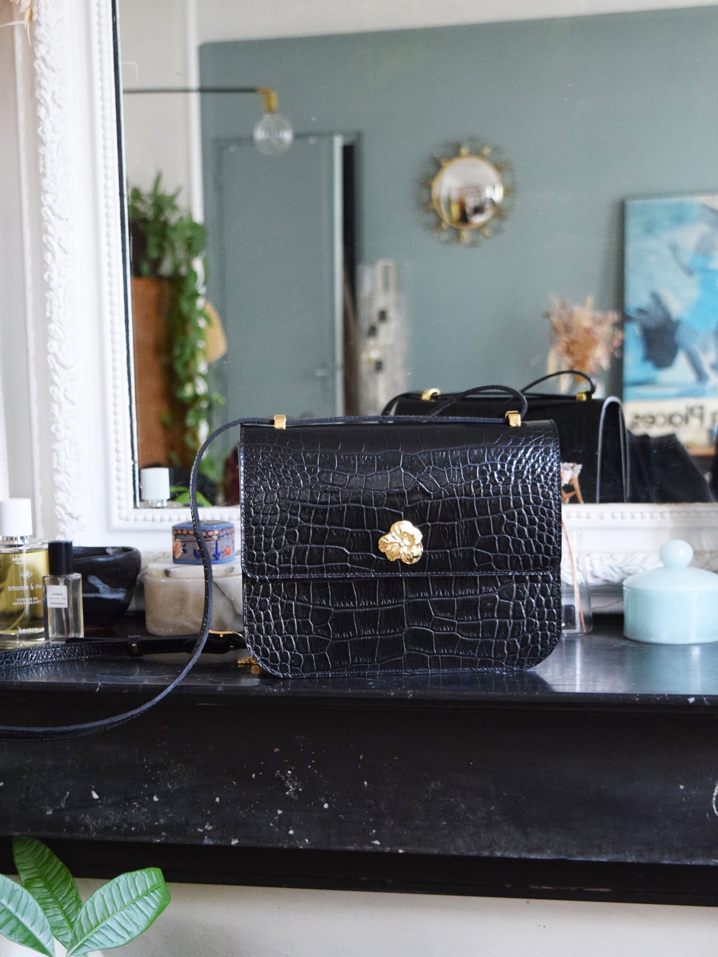 Sac en cuir de vachette embossé croco à tannage minéral et fleur aimantée dorée à l’or