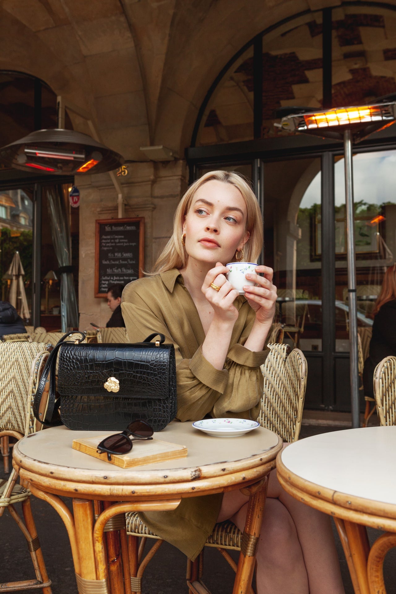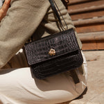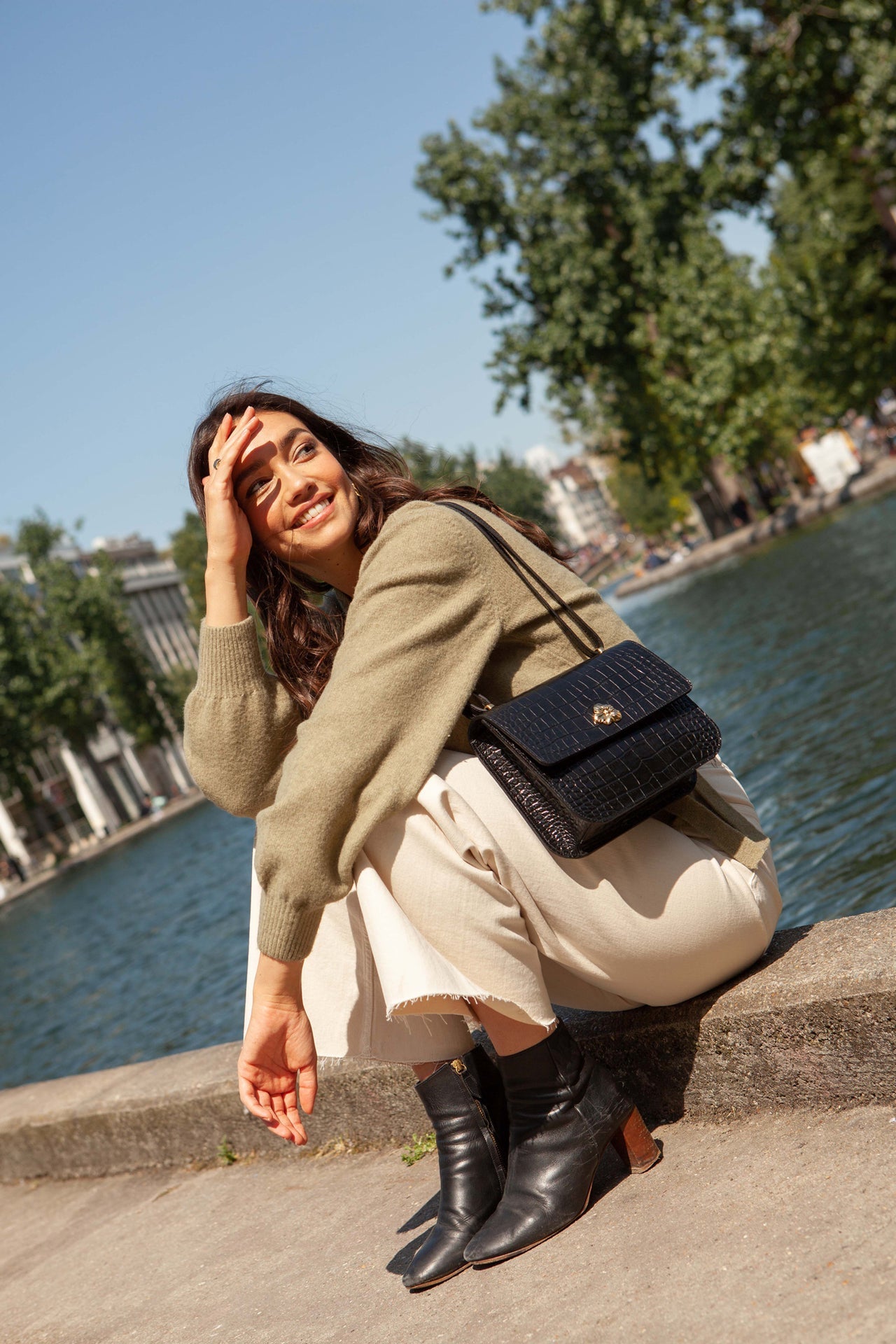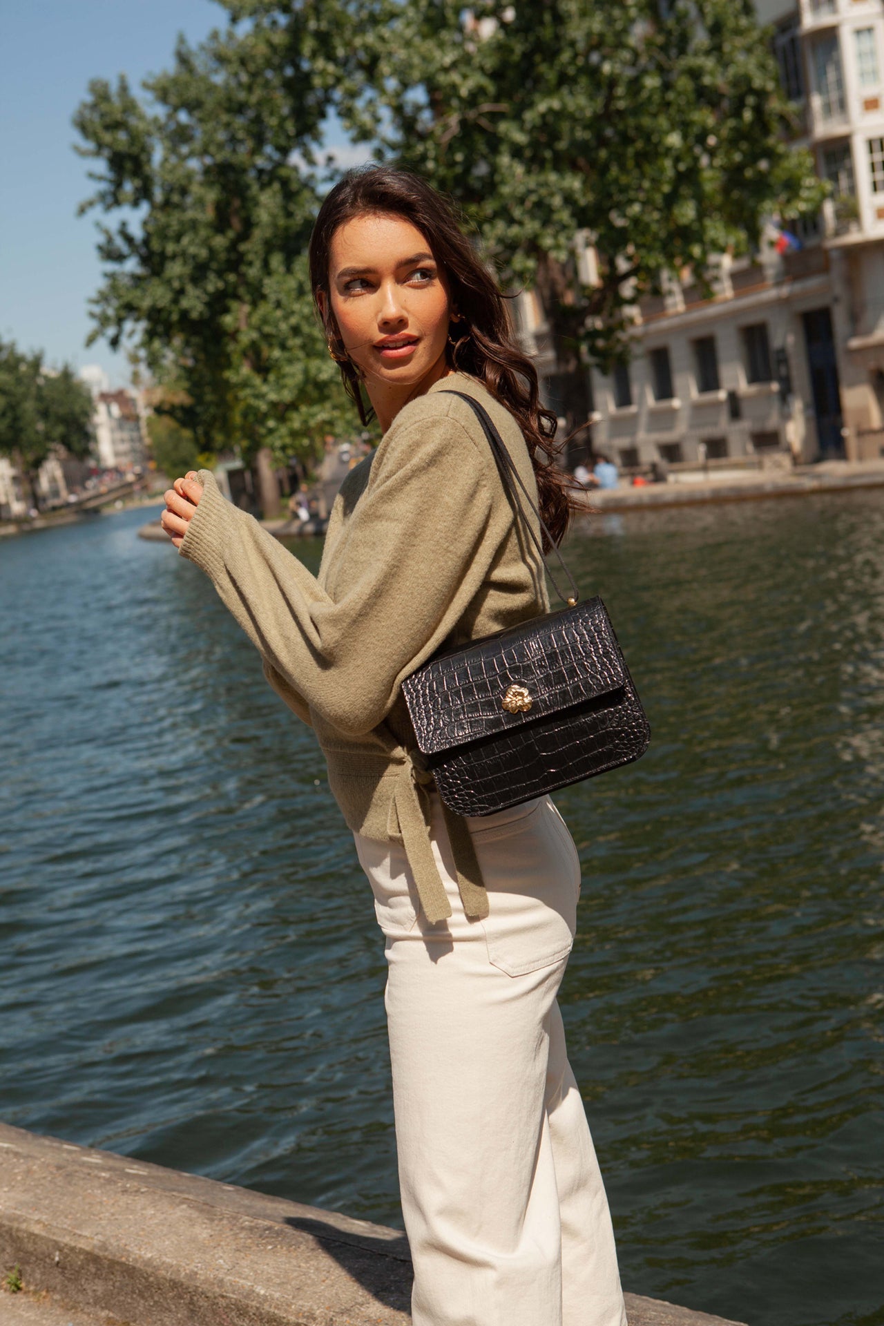 Sac en cuir de vachette embossé croco à tannage minéral et fleur aimantée dorée à l’or