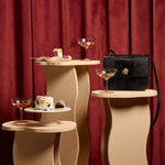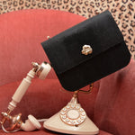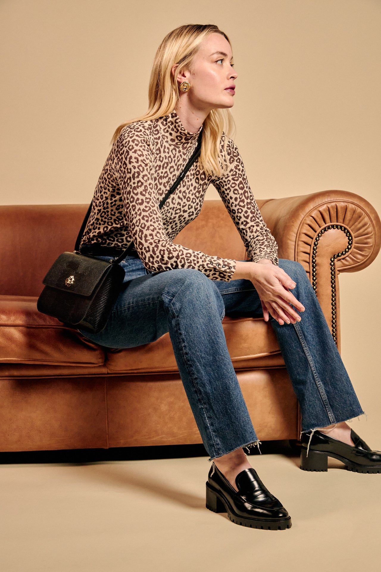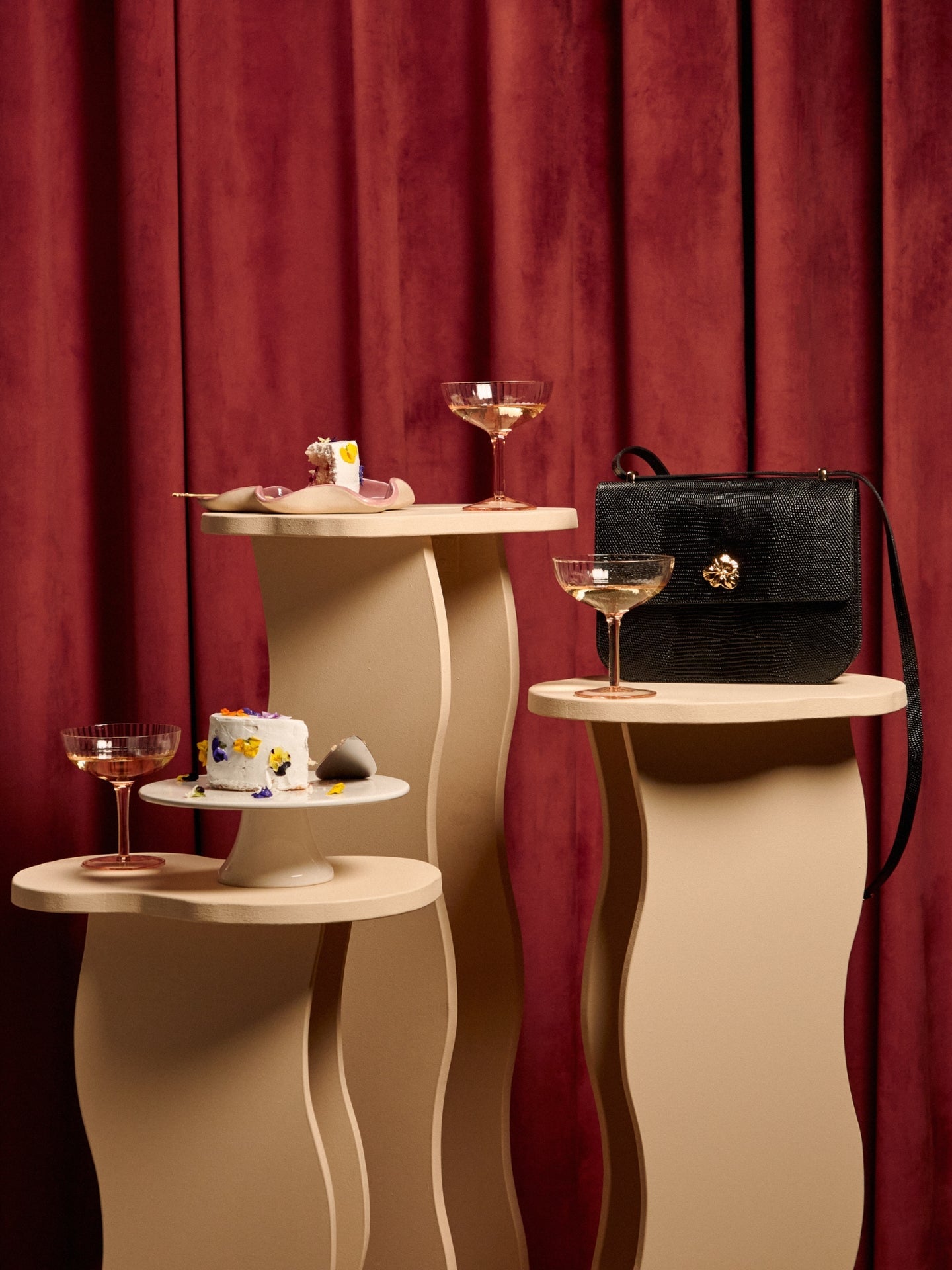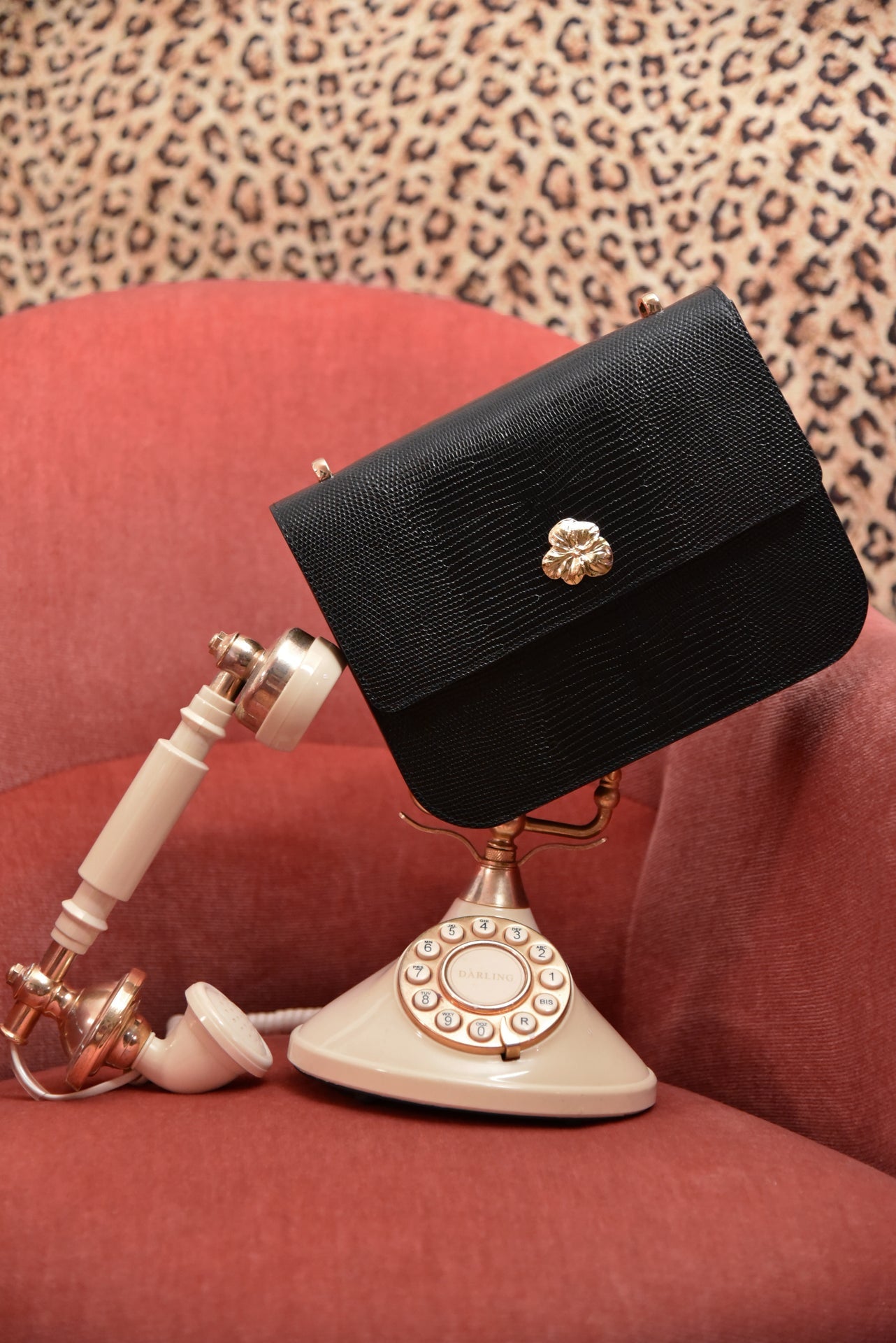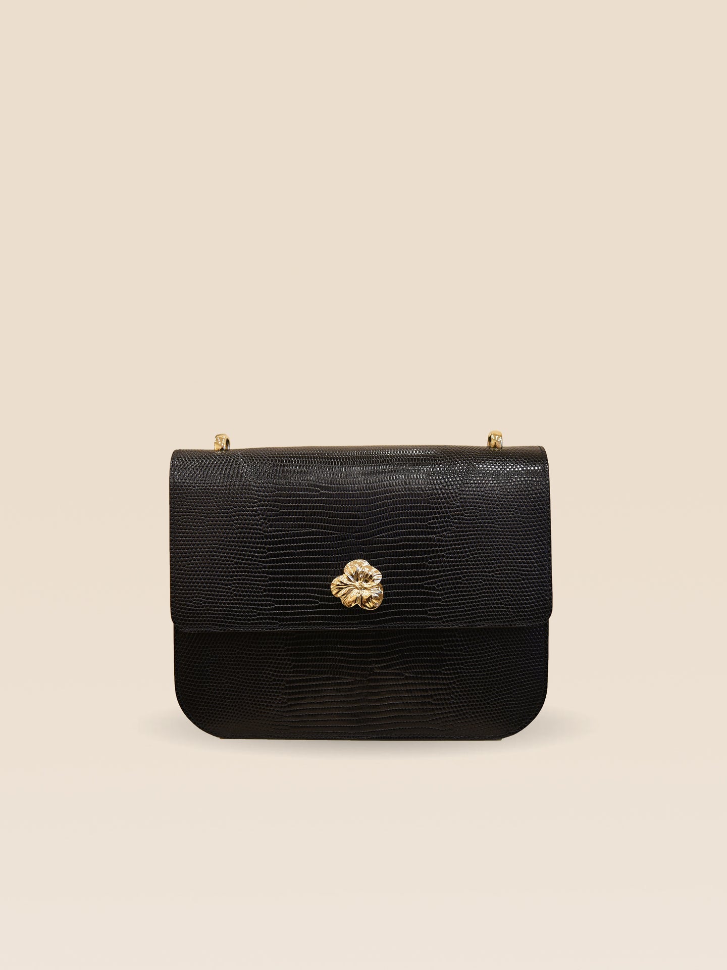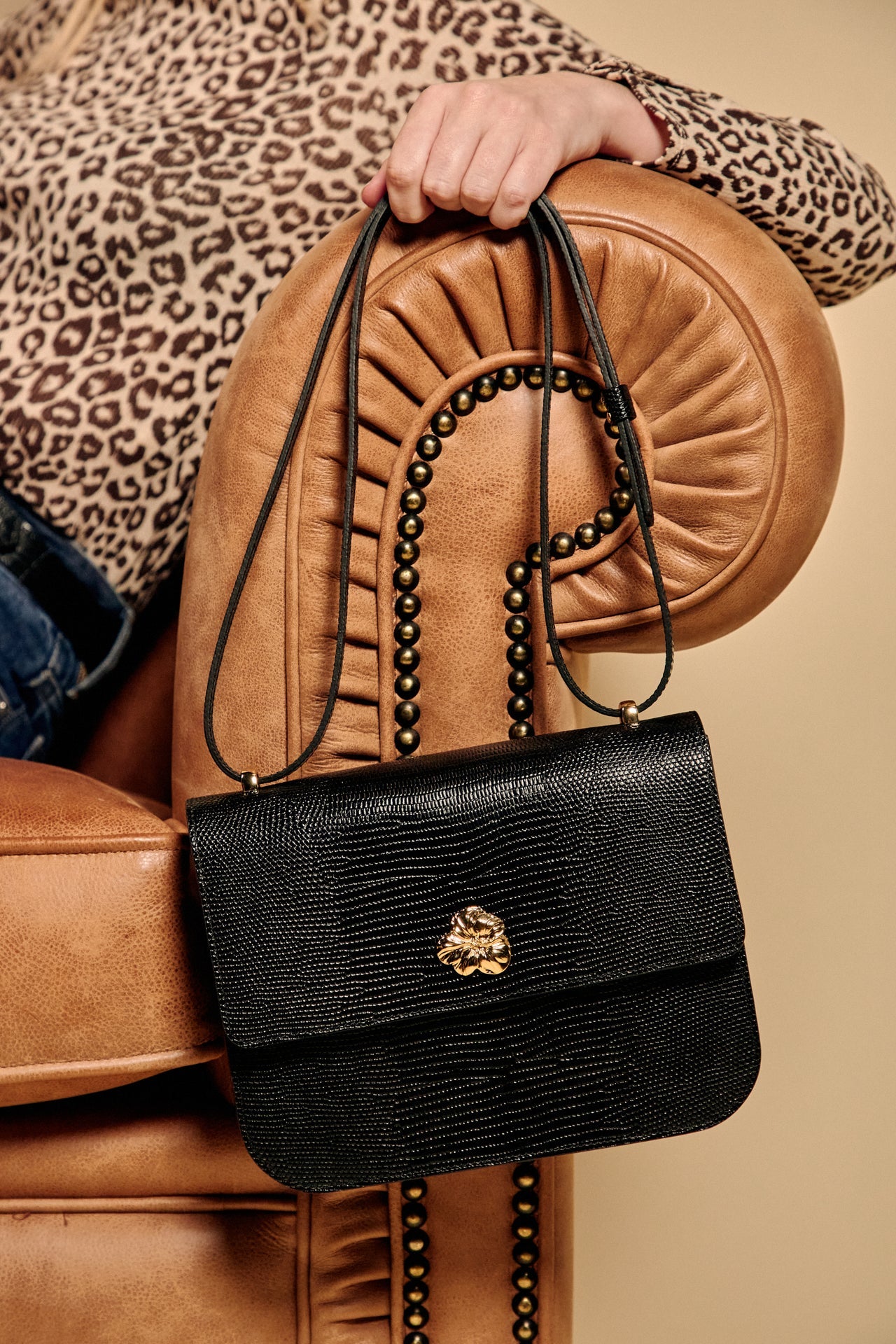 Sac en cuir de vachette embossé lézard à tannage semi-végétal et fleur aimantée dorée à l’or