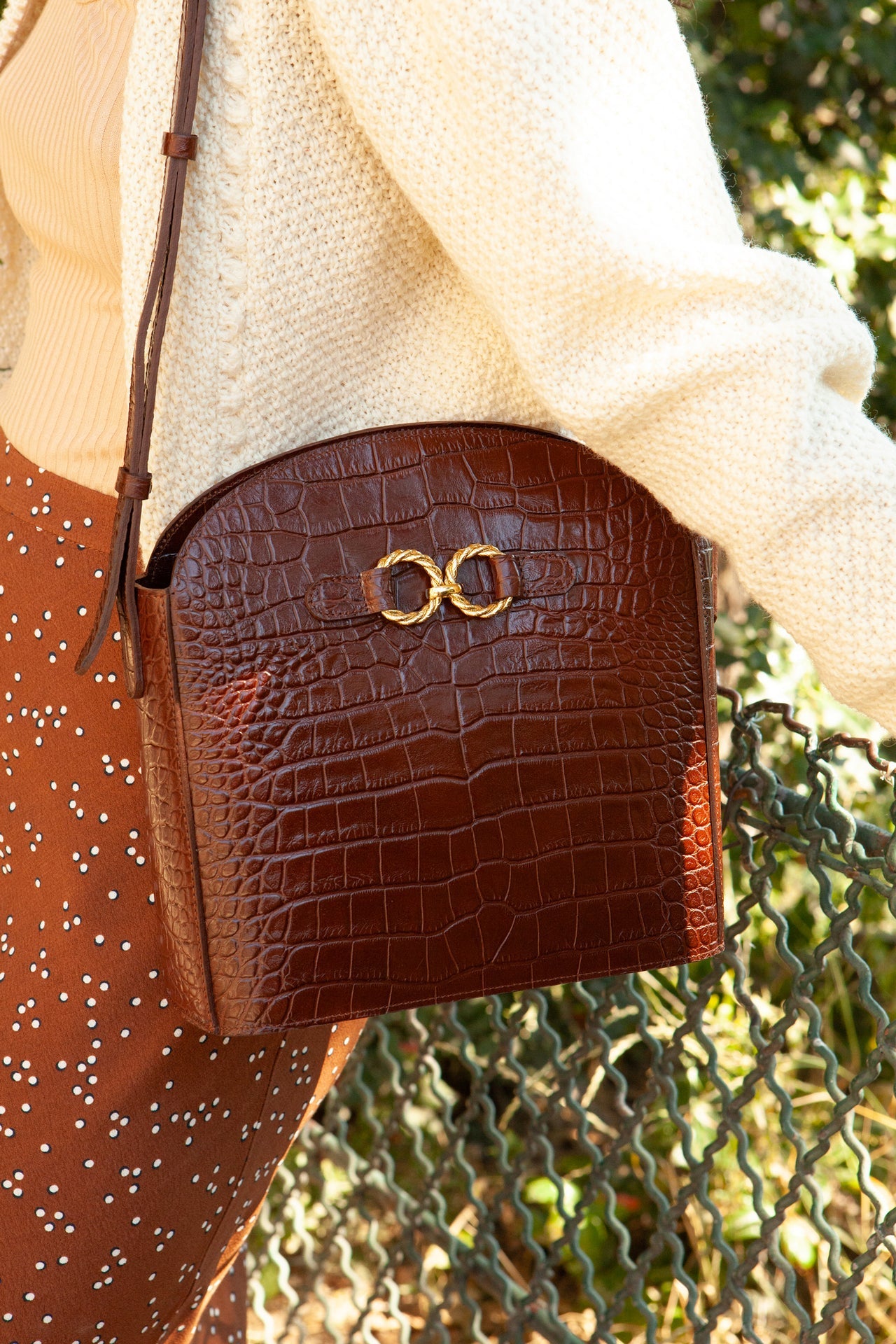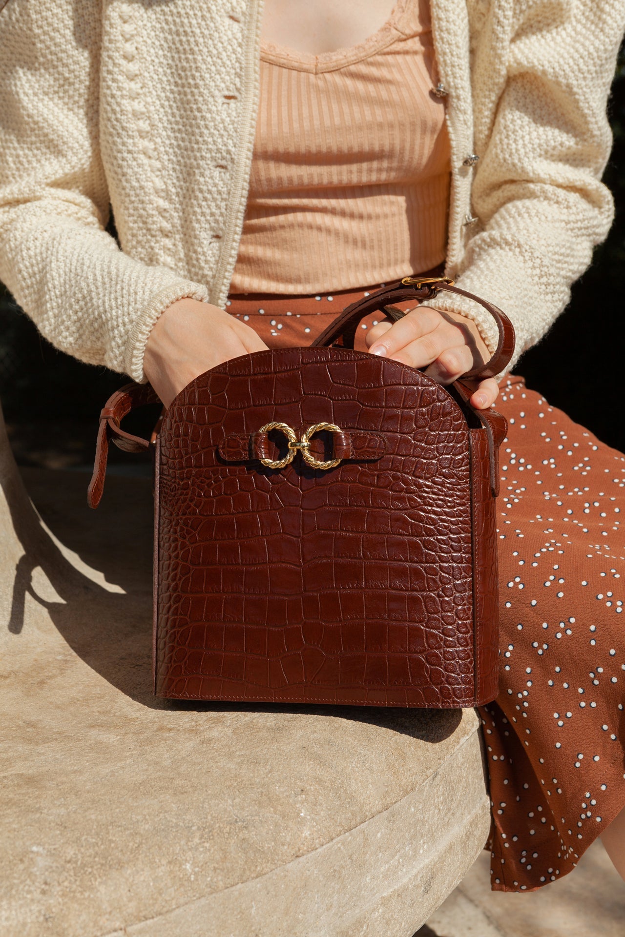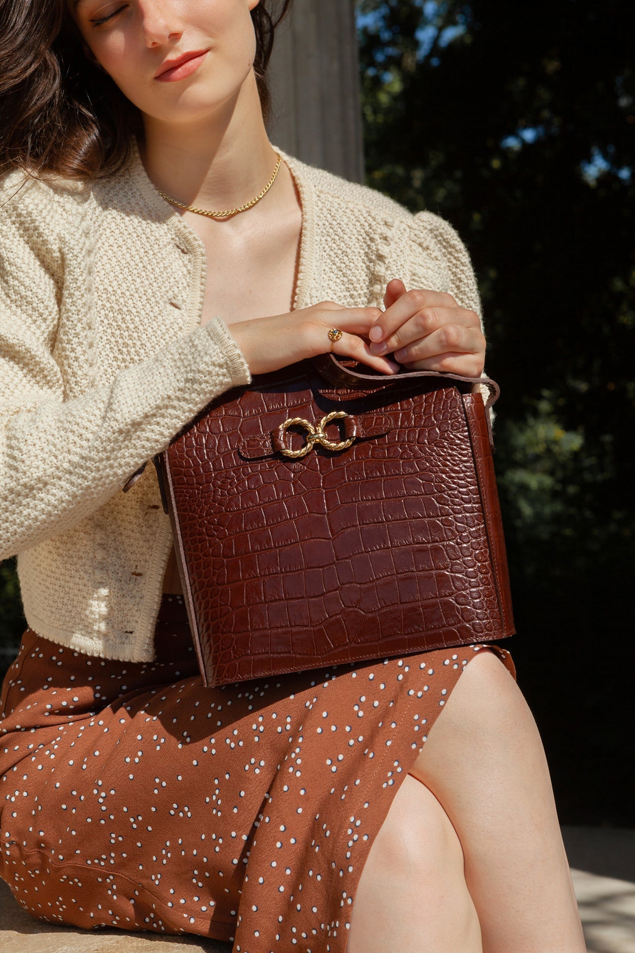 Sac en cuir de vachette embossé croco à tannage minéral et anneaux torsadés dorés à l’or