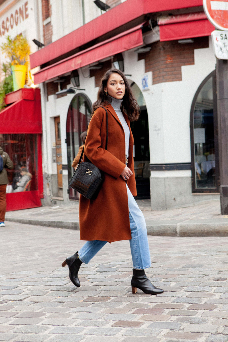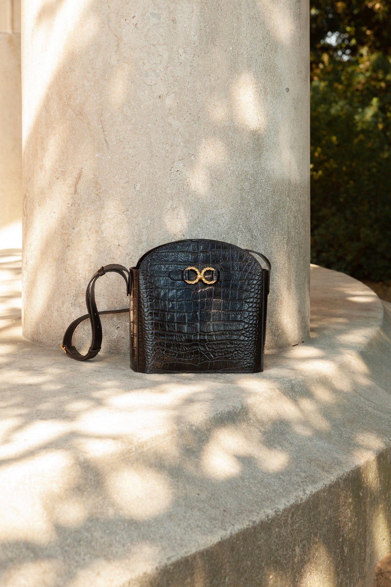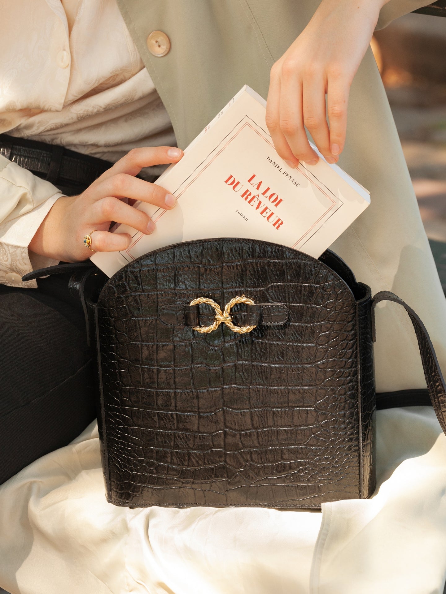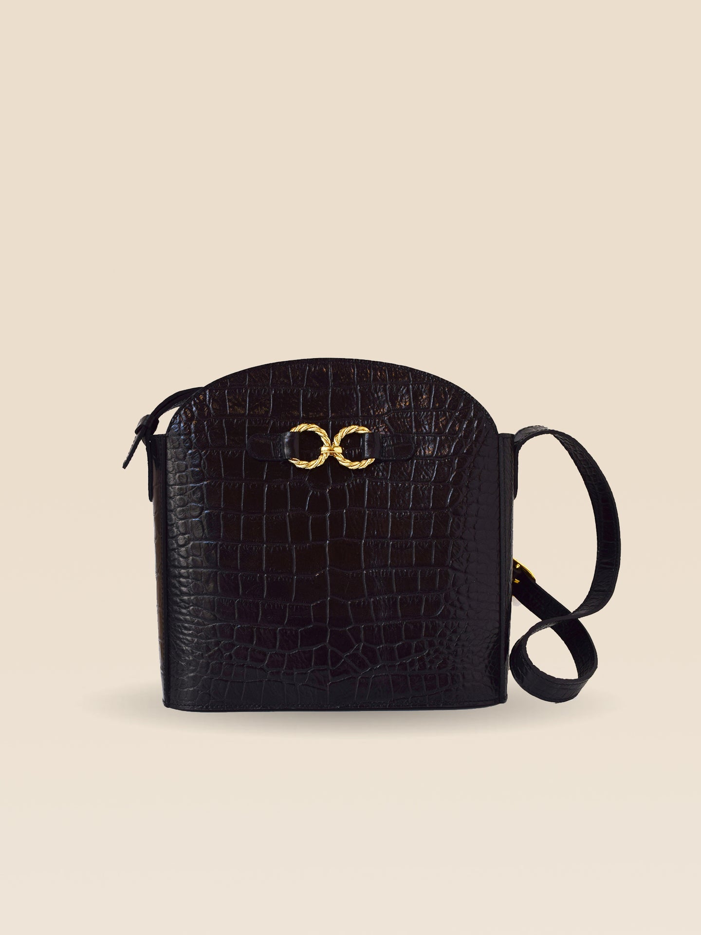 Sac en cuir de vachette embossé croco à tannage minéral et anneaux torsadés dorés à l’or