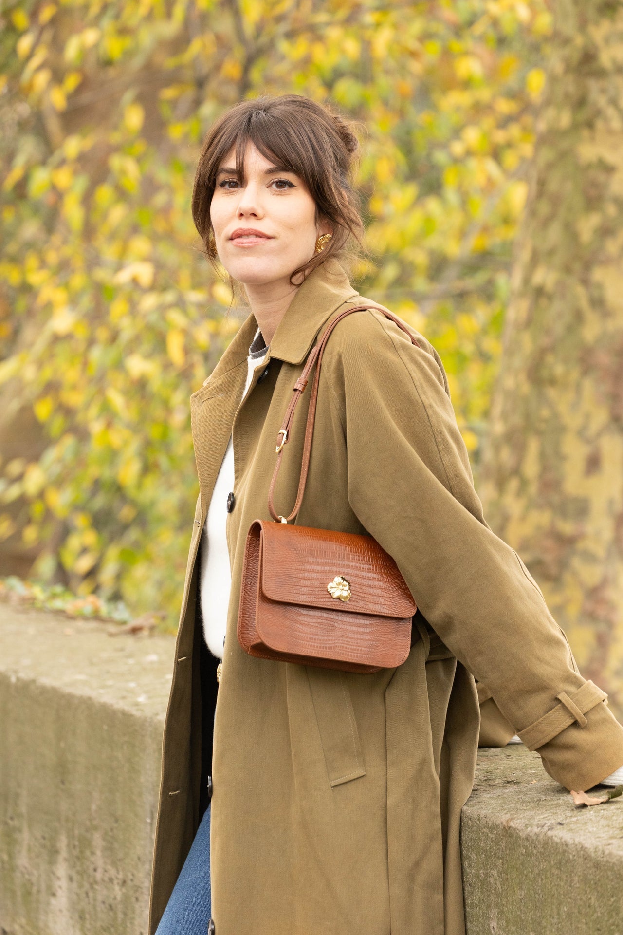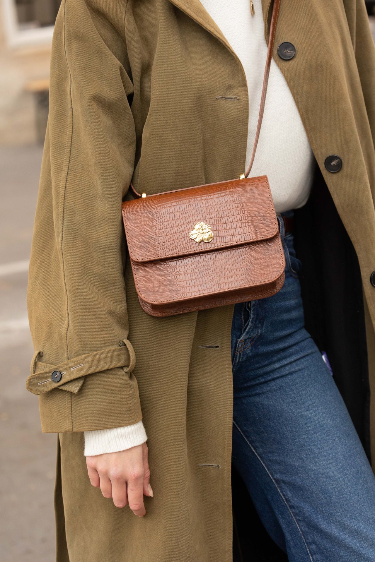 Sac en cuir de vachette embossé lézard et fleur aimantée dorée à l’or