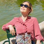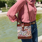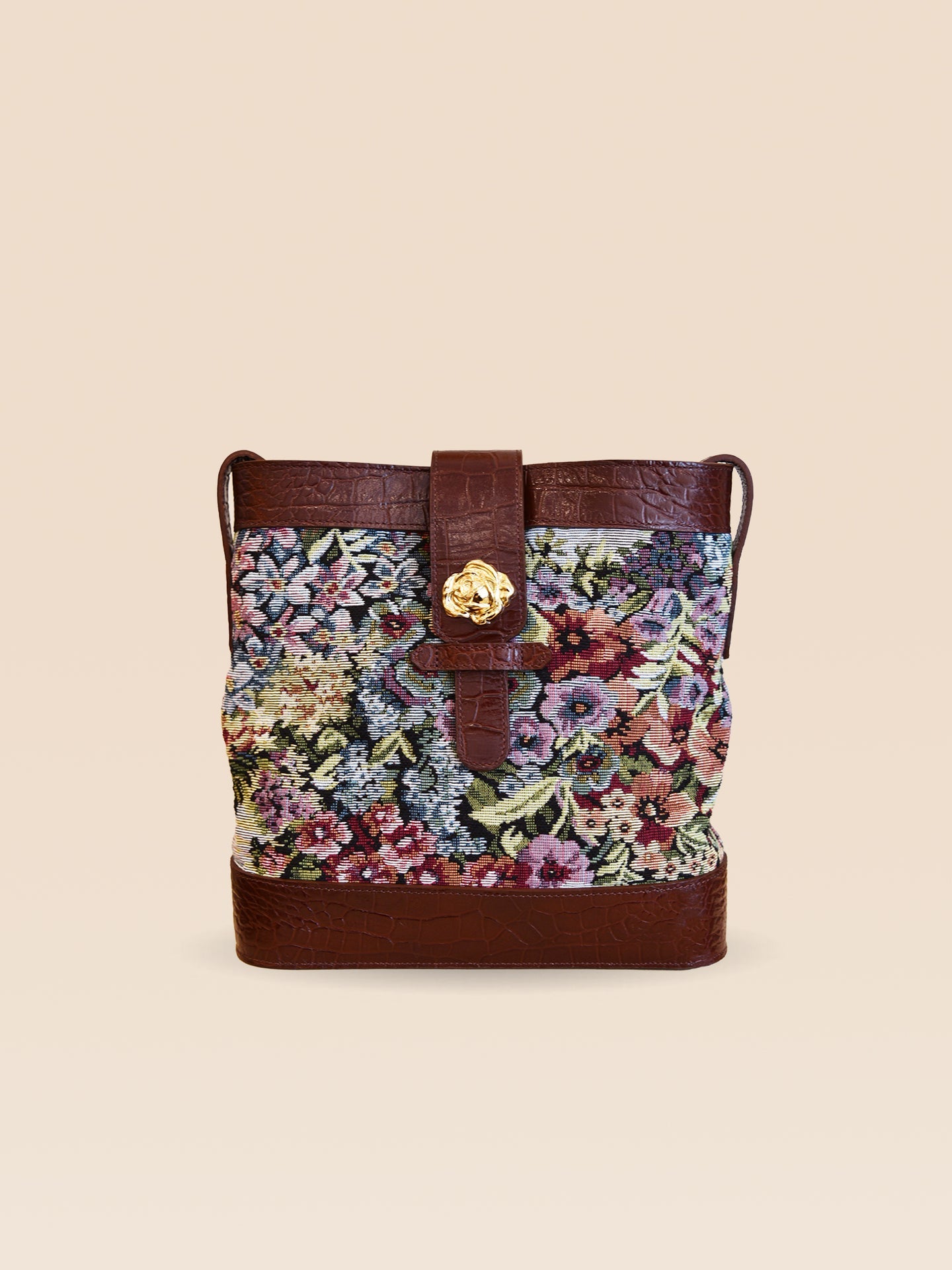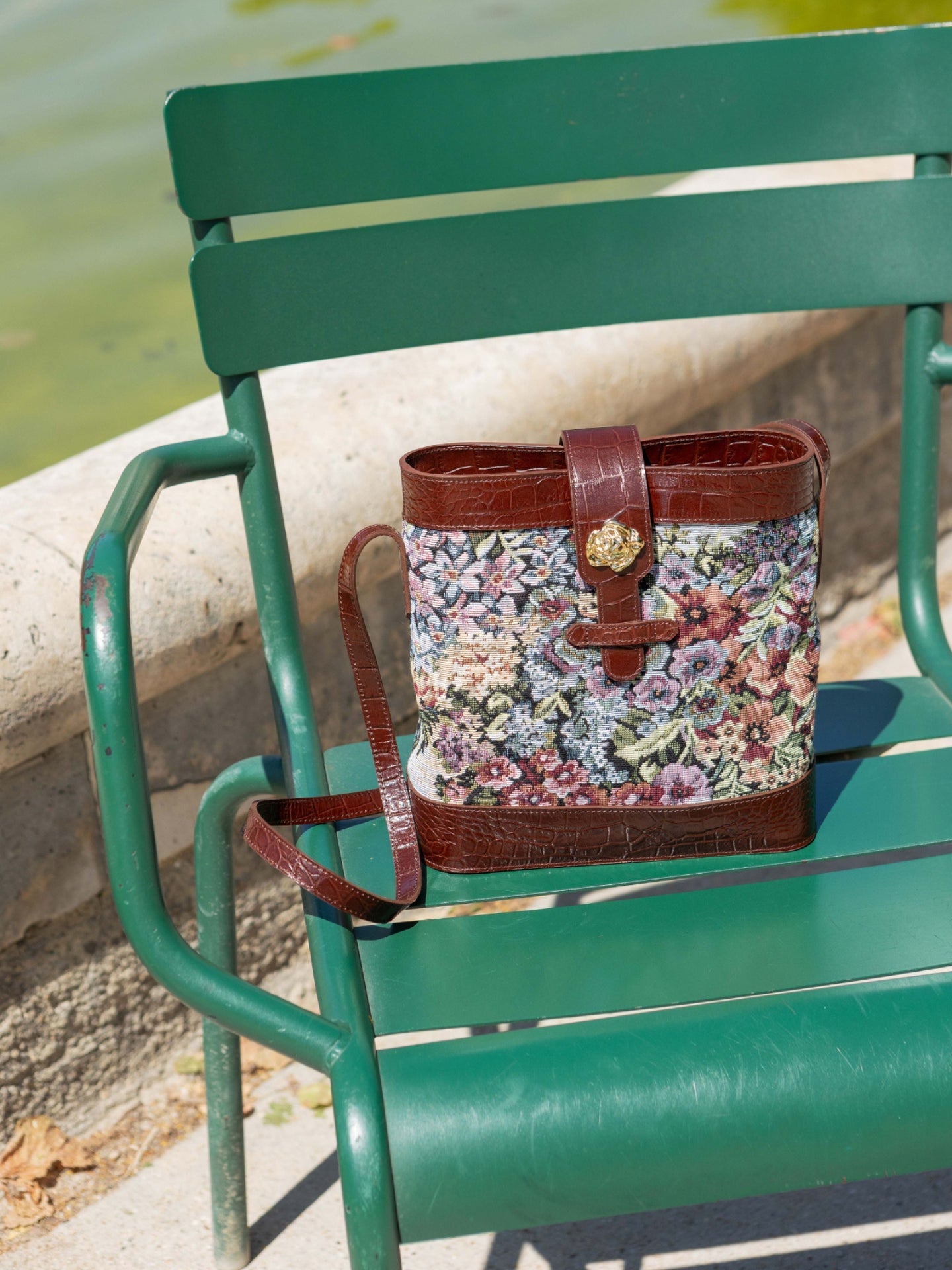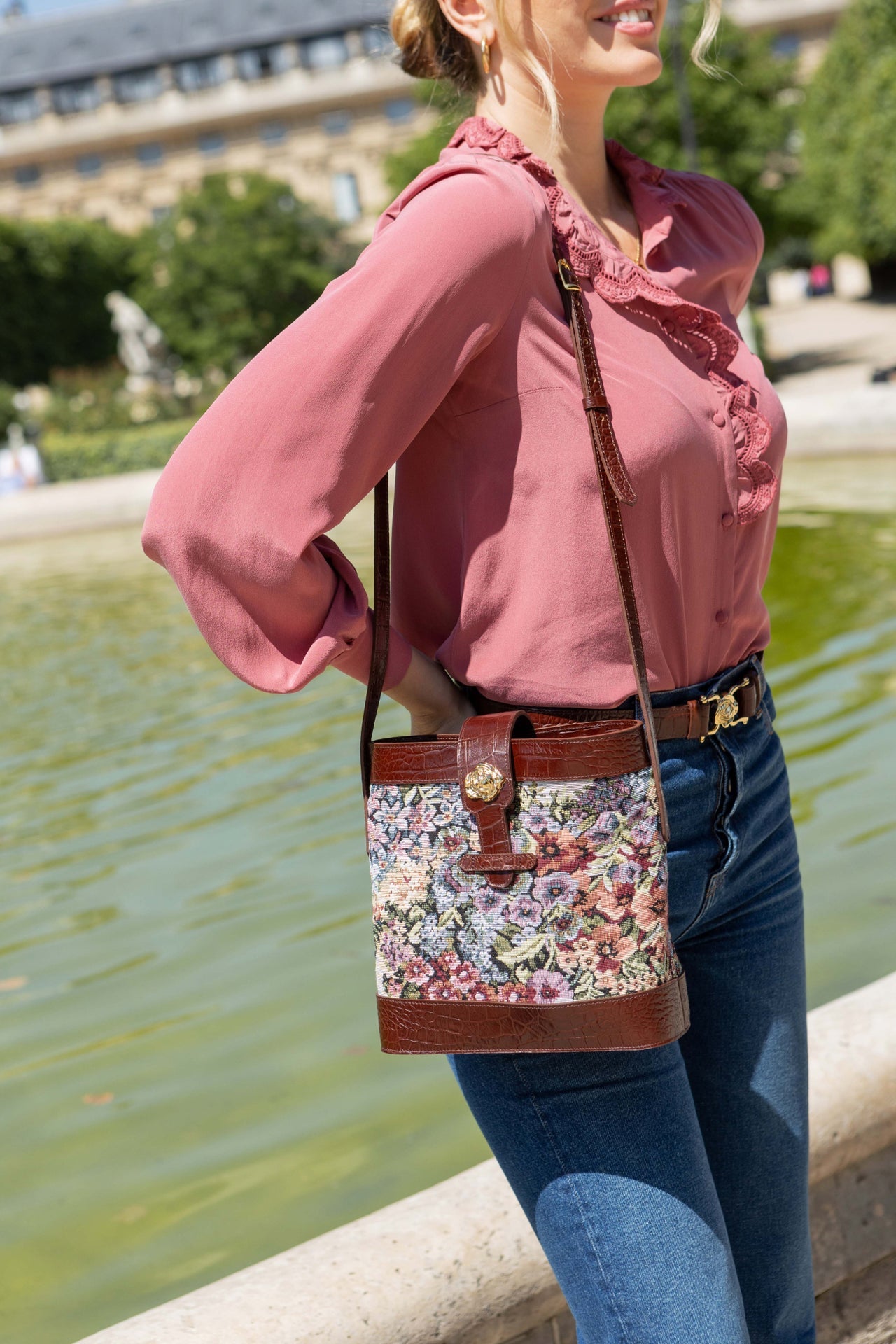 Sac souple en tissu fleuri vintage et cuir de vachette croco chocolat et rose dorée à l’or
