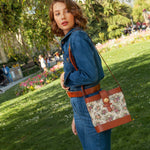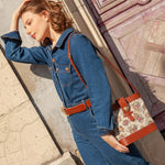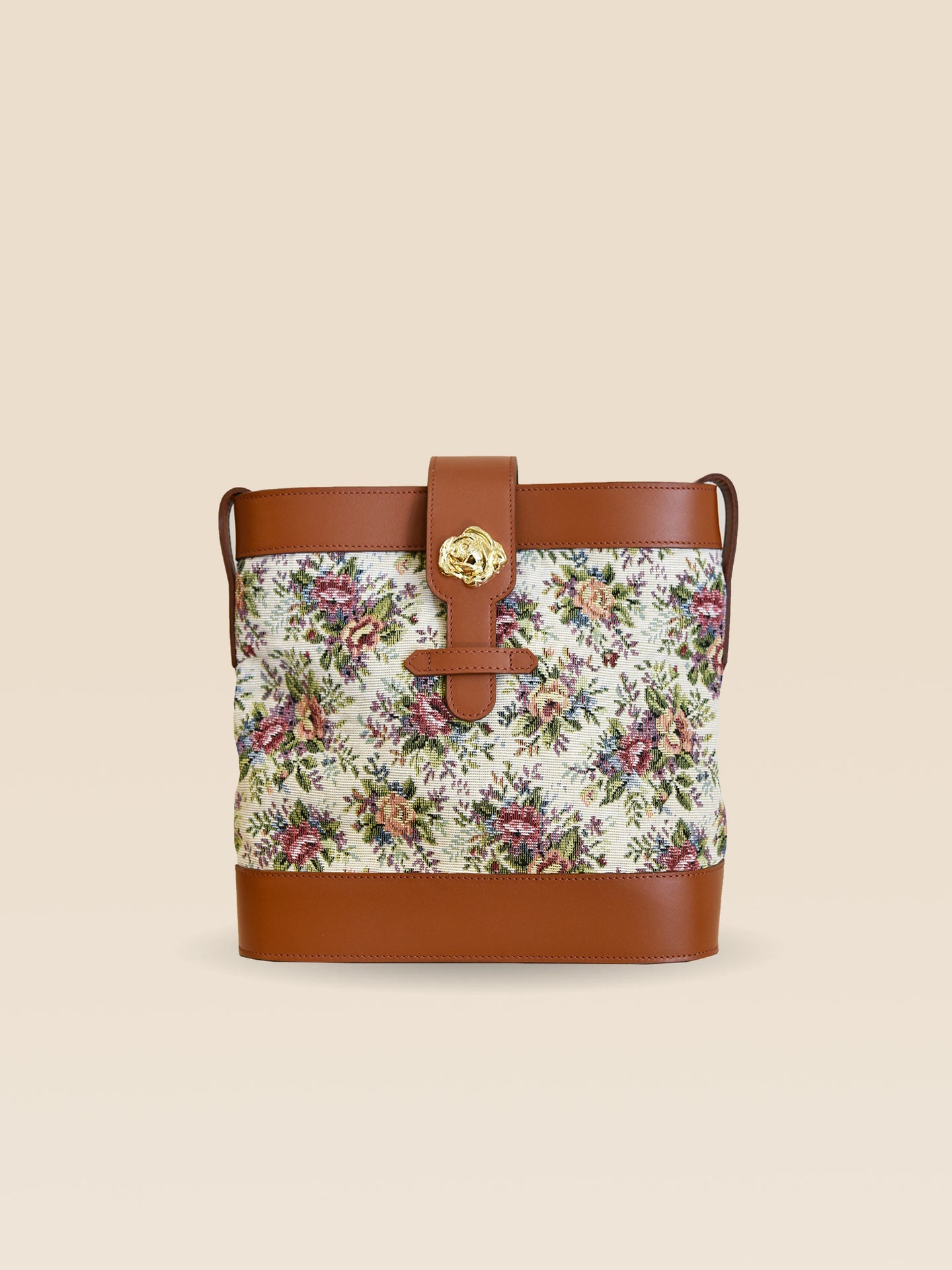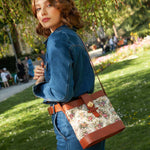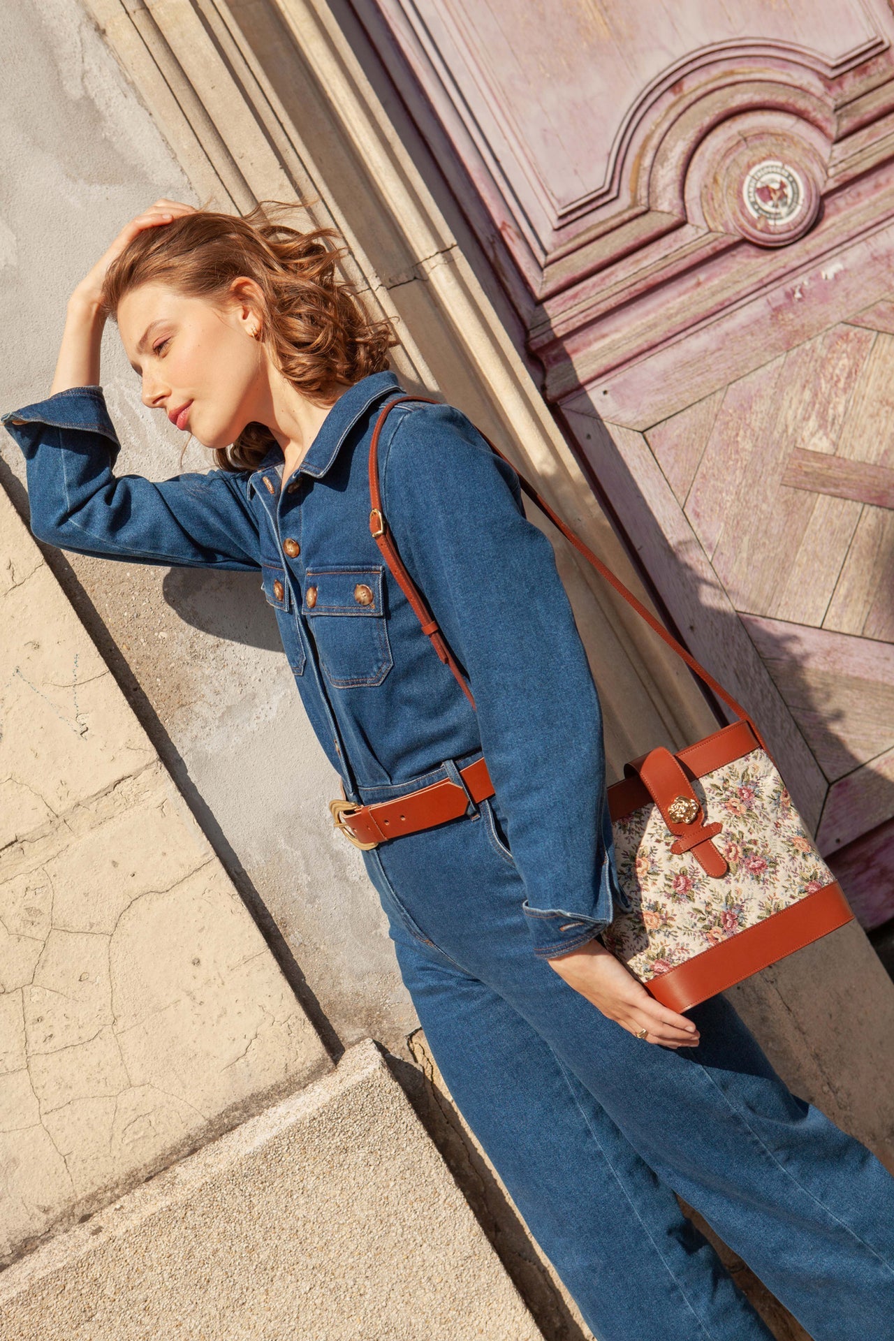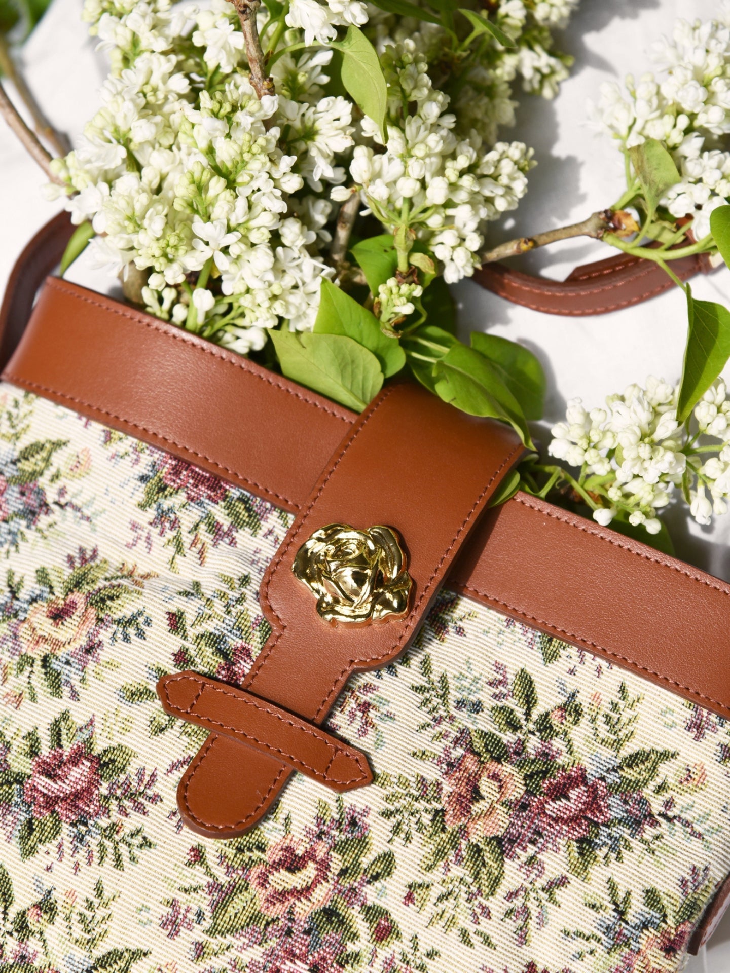 Sac souple en tissu fleuri vintage et cuir de vachette lisse camel et rose dorée à l’or