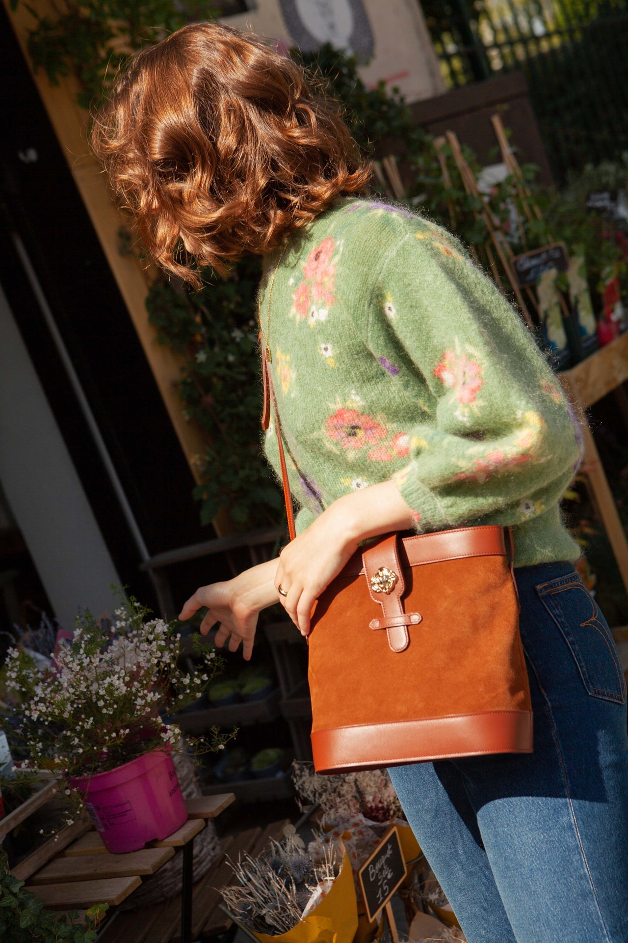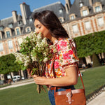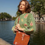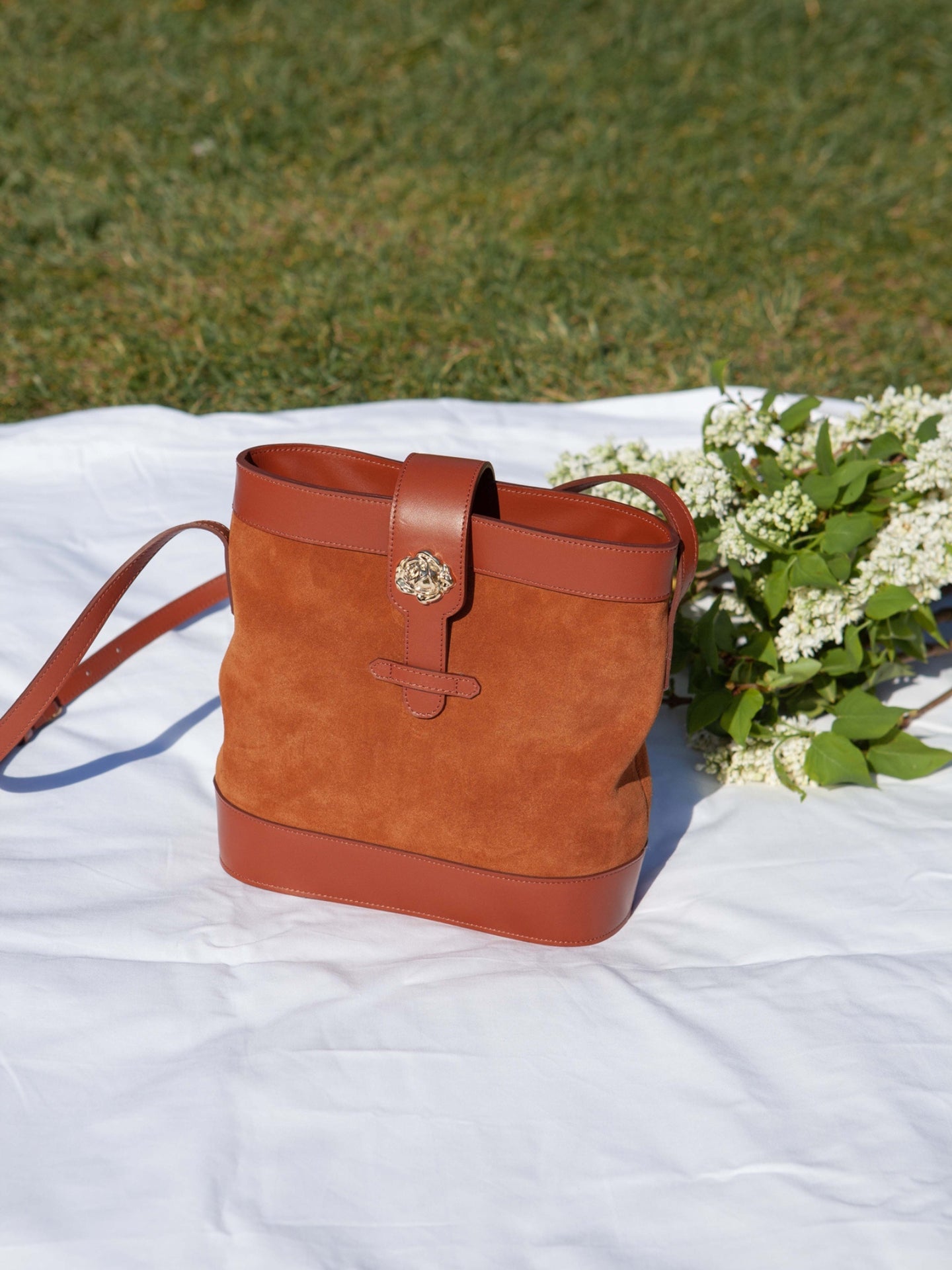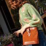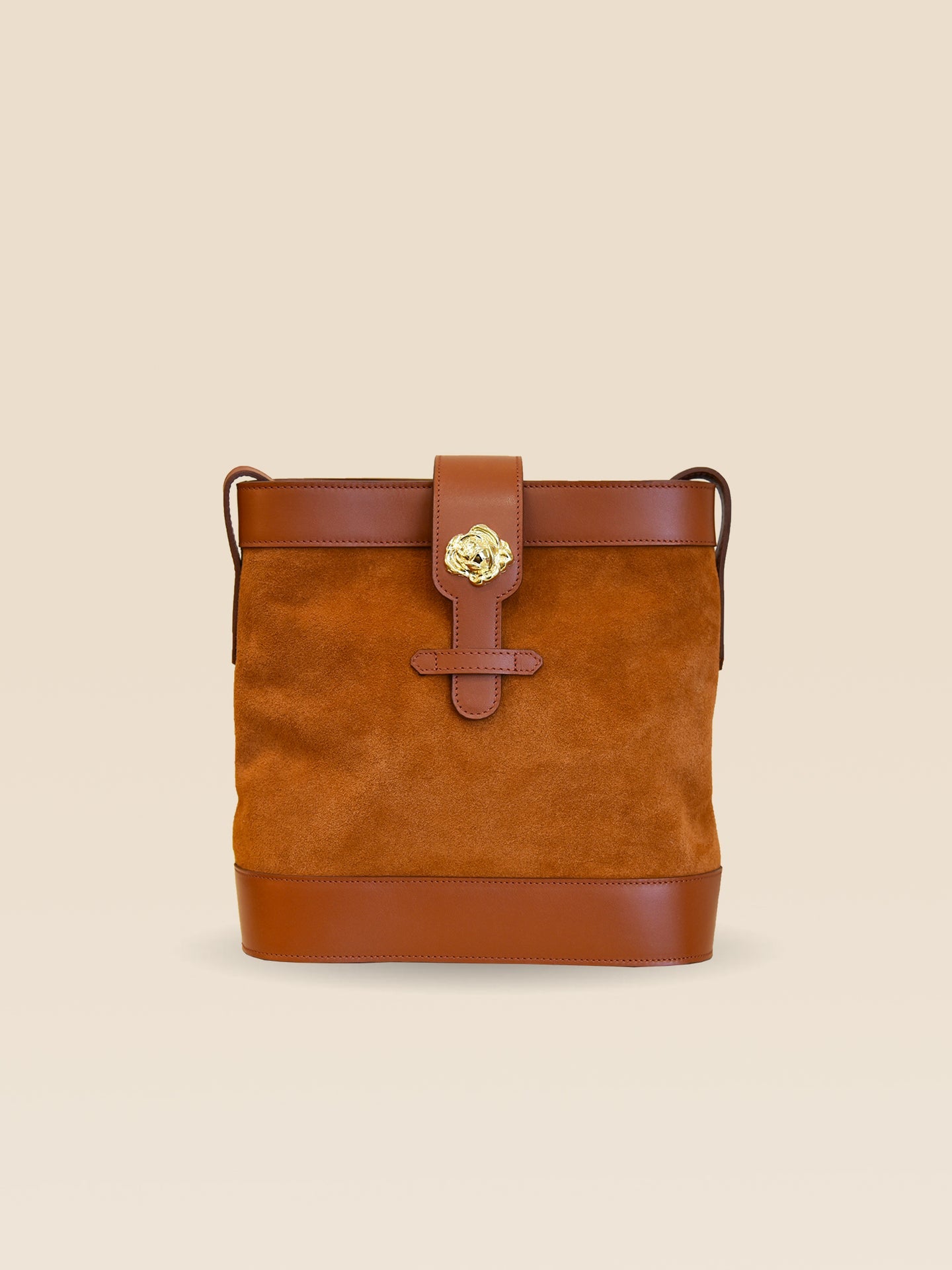 Sac souple en cuir velours camel et cuir de vachette lisse camel avec sa rose dorée à l’or