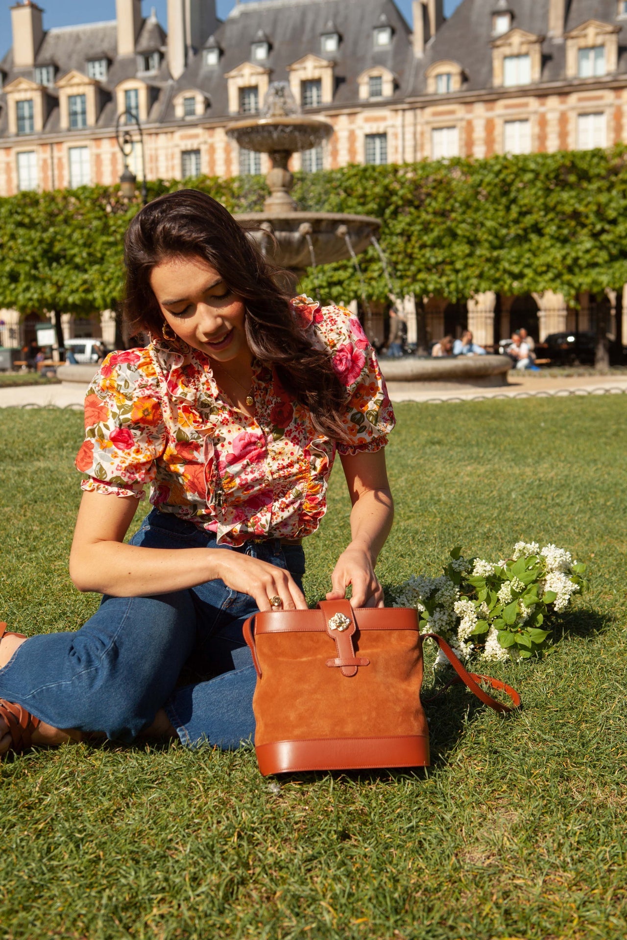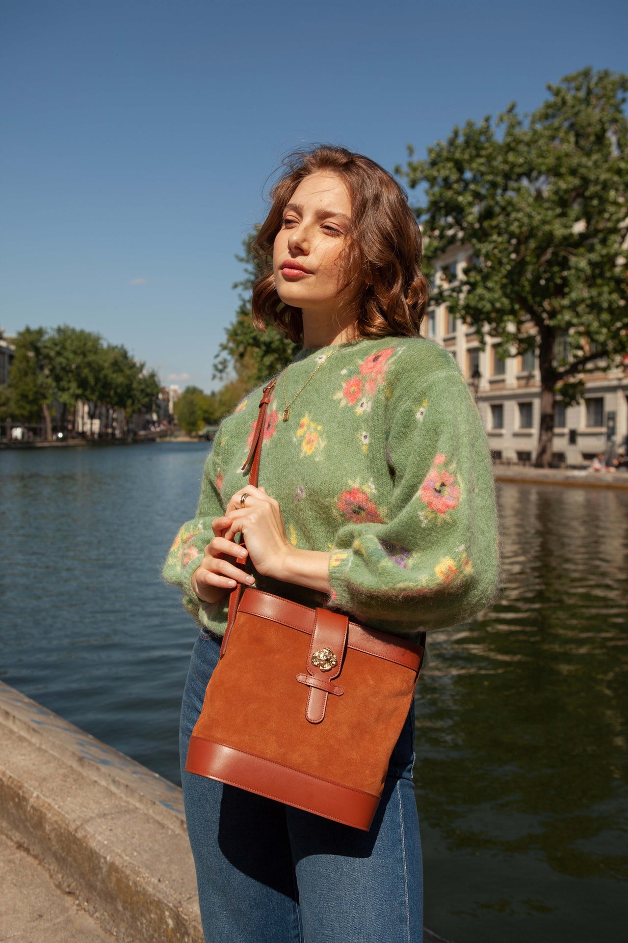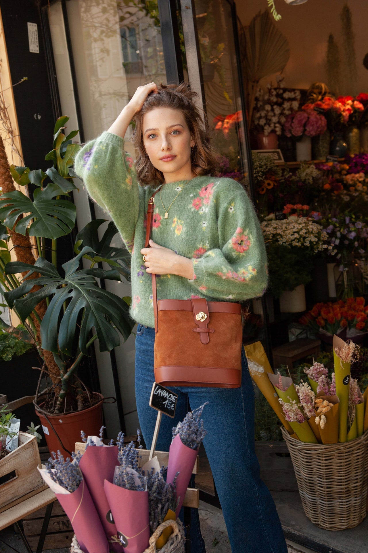 Sac souple en cuir velours camel et cuir de vachette lisse camel avec sa rose dorée à l’or