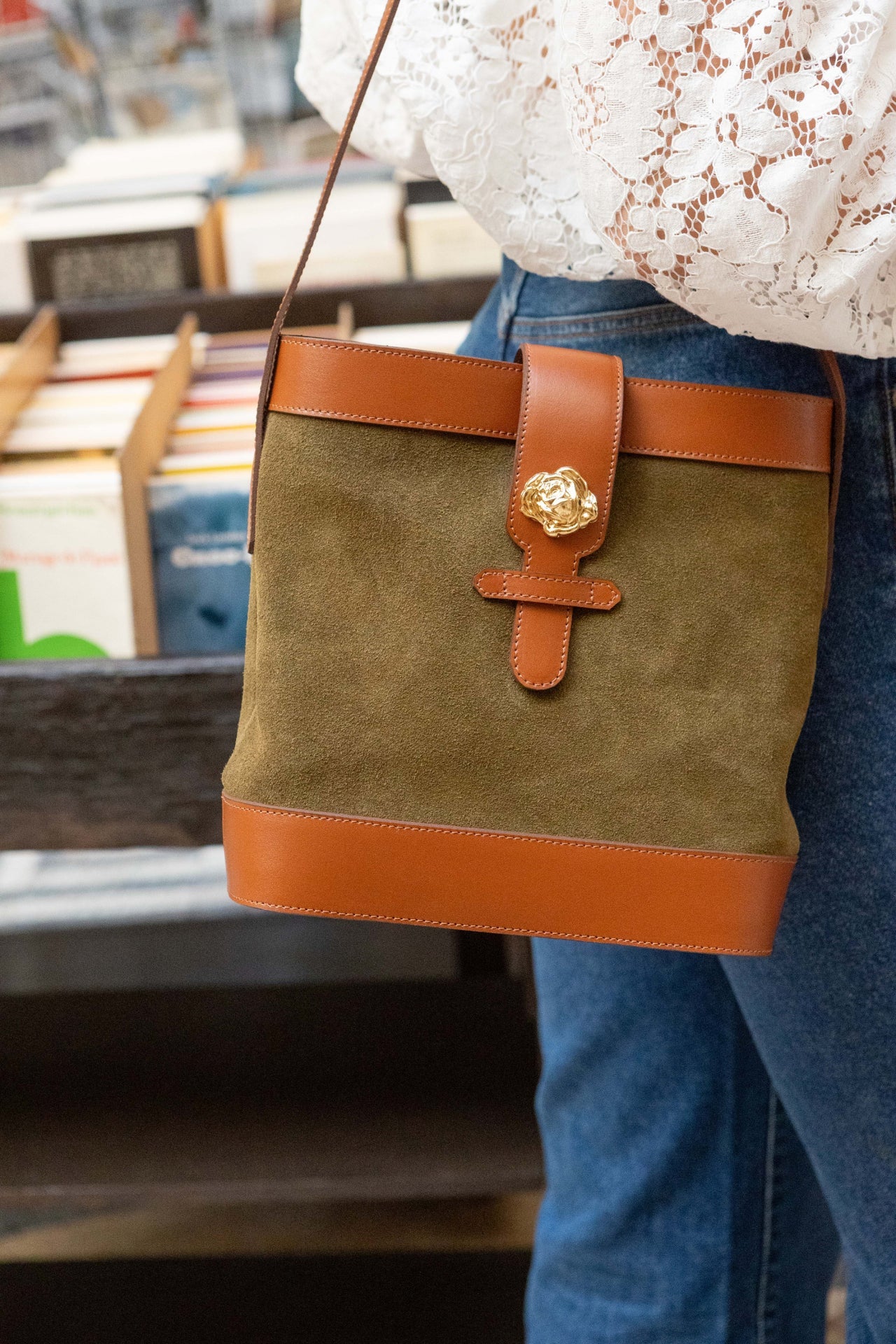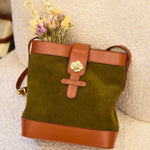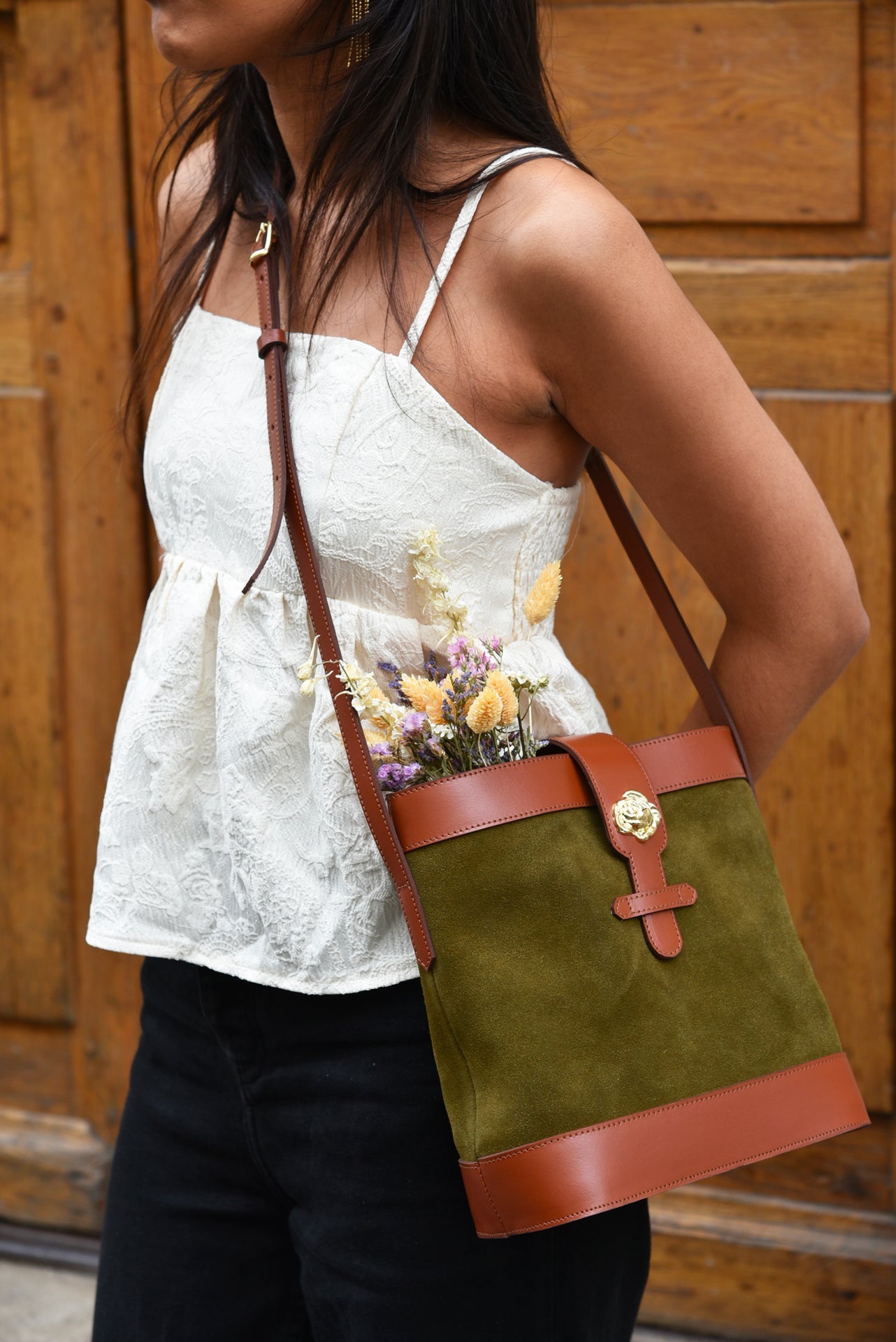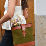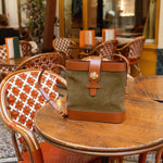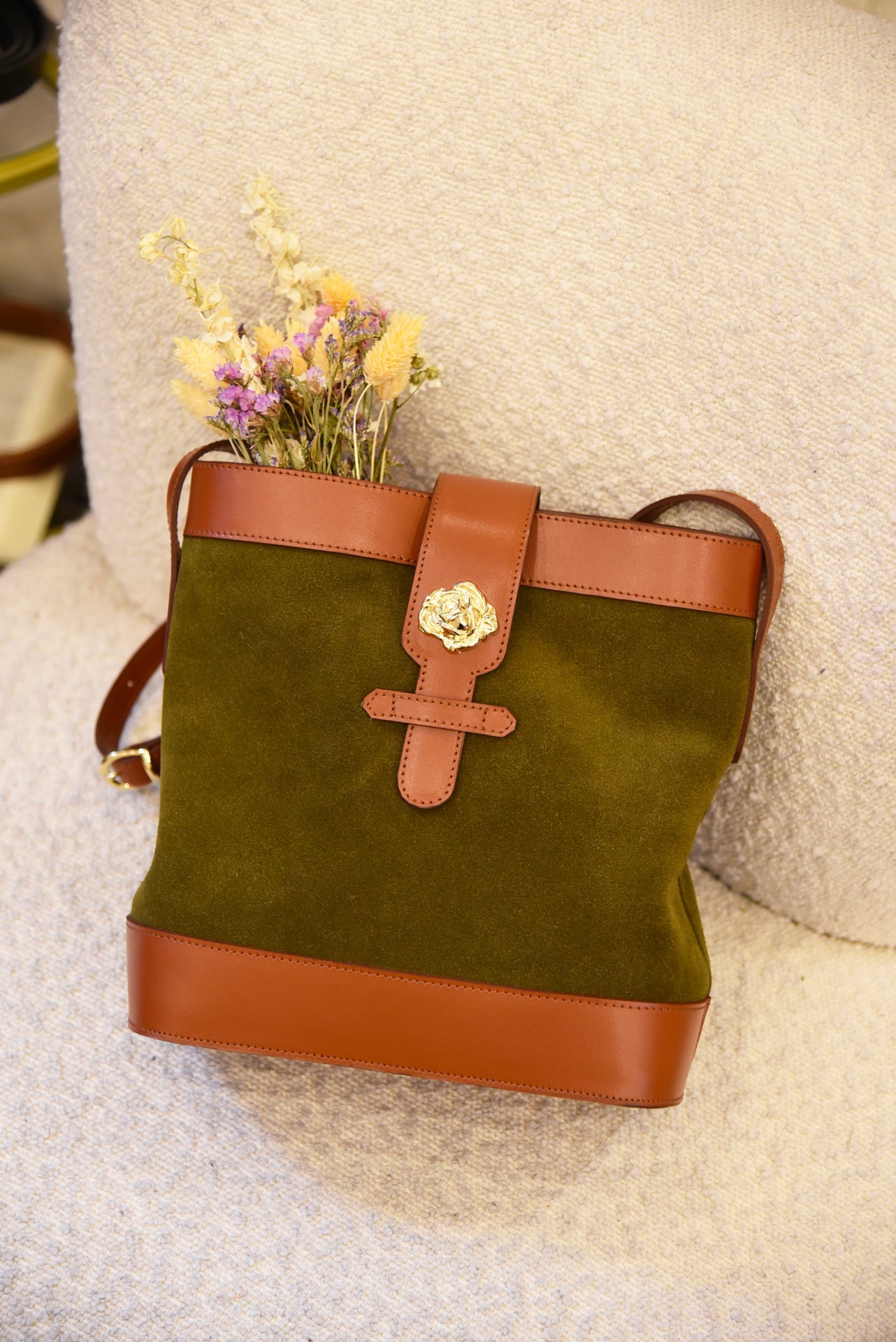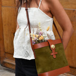 Sac souple en cuir velours olive/kaki et cuir de vachette lisse camel avec sa rose dorée à l’or