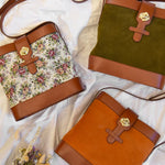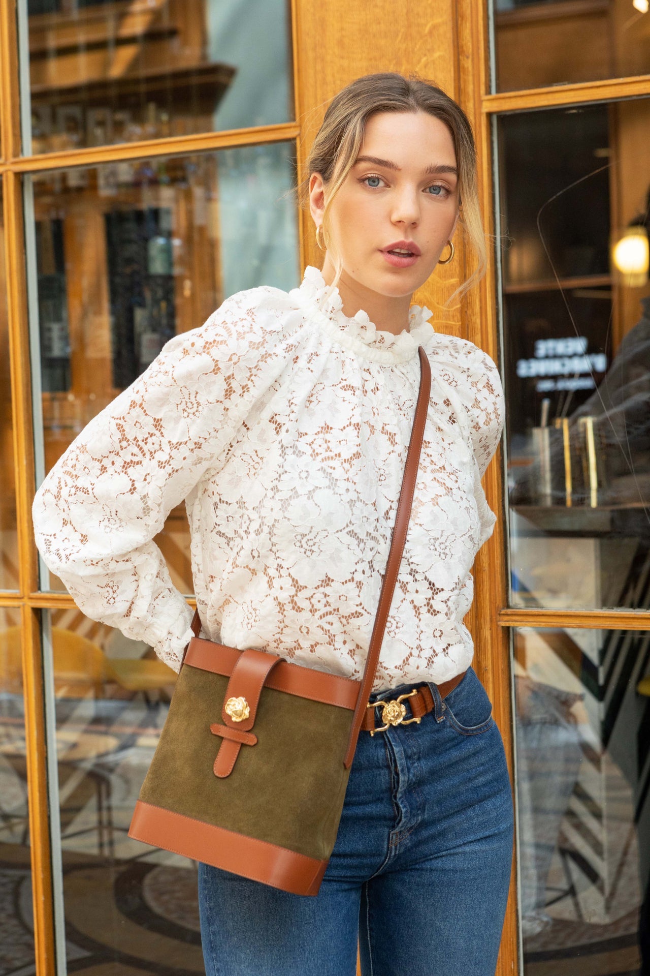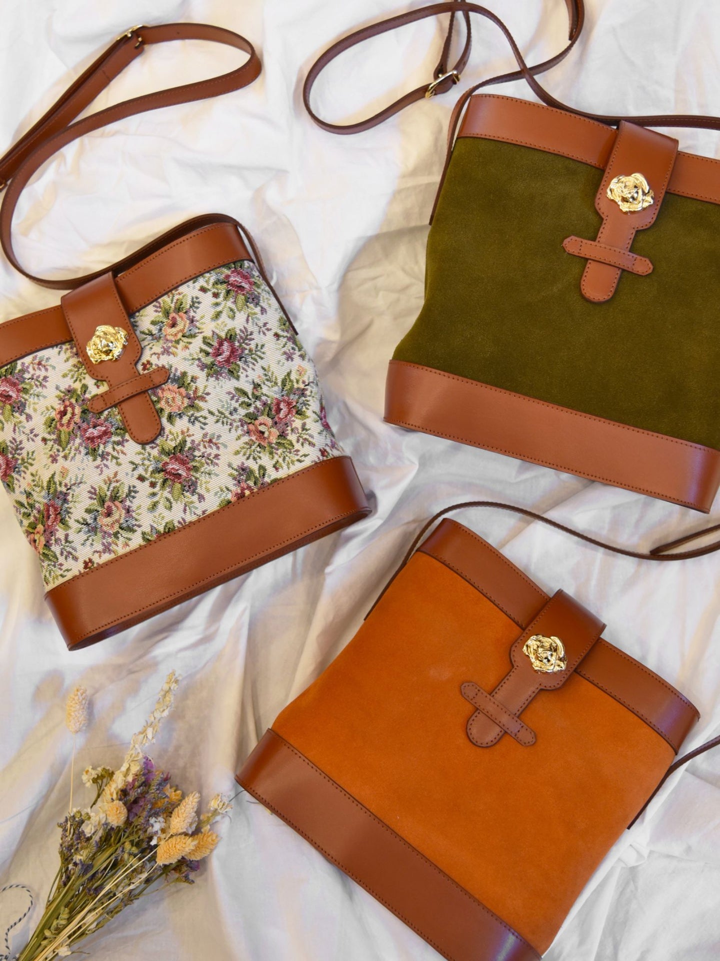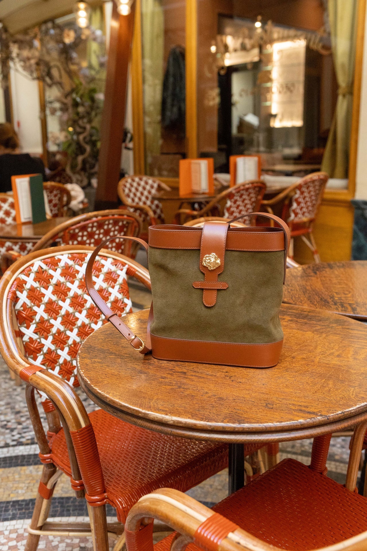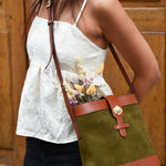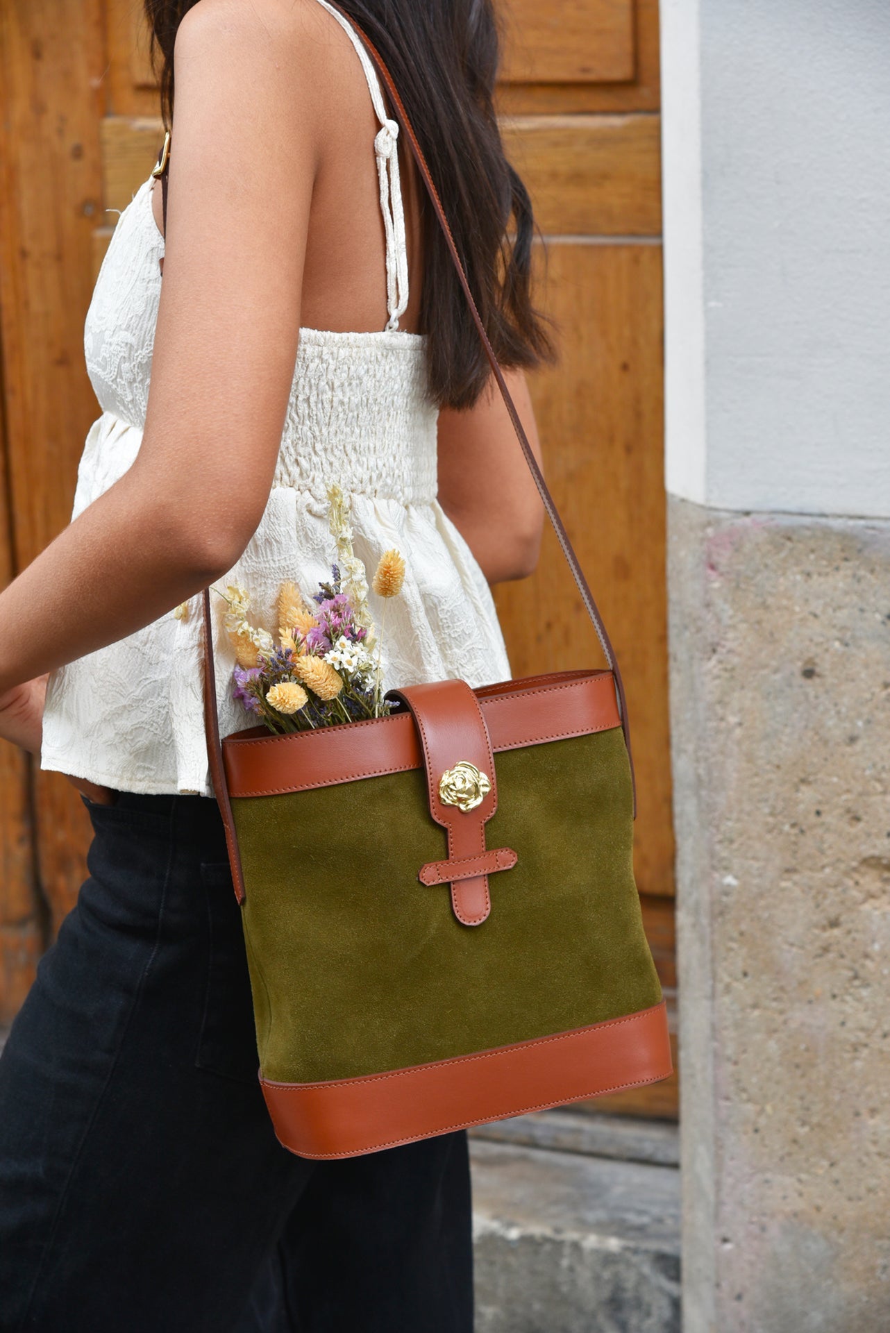 Sac souple en cuir velours olive/kaki et cuir de vachette lisse camel avec sa rose dorée à l’or