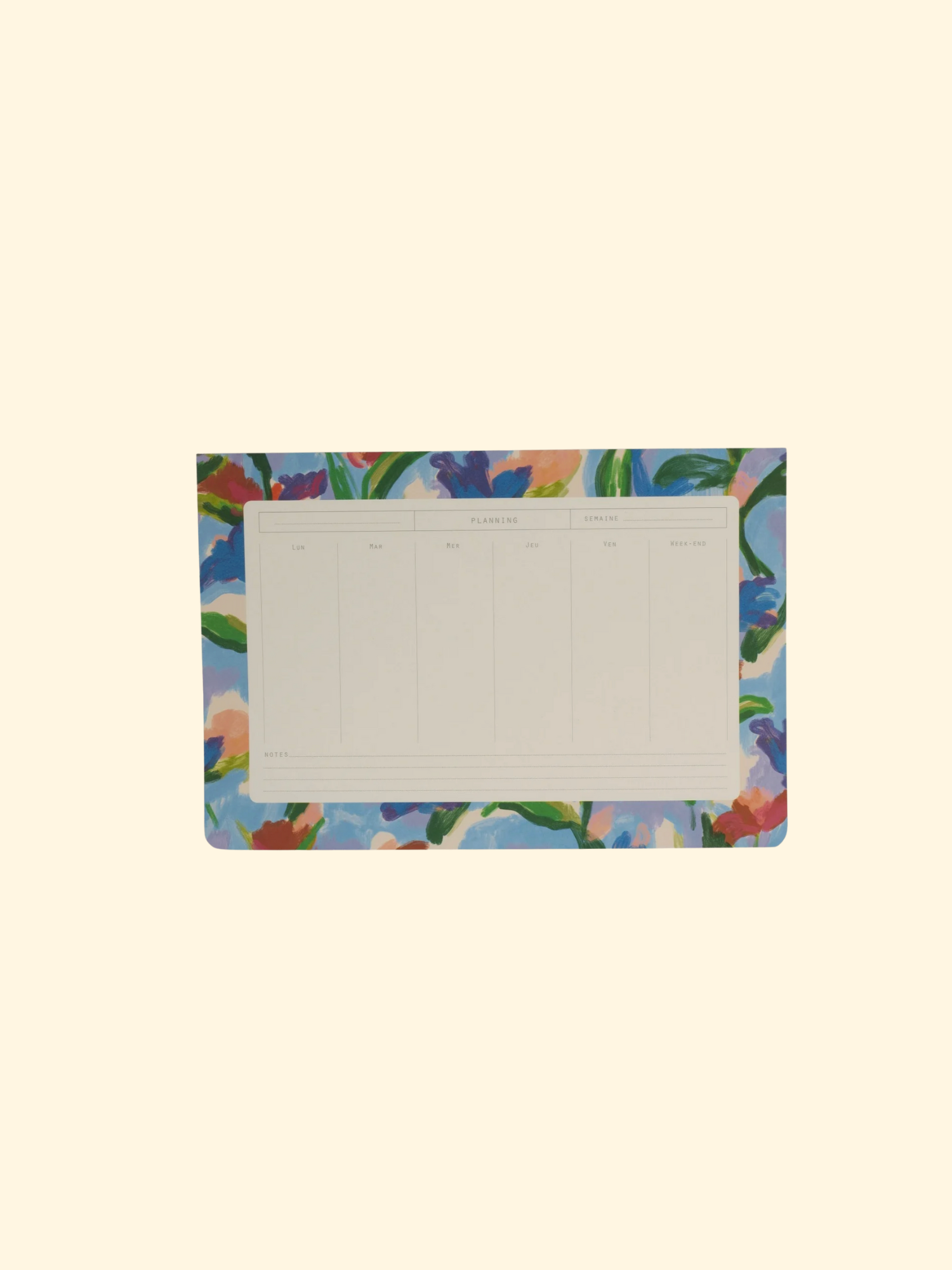Semaine après semaine, vous aurez toujours un oeil sur votre planning. Avec ses 52 pages détachables, notre semainier vous permettra de vous organiser tout au long de l'année. Avec ses grandes fleurs vibrantes et ruisselantes peintes dans une expression libre, presque abstraite, notre motif Pedro souffle le chaud et le froid entre bleus givrés, verts délavés et rouges incandescents.