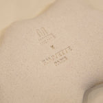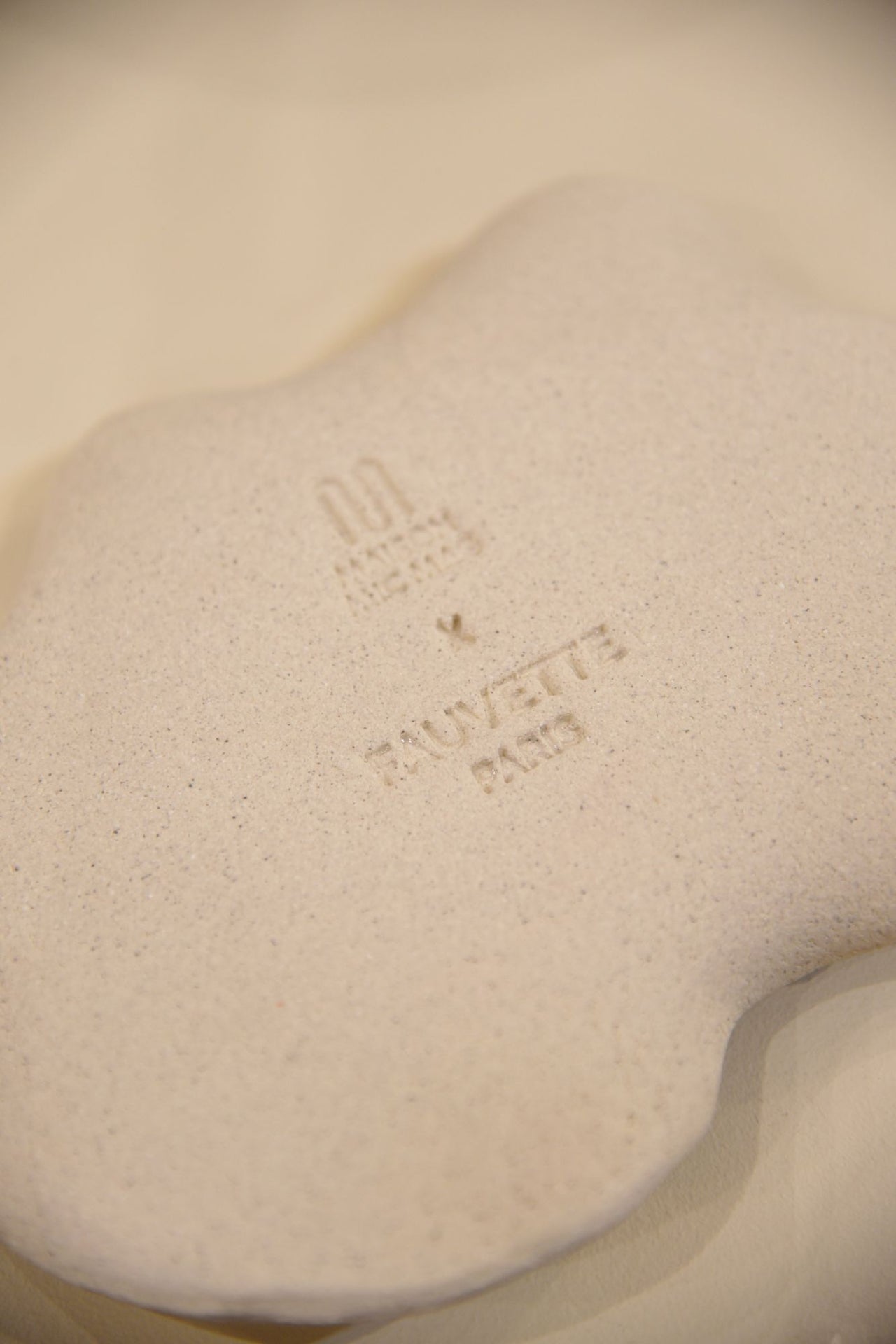 Processus de création : Le vide-poches est modelé à la main avec la technique de la plaque, il sèche ensuite 1 semaine avant une première cuisson que l'on appelle la basse température à 980° pendant 24h. Une fois la pièce cuite, il faut l'émailler avant de cuire une seconde fois à haute température à 1270° pendant 24h également. La pièce est prête au bout d'un mois de fabrication environ.